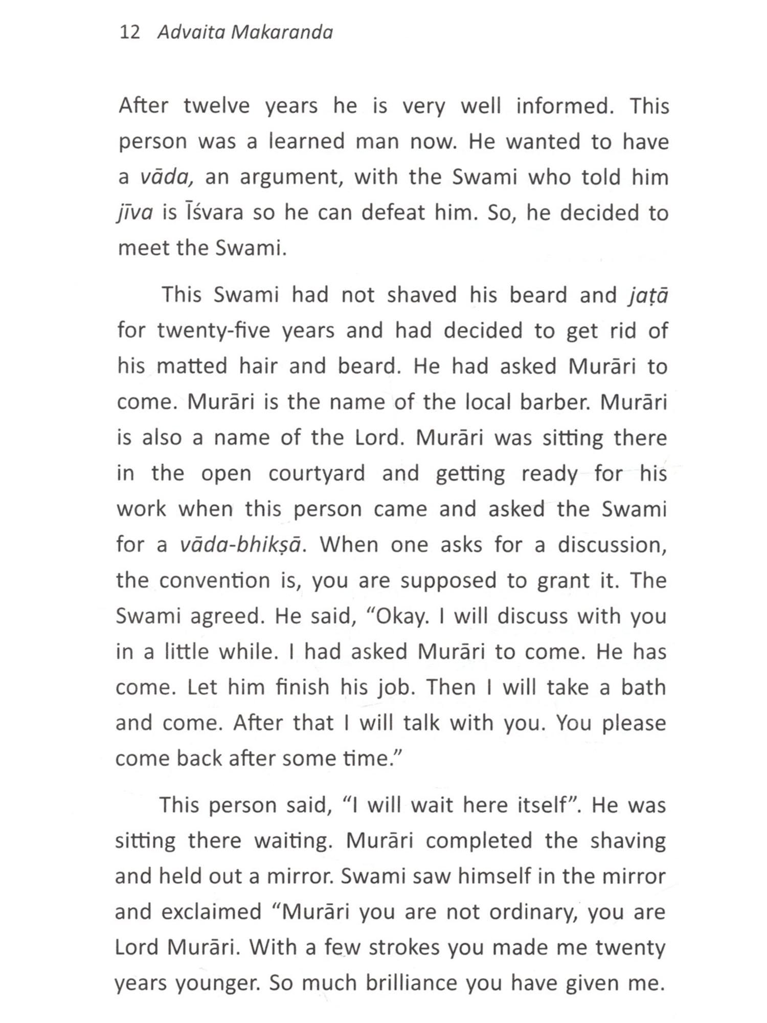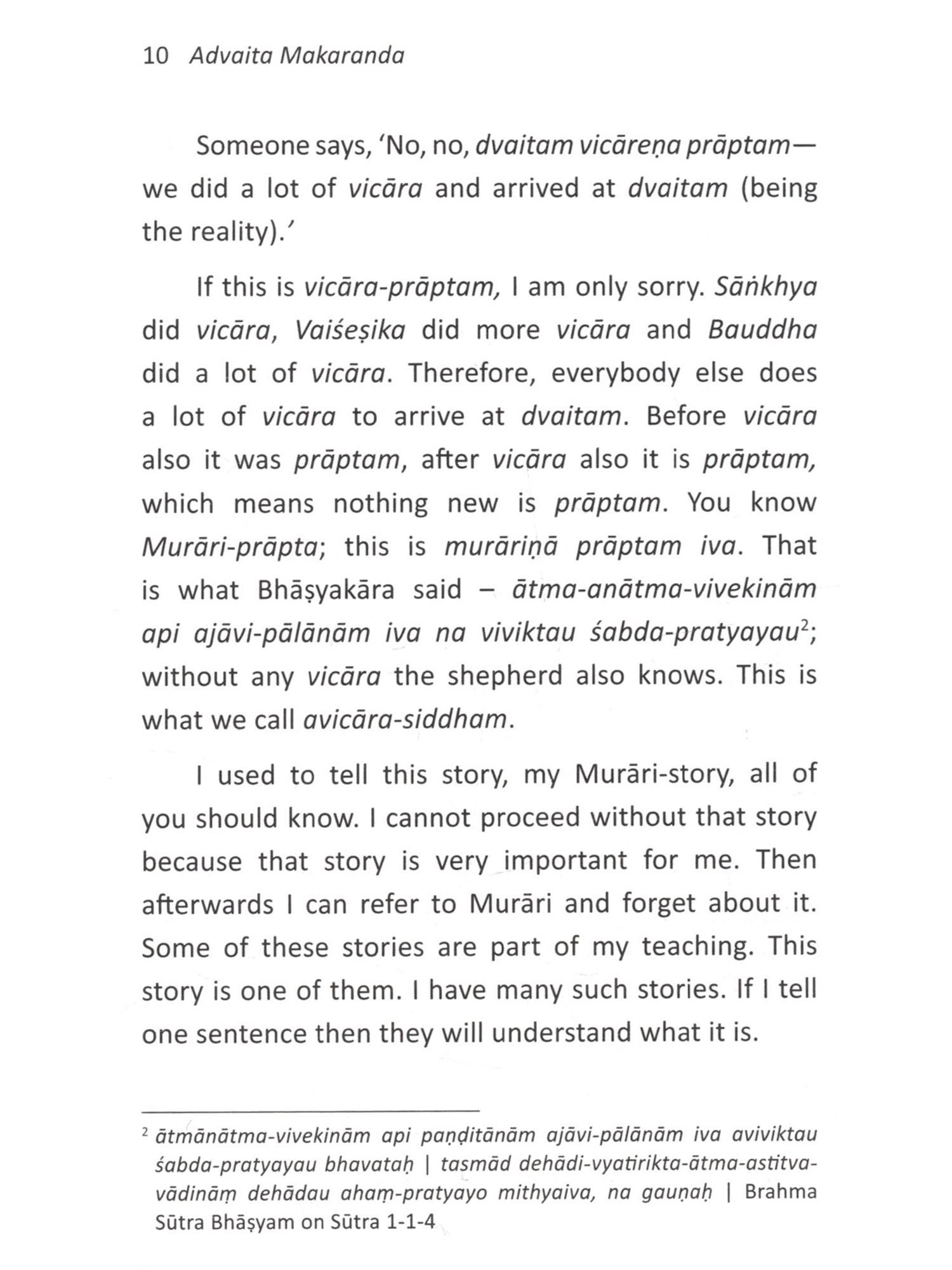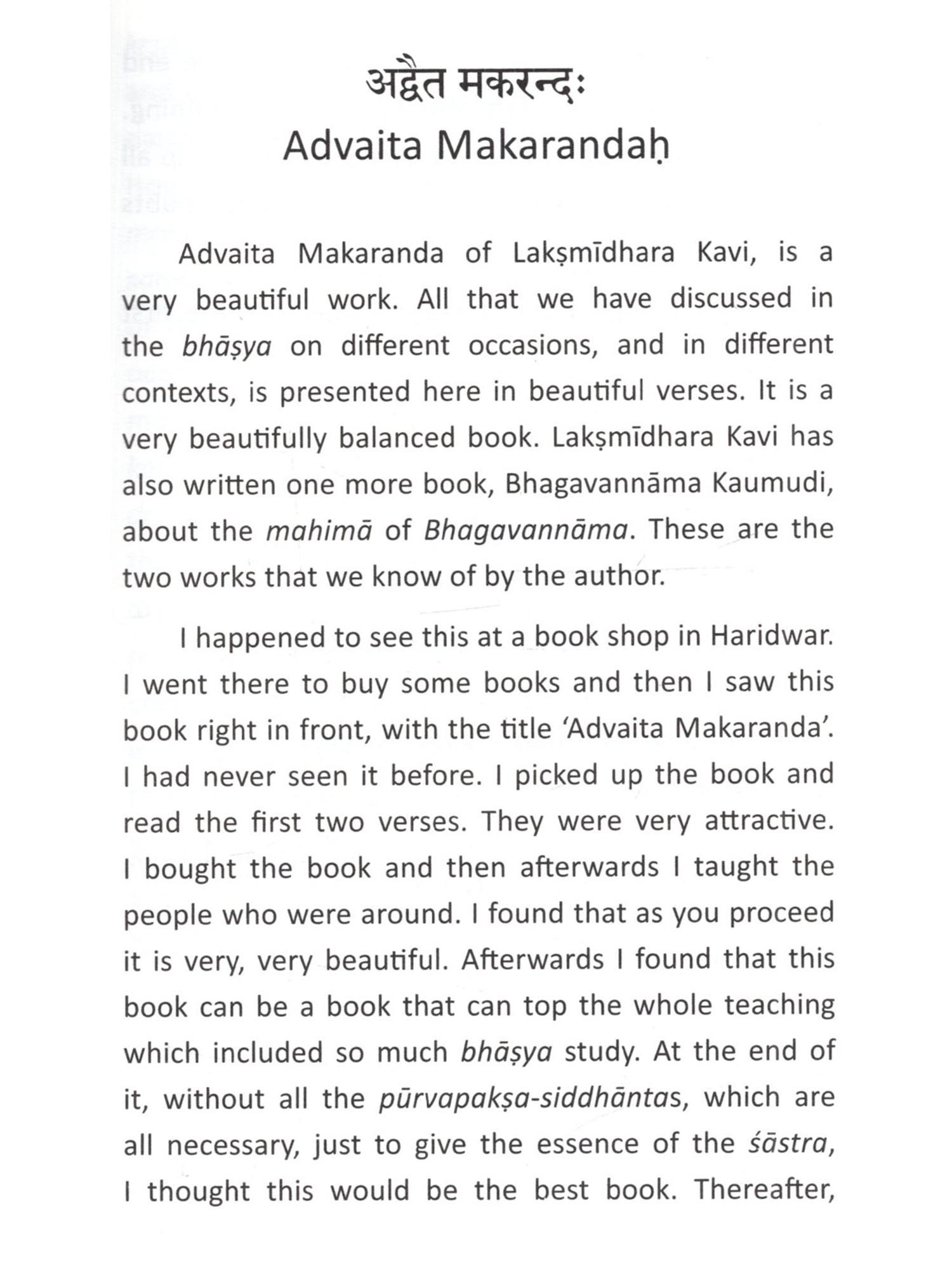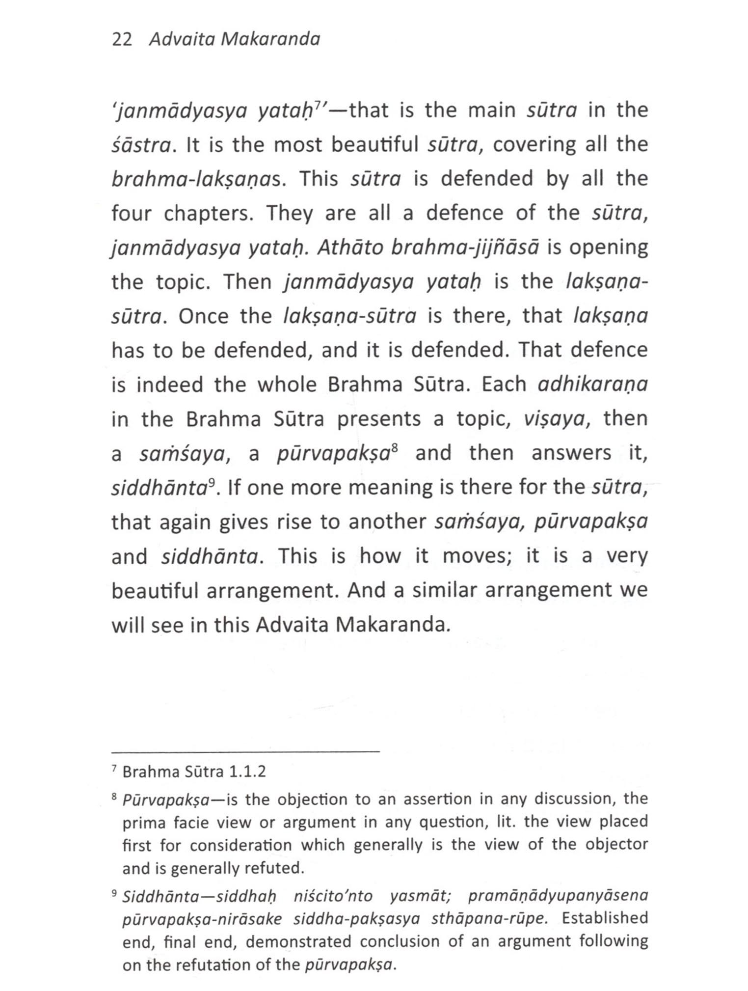Understanding of Brahman is understanding of atma as satyam jñānam anantam. There is no other understanding of Brahman. When this is unfolded by the śāstra, there are questions as to how it can be true. This whole book answers the questions to remove all obstacles to establish that I am satyam jñānam anantam brahma. That is why it is a very interesting work. There is only one thing that is said in this work, advayam brahma aham asmi. That is why it is Advaita Makaranda.