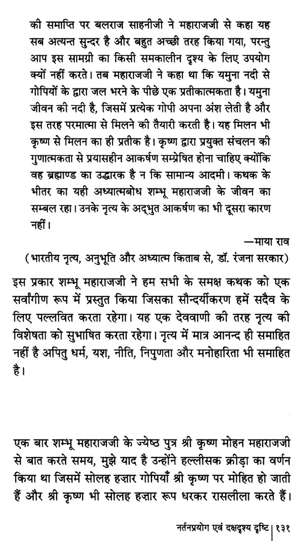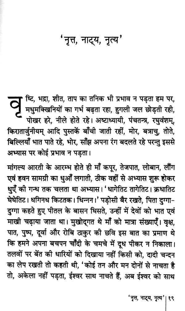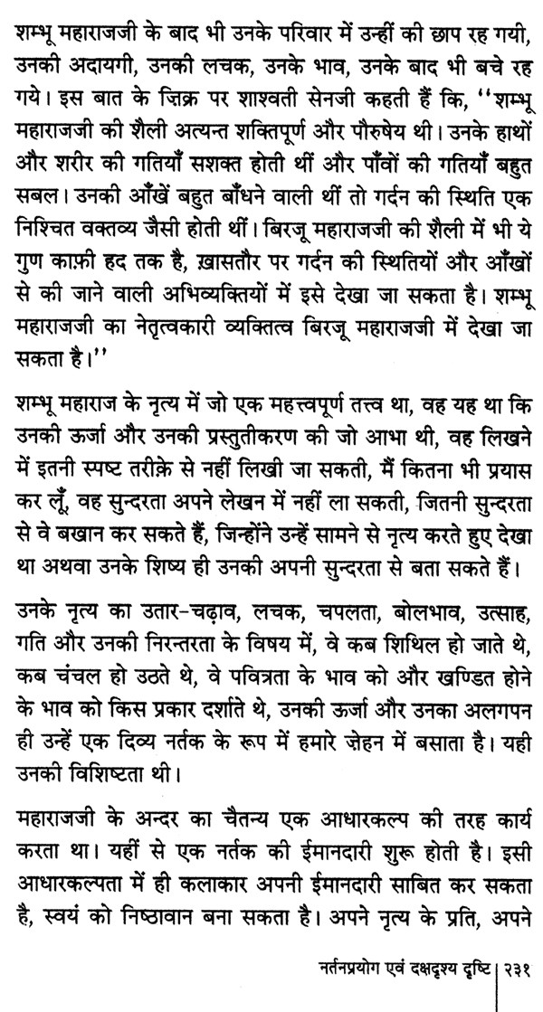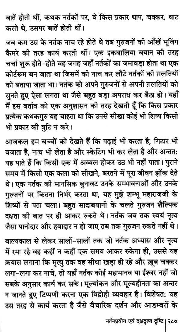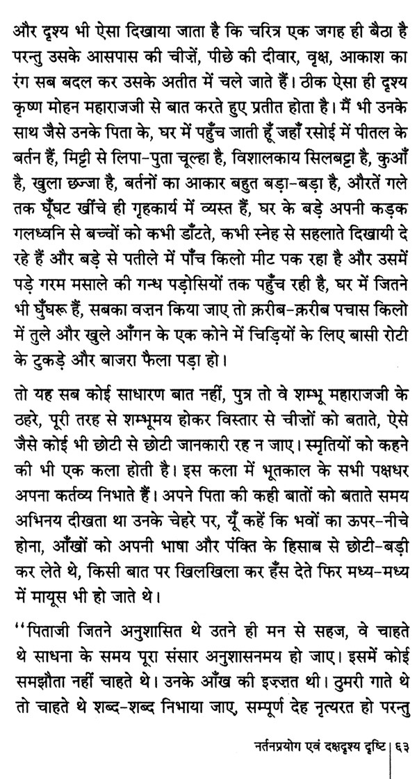 मेरा सबसे प्रिय शब्द है 'असम्भव', मेरे कपड़े पर एक छींट की तरह आ लगता है, असम्भव मुझे अँगूठा दिखाता हुआ कितना रचनात्मक लगता है, मुझसे यह असम्भव न छीना जाए। यह असम्भव मुझे अवध्य बना रहा है और साथ में हठी भी। उन दिनों शीत सितम्बर के अन्त से ही शुरू हो जाता था, अक्टूबर में हम पुलोवर पहन लेते थे। शाम को पाँच बजे से अभ्यास शुरू होता था, तब अन्य कुछ भी नहीं होता था, घुँघरू और छड़ी एकसाथ एक ही जगह पर रखे रहते थे, घुँघरू इसलिए ताकि नृत्य में रमा जा सके और छड़ी इसलिए ताकि अनुशासन में रह कर नृत्य में रमा जा सके। नृत्य में विश्वास ही मुझमें यह विश्वास भर पाया कि शम्भू महाराजजी की किताब पर कार्य किया जा सके और इसका पूर्ण रूप से श्रेय जाता है आदरणीय अशोक वाजपेयीजी और आदरणीय रश्मि वाजपेयीजी को, इनके मार्गदर्शन के बिना एक शब्द भी लिखना मेरे लिए सम्भव नहीं था। इन्होंने ही मुझे शम्भू महाराजजी के विषय में और अधिक गहराई से बताया, उनके परिवारीजनों के विषय में बताया, उनके शिष्यों के विषय में बताया, उनमें से कुछेक के फ़ोन नम्बर भी दिये। शम्भू महाराज हस्तक, भावच्छटाओं, संकल्पन, लयकारी, नृत्य, नृत्त, अभिनय, अभ्यास, संगीतात्मकता और अर्थान्तरों के एक समग्र उदाहरण हैं।