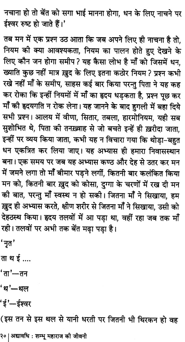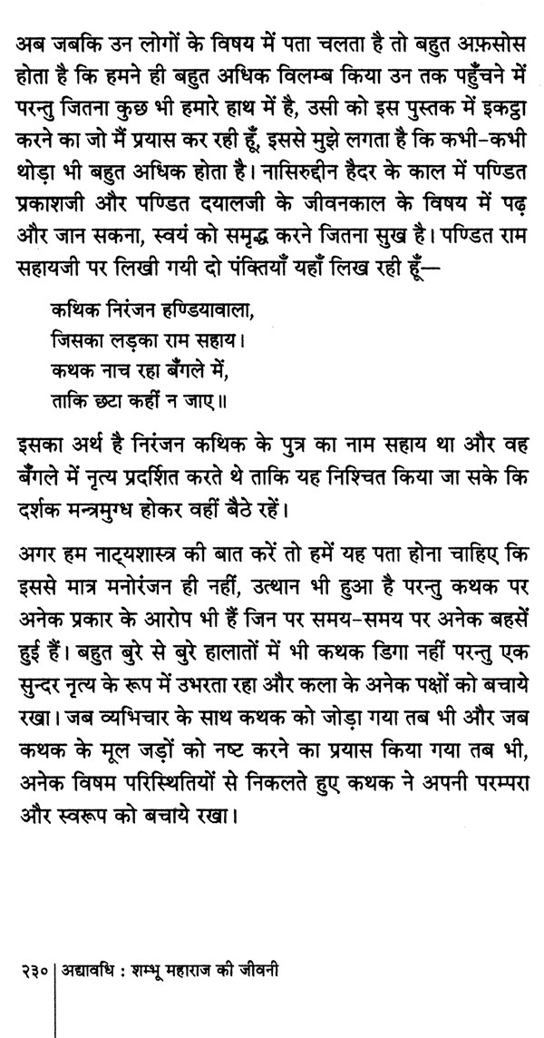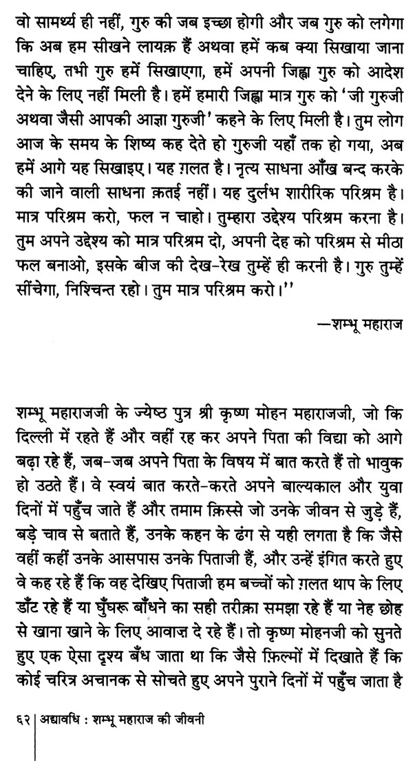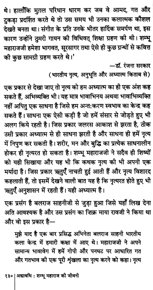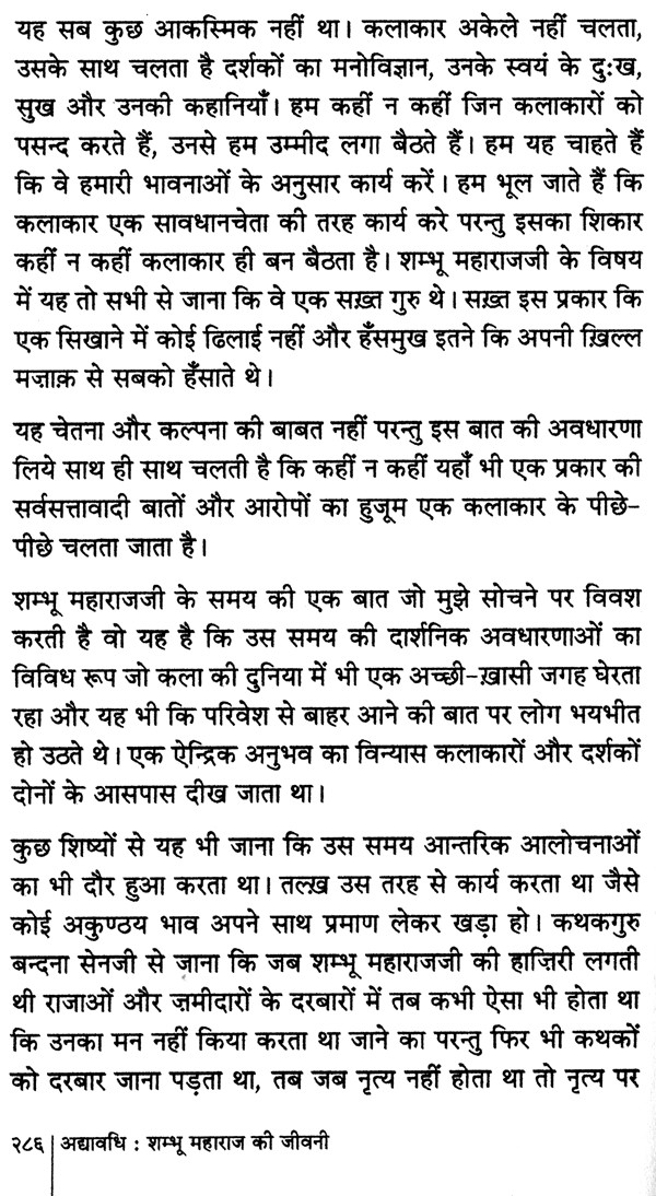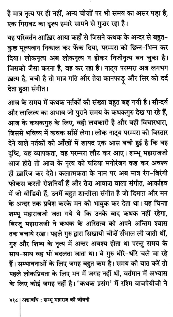 रजा फ़ाउण्डेशन पिछले कुछ वर्षों से, मुख्यतः हिन्दी में, हमारे समय के साहित्य और कलाओं के कुछ मूर्धन्यों की जीवनियाँ लिखवाने और प्रकाशित करने का एक प्रोजेक्ट चला रहा है। कवि जोशना बैनर्जी आडवानी ने कथक मूर्धन्य शम्भू महाराज की यह जीवनी मनोयोग, अध्यवसाय और अपने कथक-प्रशिक्षण का सदुपयोग करते हुए लिखी है। प्रामाणिक सामग्री का, ऐसे प्रकरणों में, अभाव सर्वविदित है पर जीवनीकार ने बहुत सारे लोगों से, उनके संस्मरणों आदि के सहारे जो जीवनी लिखी है वह संयोगवश एक मूर्धन्य कलाकार और गुरु पर पहली प्रामाणिक पुस्तक भी है।