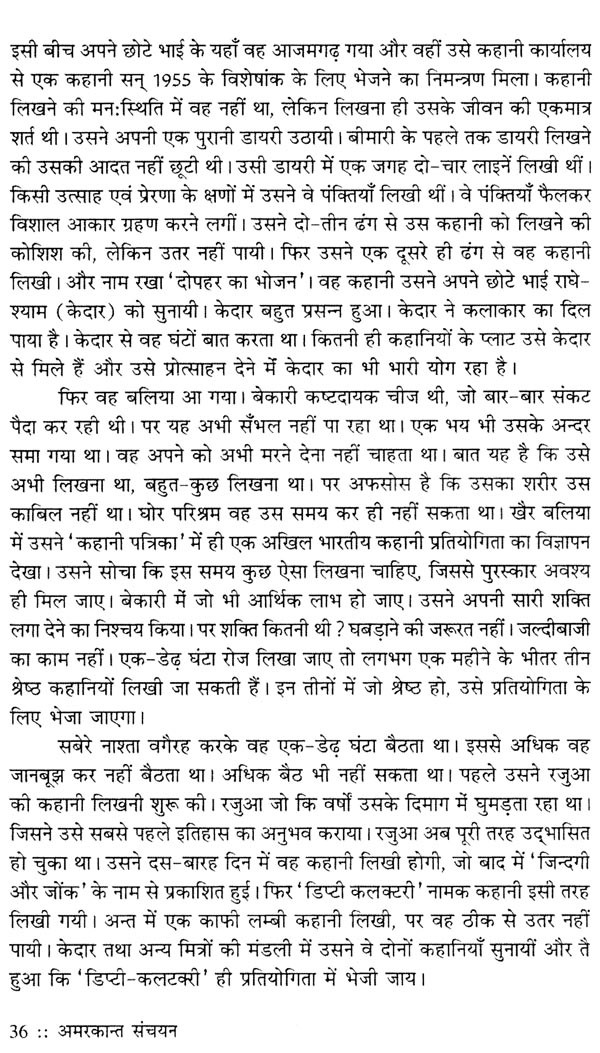 अमरकान्त के लिए लेखन एक सामाजिक दायित्व है। वे मानते हैं कि लेखन समय और धैर्य की माँग करता है। उनकी शीर्ष कहानी पढ़ने पर प्रमाणित होता है कि आरम्भ से ही इस रचनाकार ने अप्रतिम सहजता के साथ-साथ सजगता से भी इन कहानियों की रचना की। 'डिप्टी कलक्टरी', 'दोपहर का भोजन', 'ज़िन्दगी और जोंक', 'हत्यारे', 'मौत का नगर', 'मूस', 'असमर्थ हिलता हाथ' बड़ी स्वाभाविक और जीवनोन्मुख कहानियाँ हैं। सहज सरल कलेवर में लिपटी ये कहानियाँ जीवन की घनघोर जटिलताएँ व्यक्त कर डालती हैं। अपने समग्र प्रभाव व प्रेषण में ये रचनाएँ हमें देर तक सोचने के लिए विवश कर देती हैं। इन कहानियों में समय का कोई चालू फैशन या फतवेबाज़ी नहीं है। जीवन के सामान्य पहलू उठाकर, सपाट संवाद अथवा वर्णन की अन्विति जहाँ उनकी कहानी को बोधगम्य बनाती है, वहीं मन्तव्य की जटिलता, अन्त तक आते-आते अर्थगम्य बन जाती है। यद्यपि अमरकान्त का रचनाकाल नयी कहानी के दिनों से आरम्भ होता है, उनकी अभिव्यक्ति में नयी कहानी के फिसलन वाले बिन्दु सिरे से गायब हैं। वे अभिव्यक्ति में धुँधलेपन, धुन्ध और धाँधली के ख़िलाफ़ जैसे मोर्चा खोलकर खड़े हैं। वे न अपने आपको महिमामंडित करते हैं, न अपने पात्रों को। जीवन के मारक प्रसंगों को वे तटस्थ भाव से लिख जाते हैं, उनमें टप टप भावुकता नहीं डालते। युवा आलोचक वैभव सिंह के अनुसार, 'निम्नमध्यवर्गीय और मध्यवर्गीय चरित्रों की सृष्टि करना, उनकी महान जिजीविषा का वर्णन करना और जीवन के प्रति मोहभंग जैसी रुग्ण दृष्टि को नदी के द्वीपों की तरह बहाकर स्वस्थ संघर्ष भाव का संचार करना उनके लेखन के रेशे रेशे में मौजूद है। वे साहित्य जगत के ऐसे खिलाड़ी हैं जो जिन्दगी की कठिन परिस्थितियों से लड़ रहे लोगों को जिताने के लिए खेलते हैं। उनके पात्र भी अपनी चेतना पर 'व्यक्तित्व' का बोझ लेकर नहीं घूमते हैं, बल्कि चेहरे पर विकट आशावाद की चमक लिये जिन्दगी के बोझ को हल्का करने की कोशिश में लगे रहते हैं। नायकों के पास भी ज़िन्दगी की बारीक मनोगत समस्याओं से उलझने और दार्शनिक चिन्तन करने का वक्त नहीं, बल्कि रोजमर्रा की ठेठ चुनौतियों का समाधान तलाश कर जीवन को बेहतर नहीं तो कम-से-कम उसे बने बनाये रूप में बचाये रखने की चिन्ता ज्यादा गहरी है।'