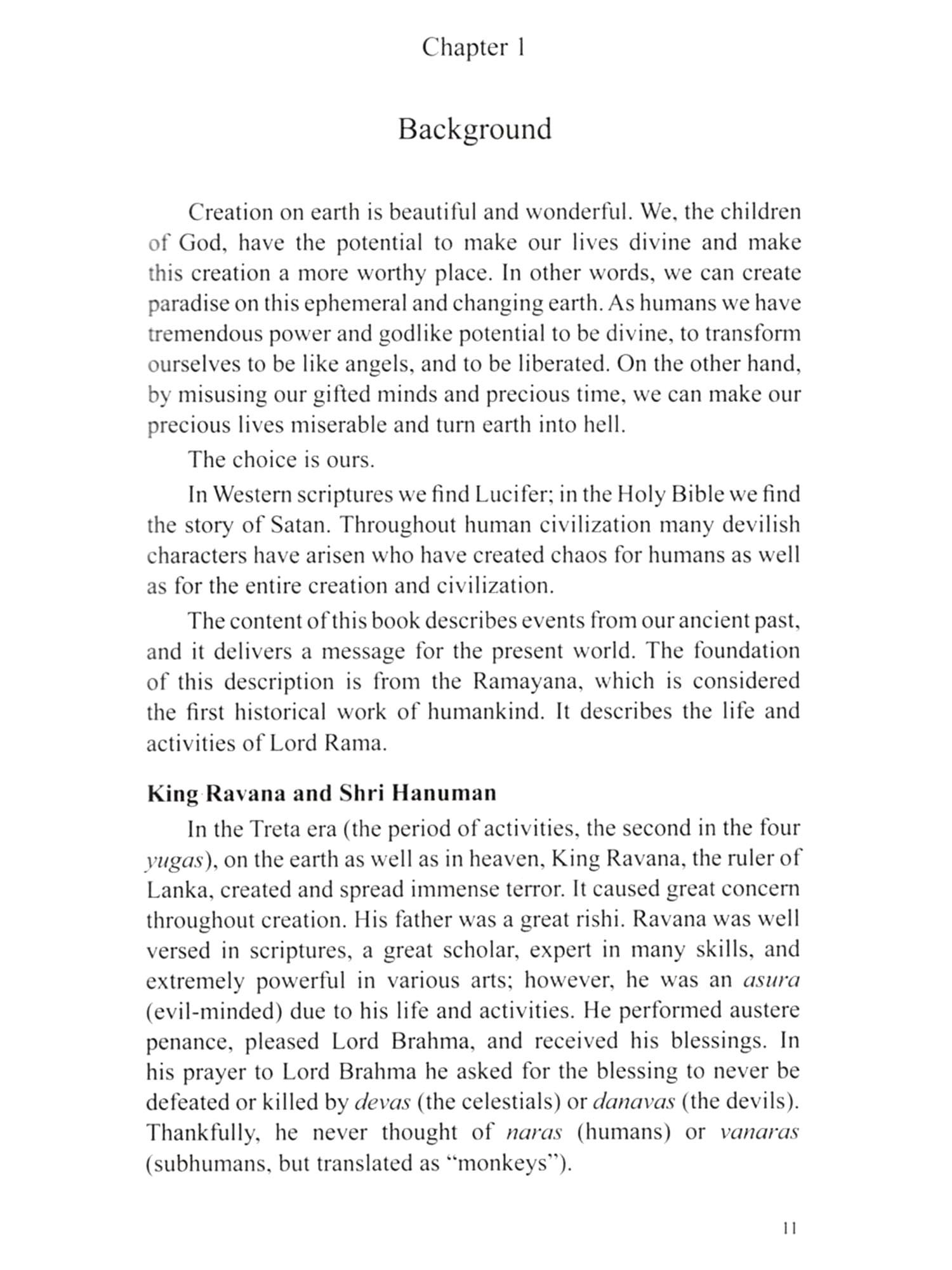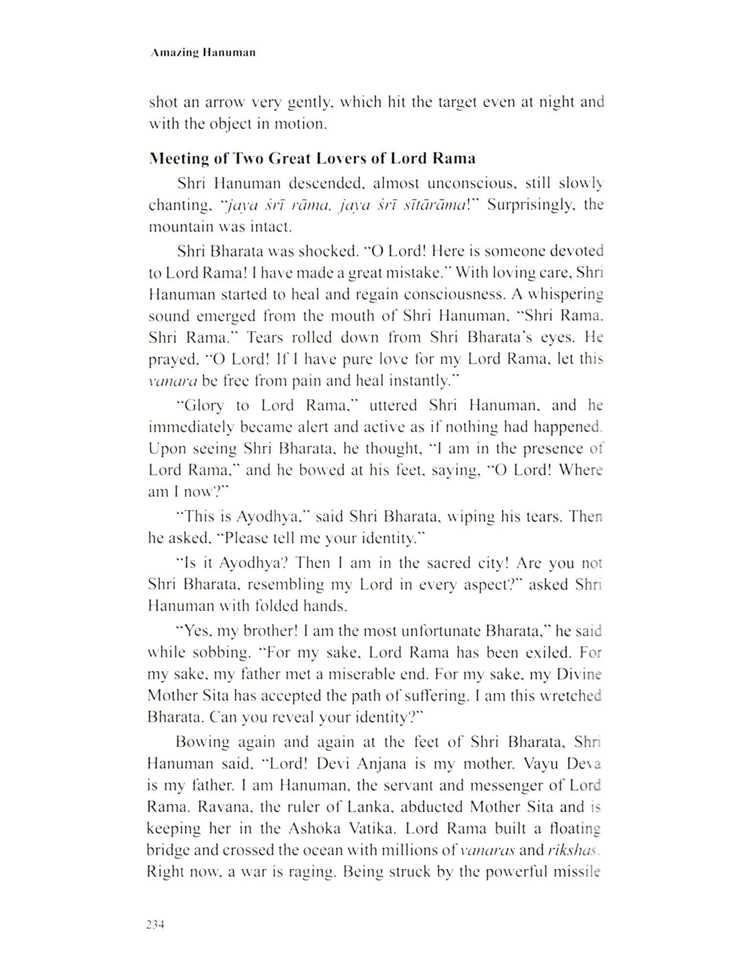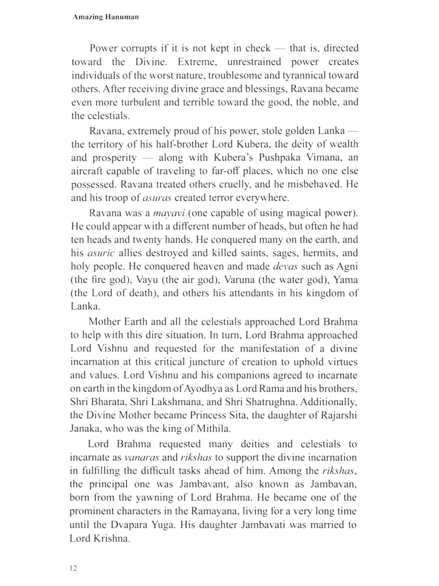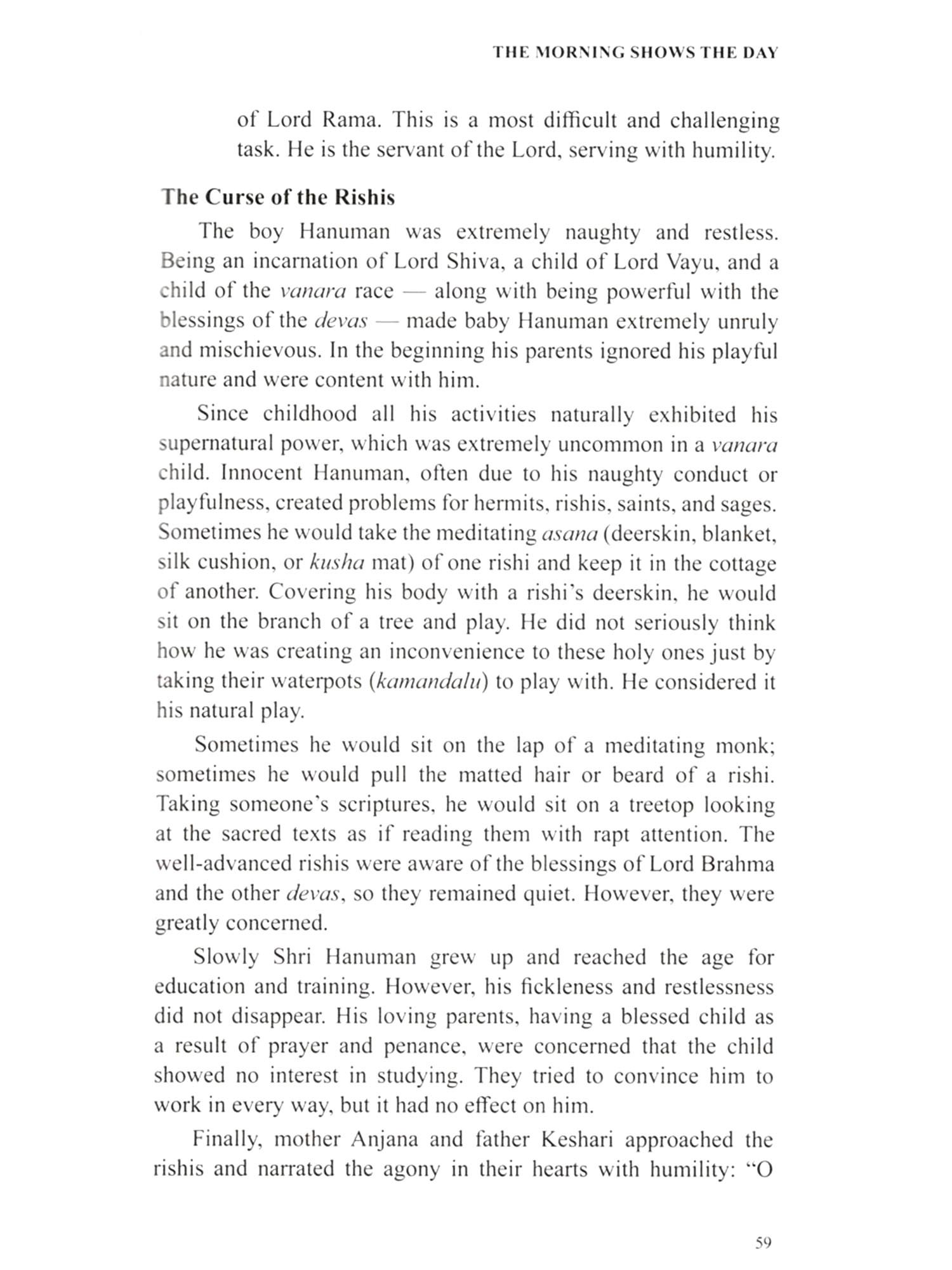 Slowly, my mother introduced me to the marvelous story of the Ramayana. I learned about the life and unimaginable activities of Shri Hanuman. In my childhood home there was a picture of Shri Hanuman as a giant monkey. In our village, every fortnight, a troop of monkeys visited, led by a very strong and sturdy male. He would sit atop huge trees, keeping an eye on everyone's safety and security. My mother told me that these monkeys were the descendants of Shri Hanuman. Their faces were black due to the burning of the city of Lanka. Needless to say, I had a deep love and adoration for these monkeys, but the villagers did not like them because they often destroyed their gardens. Observing their strength as they jumped from branch to branch and watching their agility and the way they ran created an image of Shri Hanuman in my mind as a child, and I imagined how he would have performed his wondrous work.