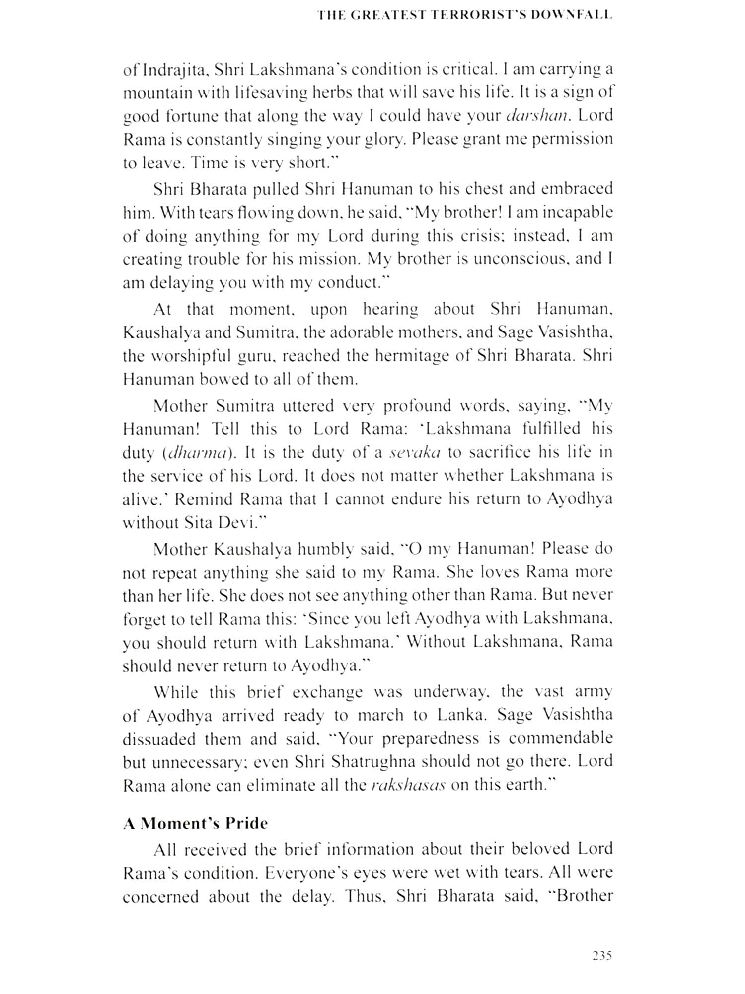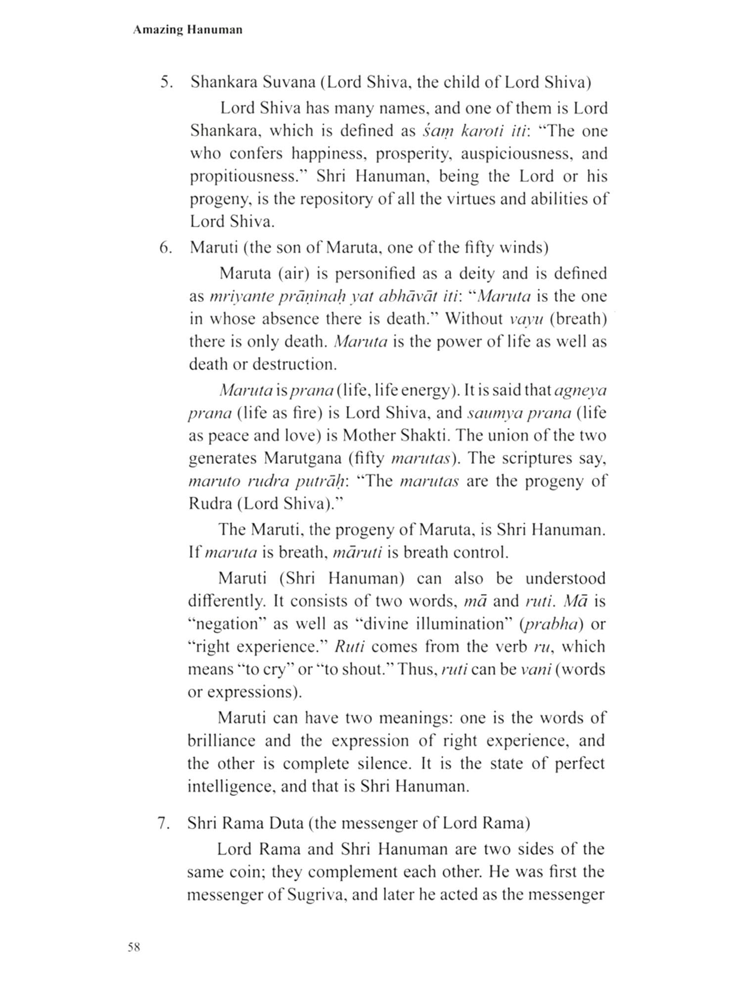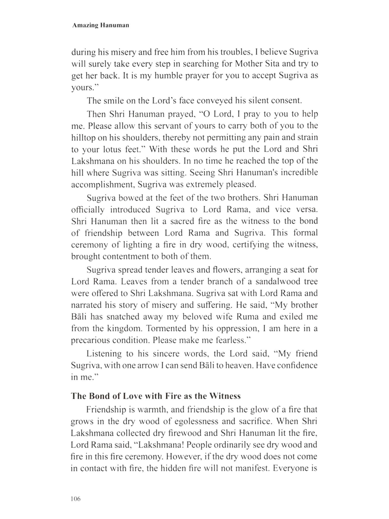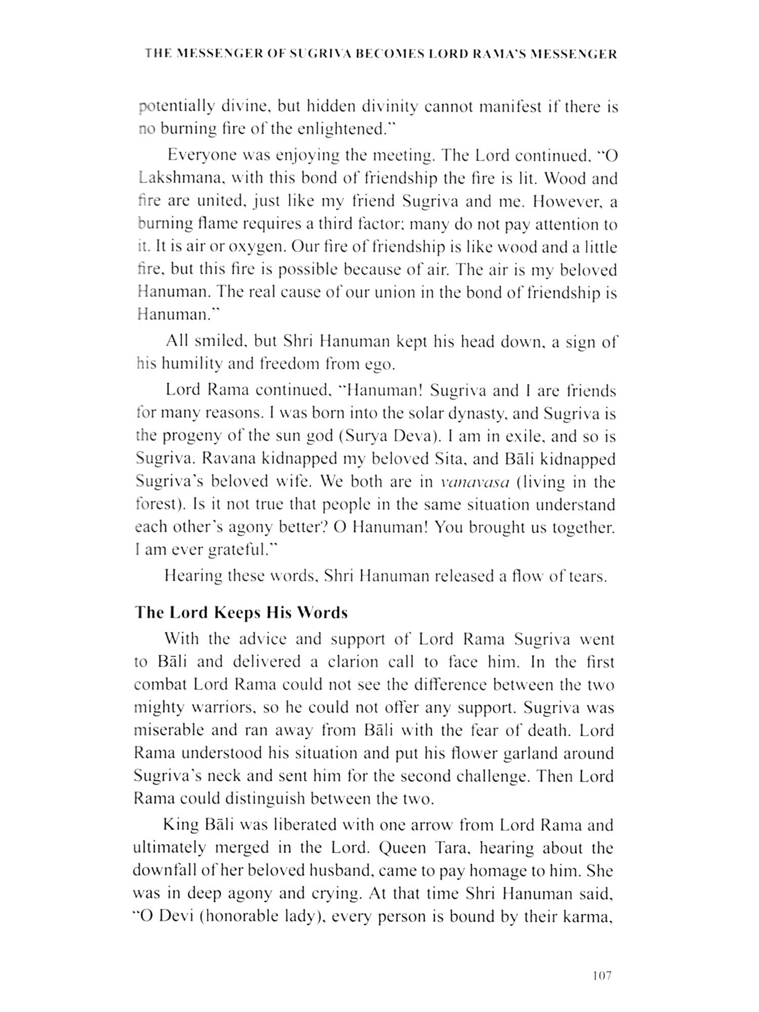 Slowly, my mother introduced me to the marvelous story of the Ramayana. I learned about the life and unimaginable activities of Shri Hanuman. In my childhood home there was a picture of Shri Hanuman as a giant monkey. In our village, every fortnight, a troop of monkeys visited, led by a very strong and sturdy male. He would sit atop huge trees, keeping an eye on everyone's safety and security. My mother told me that these monkeys were the descendants of Shri Hanuman. Their faces were black due to the burning of the city of Lanka. Needless to say, I had a deep love and adoration for these monkeys, but the villagers did not like them because they often destroyed their gardens. Observing their strength as they jumped from branch to branch and watching their agility and the way they ran created an image of Shri Hanuman in my mind as a child, and I imagined how he would have performed his wondrous work.