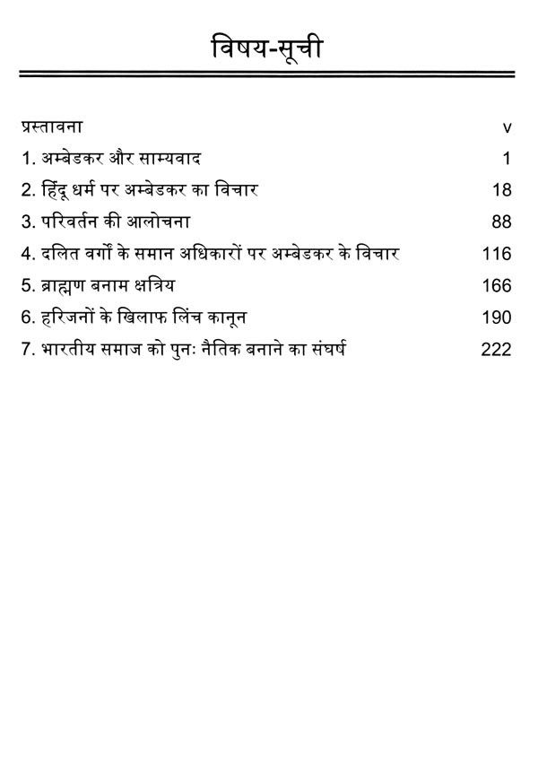 यह पुस्तक डॉ. आंबेडकर के समाज के प्रति दृष्टिकोण और उनके सामाजिक संघर्षों को उजागर करती है। इसमें अआंबेडकर के कम्युनिज्म, हिंदू धर्म पर विचार, और निरंतर परिवर्तन की आलोचना के बारे में चर्चा की गई है। पुस्तक में अआंबेडकर के दृष्टिकोण पर ध्यान केंद्रित किया गया है, खासकर उनके विचारों का निर्धारण कैसे किया गया था, और उन्होंने शोषित वर्गों के समान अधिकारों की वकालत की थी। इसके अलावा, पुस्तक में ब्राह्मणों और क्षत्रियाओं के बीच संघर्ष, हरिजनों के खिलाफ लिंच कानून, और भारतीय समाज को पुनः एथिक्स की दिशा में ले जाने के लिए उनकी संघर्ष की गहराई से समीक्षा की गई है।