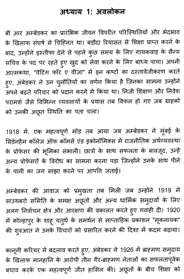 दलित अधिकारों के एक दृढ़ समर्थक के रूप में, अम्बेडकर ने खुद को महात्मा गांधी के साथ वैचारिक संघर्ष में पाया। हिंदू धर्म के बारे में गांधी का समग्र दृष्टिकोण अंबेडकर के इस विश्वास से टकराया कि दलितों के हितों की रक्षा के लिए एक अलग राजनीतिक पहचान की आवश्यकता है। आरक्षण के मुद्दे पर लंबे समय तक विवाद आजादी के बाद संविधान को अपनाने तक जारी रहा, एक दस्तावेज जिसे तैयार करने में अंबेडकर ने महत्वपूर्ण भूमिका निभाई थी। अंबेडकर के जीवन की जटिल कथा राजा शेखर कुंडरू के 15 वर्षों के शोध के विस्तृत विवरण में सामने आती है। भारत की चुनावी प्रणाली को आकार देने में अम्बेडकर की महत्वपूर्ण भूमिका पर मुख्य फोकस है।