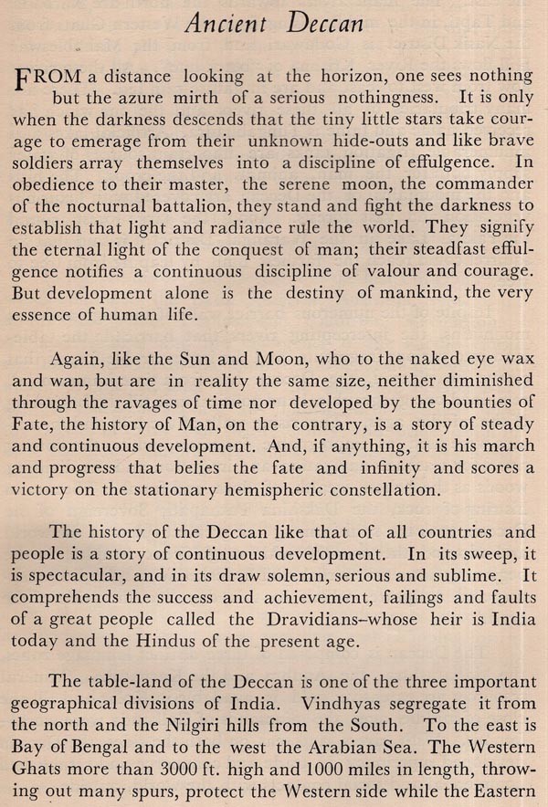Now in this brief treatise he has presented a panoramic picture of the cultures and races that flourished in the Deccan from the pre-historic times to the present day. The main object of the learned author is to strengthen the ties of National Integration and to resuscitate the forces of love and amity. In doing so he has paid tribute to Kings and Dignatories who have set an example of toleration and considered human welfare as supreme.