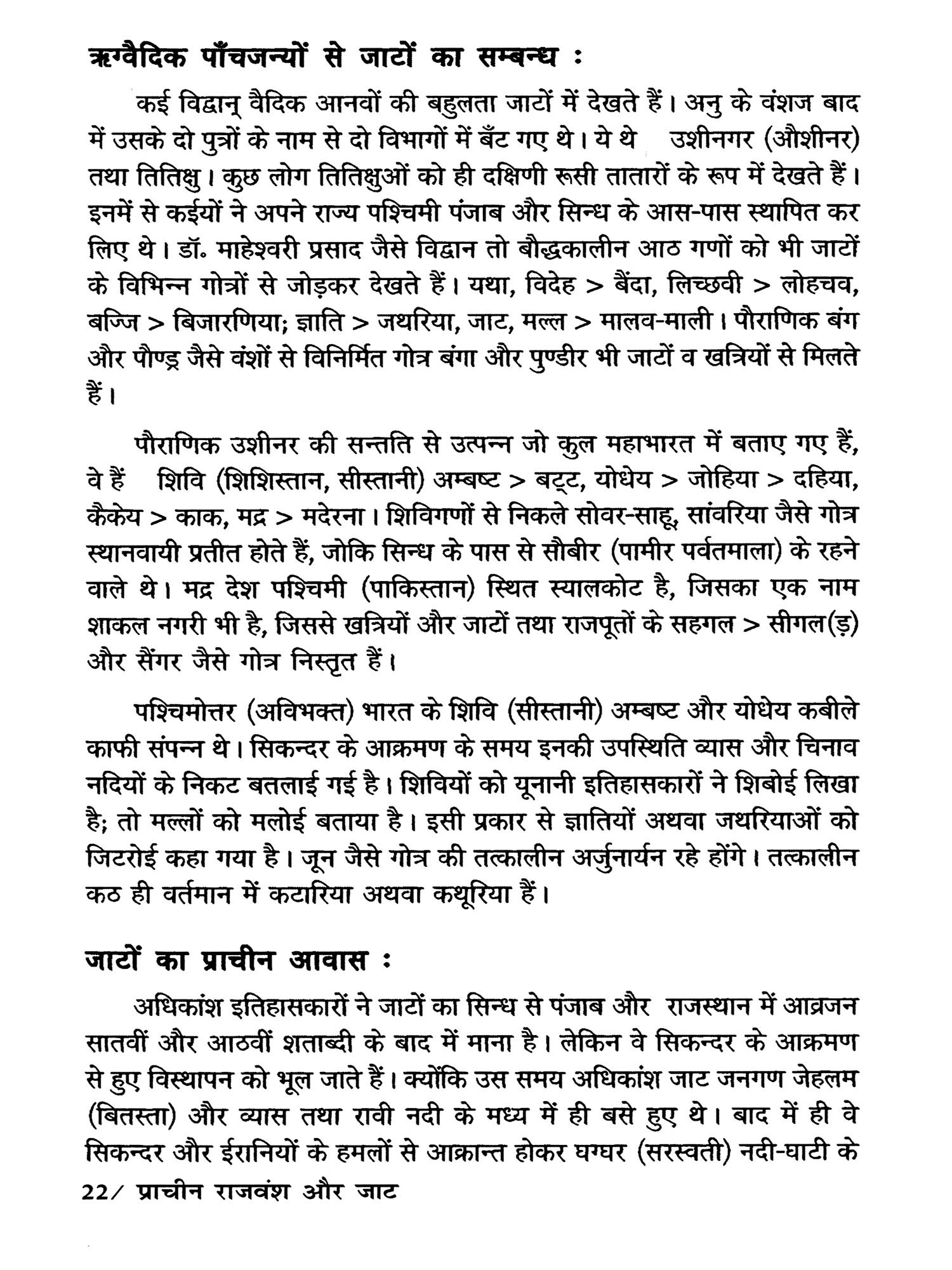 'प्राचीन राजवंश और जाट' नामक यह पुस्तक हमारी पिछली पुस्तक 'वैदिक आर्य और जाट' की ही अगली कड़ी है। जिसमें हमने वैदिक-काल से भी आगे बढ़कर उत्तर वैदिक काल किंवा महाभारतकालीन इतिहास को भी आधार बनाया है। विशेषकर पाणिनि की अष्टाध्यायी और पतंजलि का महाभाष्य इस विषय में हमारे बड़े काम के ग्रन्थ हैं। पाणिनि मुनि ने ही 'जट् सन् संघाते' जैसे सूत्र के माध्यम से उन्होंने जाट जन-गण की संघात्मक प्रवृत्ति की ओर ही स्पष्ट संकेत किया है असियाग तो त्रिगर्ती अथवा त्रिजों और योधेय, मद्र, शाल्व, वसाति, शूरा, ग्लूकायन, अश्मक (लोकेशन में) एवं मालव, क्षुद्रक, कठ और शिवि जैसे गणों का भी नाम आया है। उनके आपसी सम्बन्धों का भी उद्घाटन और अष्टाध्यायी करती ही हैं।