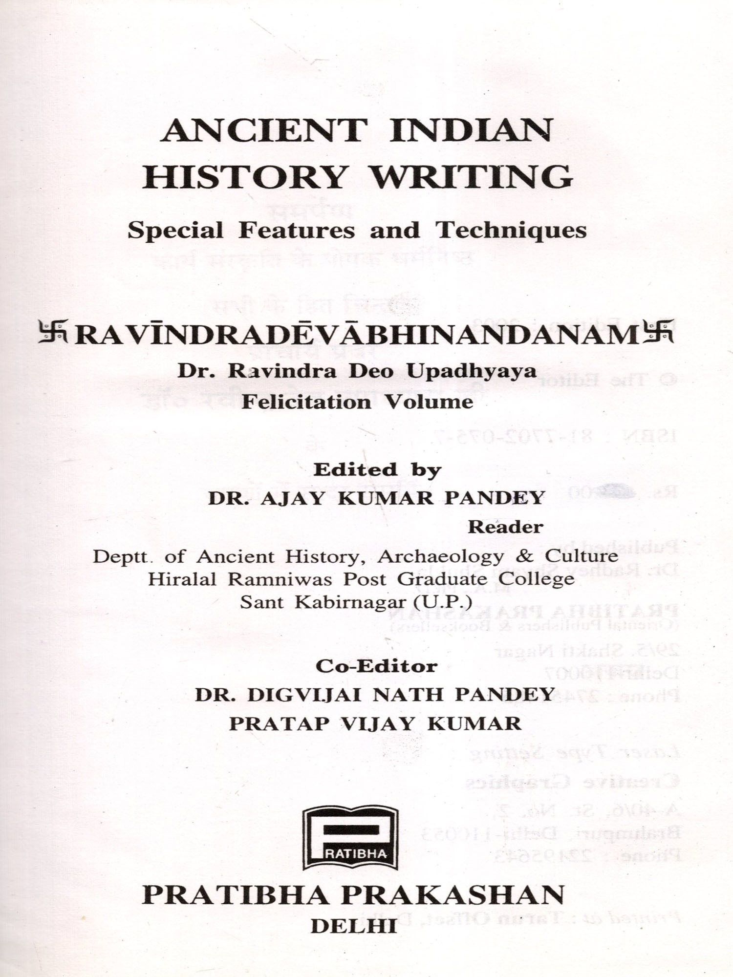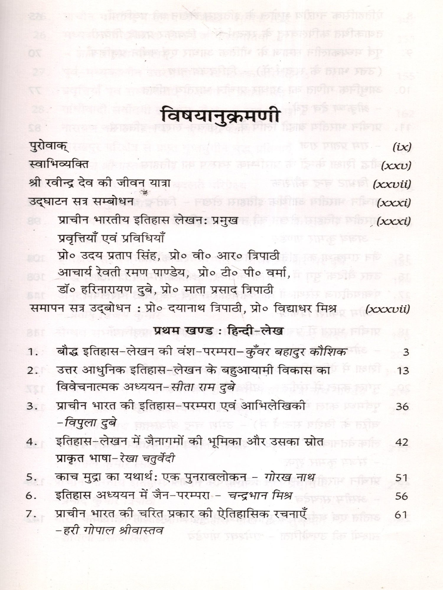 भारतीय इतिहास-लेखन की प्रविधि अत्यन्त प्राचीन है किन्तु आधुनिक काल में उसके वैज्ञानिक प्रस्तुतीकरण की नितान्त आवश्यकता है। इसी परिप्रेक्ष्य में 'प्राचीन भारतीय इतिहास-लेखन : प्रमुख प्रवृत्तियां एवं प्रविधियाँ' विषय पर आयोजित राष्ट्रीय संगोष्ठी में देश के मूर्धन्य विद्वानों द्वारा गवेषणापूर्ण एवं वैज्ञानिक रूप से प्रस्तुत शोध-लेखों का सङ्ग्रह इस ग्रन्थ में किया गया है।