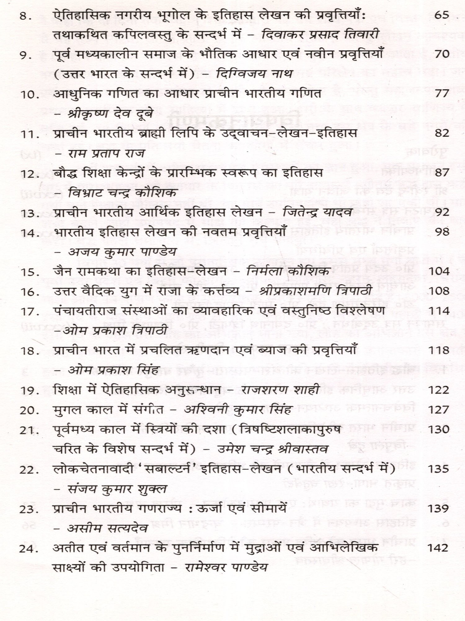 प्रस्तुत ग्रन्थ में संवाद प्रश्नोत्तर, प्रवचन, व्याख्यान और वाचन की प्रविधि द्वारा समाज विज्ञान से सम्बद्ध विभिन्न अनुशासनों में इतिहास-लेखन की प्रमुख प्रवृत्तियों एवं प्रविधियों की विकासात्मक समीक्षा एवं ऐतिहासिक पृष्ठभूमि, सम-सामयिक इतिहास-लेखन, इनकी परिवर्त्तित प्रक्रिया, नव-उपलब्ध साधन स्त्रोतों के आलोक में ऐतिह्य अध्ययन का स्वरूप निर्धारित करने का प्रयास विद्वान लेखकों द्वारा स्व-स्व लेखों में किया गया है।