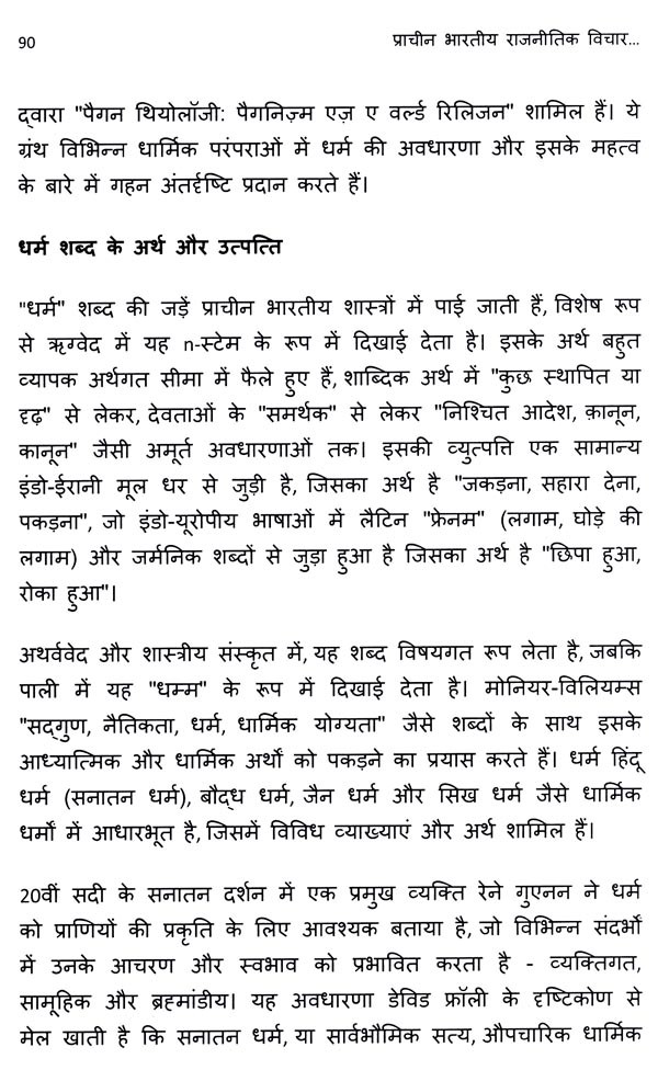 प्राचीन भारतीय राजनीतिक दर्शन को धार्मिक मान्यताओं के ढांचे के भीतर ही समझा जाना चाहिए। आरंभिक ब्रह्माण्ड संबंधी विचारों में, राजनीतिक व्यवस्था ब्रह्माण्ड को ही प्रतिबिम्बित करती थी, तथा इसके निर्माण को ब्रह्माण्डीय व्यवस्था की दिव्य रचना के पुनर्मूल्यांकन के रूप में देखा जाता था। वैदिक अनुष्ठानों का उद्देश्य समाज के सुचारू संचालन को सुनिश्चित करने के लिए इस ब्रह्माण्डीय व्यवस्था की नकल करना था। जैसे-जैसे समय उत्तर वैदिक काल में आगे बढ़ा, वीर मानवरूपी देवताओं की छाया अधिक दूर के और भव्य देवताओं पर पड़ गई, जिसके कारण जटिल अनुष्ठानों के इर्द-गिर्द केंद्रित अत्यधिक औपचारिक धार्मिक प्रथा का निर्माण हुआ। धर्म के तकनीकी विशेषज्ञता से जुड़ने के साथ, पुजारियों की स्थिति मजबूत हुई, जिससे उन्हें सामाजिक नियंत्रण से खुद को अलग करने की अनुमति मिली।