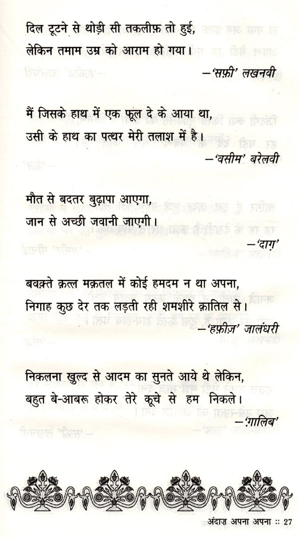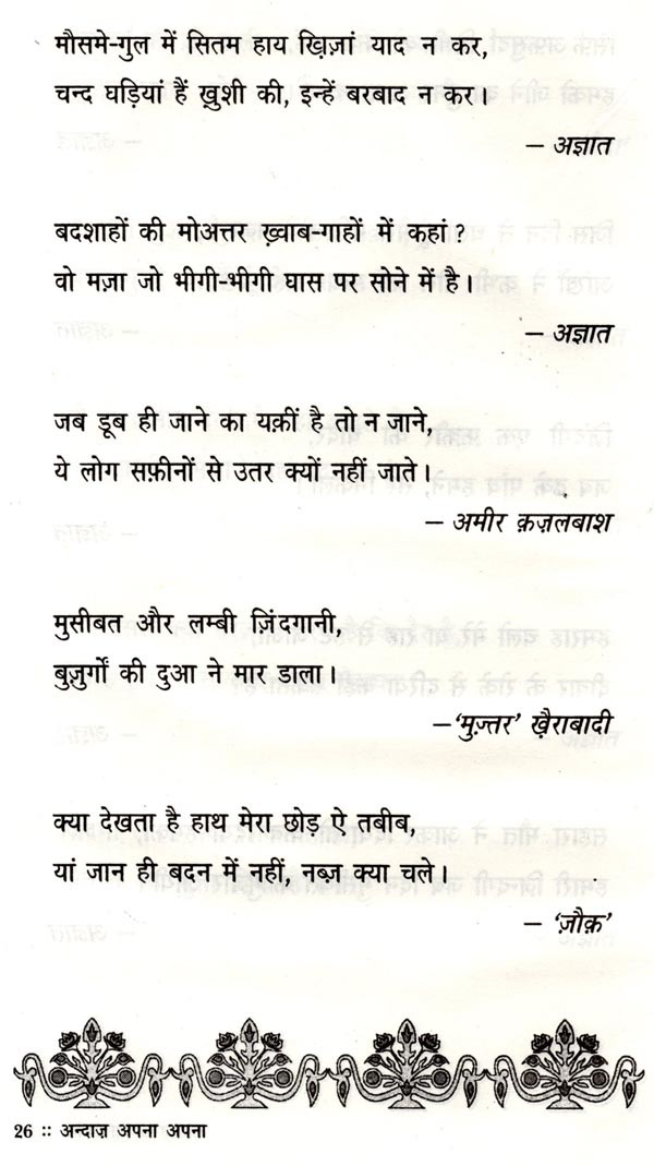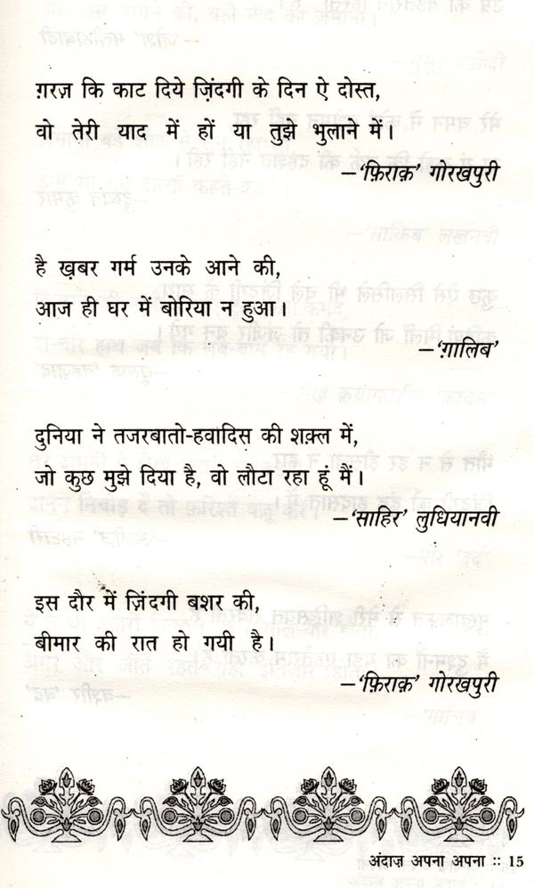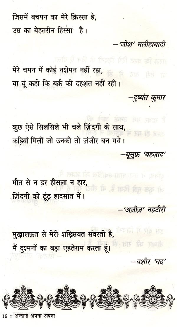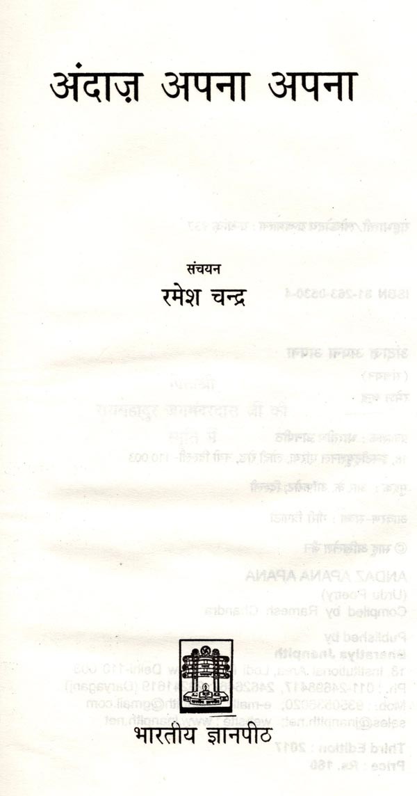 शेरों की पसंद का अजीब मुआमला है। इनसे जिंदगी को आपने किन शर्तों पर जीया है या आपको जिंदगी ने किस तरह झेला और बरता है, उसका हाल तो मालूम हो ही जाता है, सच तो यह है कि शेरों से दिल का चोर भी खुलकर सामने आ जाता है: खुलता किसी पे क्यूं मेरे दिल का मुआमला, शेरों के इतिख़ाब ने रुस्वा किया मुझे । फिर पसंद-नापसंद भी तो अलग-अलग हो सकती है, अपने-अपने तजरबे, ज़ौक़ और ज़र्फ़ की वजह से। तभी तो कहा जाता है 'पसंद अपनी अपनी ख़्याल अपना अपना'। लेकिन कुछ चीजें ऐसी भी होती हैं कि सबकी निगाह ठहर जाती है, जैसे कुछ चेहरे ऐसे होते हैं कि जी में खुब जाते हैं। इसी तरह कुछ शेर भी ऐसे होते हैं कि ज़बान पर बेसाख़्ता चढ़ जाते हैं। वैसे तो सौंदर्य एक रहस्य है जिसको खोलना आसान नहीं। दिलवालों का कथन है कि 'अपना माशूक़ तो वो है जो अदा रखता है', या जैसा फ़ारसी में कहा जाता है कि 'करिश्मा दामन-ए-दिल मी कशद कि जा ईं जा अस्त'। यह 'अदा' या 'करिश्मा' क्या है जो दिल के दामन को अपनी ओर खींचता है। इसका कोई आसान जवाब नहीं। सौंदर्य की तरह शायरी भी बस वो है जिसका जादू सर चढ़कर बोले। ज़ेरे नज़र किताब 'अंदाज़ अपना अपना' में भी श्री रमेश चन्द्र ने उर्दू शायरी के सदियों के सरमाये से ऐसे हीरे-मोती चुने हैं जिनकी आब-ओ-ताब कभी कम न होगी और जिनकी कशिश हमेशा दिल को खींचती रहेगी। ये चुनिंदा अशआर श्री रमेश चन्द्र के सुथरे मज़ाक़ और जिंदगी भर के तजरवे का निचोड़ हैं। इस आईना-खाने में मीर व गालिब, मुसहफ़ी व मोमिन और दाग व फ़ानी से लेकर फैज़ व फ़िराक़, शहरयार व बशीर 'बद्र' तक सबके लहजों की गूंज सुनाई देगी। इतिखाब निहायत उम्दा और भरपूर है जिसमें ज़िंदगी की हर झलक मिलेगी और पढ़नेवालों के लिए लुत्फ़ो-मज़े का बहुत सामान है। रमेश चन्द्र जी के ज़ौक़ो-शौक़ के पेशे-नज़र लगता है कि उनकी नज़र पूरी उर्दू शायरी पर रही है, और जिंदगी के हर मोड़ पर चुभते हुए शेरों को वह जमा करते गये हैं। यूं यह किताब एक जामे-जहां-नुमा बन गयी है। जिंदगी, इंसानियत, रूहानियत, सौंदर्य, प्रेम, तसव्वुर, वतनपरस्ती, आत्म-विश्वास, मज़हब, दुनियादारी, व्यंग्य, मयकदा हर मौजू पर अच्छे शेरों का ऐसा ज़ख़ीरा है कि जिंदगी की हर करवट एक खुली किताब की तरह सामने आ जाती है। फूल तो बेशक बाग़ में खिलते हैं, लेकिन उनसे गुलदस्ता बनाना बाग़बान का कमाल है। आशा है शेरों के इस गुलदस्ते की महक सदा बाक़ी रहेगी और इसका हुस्न हमेशा अपने बाग़बान की याद दिलाता रहेगा।