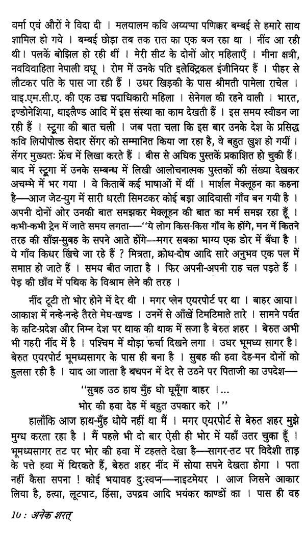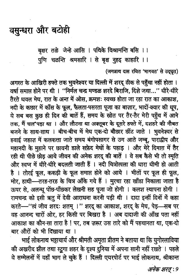 ज्ञानपीठ पुरस्कार से सम्मानित प्रख्यात ओड़िया कवि और चिन्तक-विचारक डॉ. सीताकान्त महापात्र के यात्रा-वृत्तान्त अनेक शरत् को हिन्दी पाठक-समाज के लिए एक प्रीतिकर उपलब्धि कहा-माना जा सकता है। 'स्टूगा कविता समारोह' में भारत का प्रतिनिधित्व करते हुए सीताकान्त जी ने युगोस्लाविया, रोमानिया और रूस की यात्रा के दौरान छोटी-सी अवधि में वहाँ के जीवन, समाज और संस्कृति को भरपूर कवि-मन से देखा, जिया और उसे आत्मीय रूप से अभिव्यक्त किया है। एक समर्थ कवि के इस यात्रा-वृत्तान्त को समूची कविता-यात्रा या रागात्मक सांस्कृतिक यात्रा कहा जाये तो आश्चर्य नहीं होना चाहिए। यानी एक ऐसा यात्रा-वृत्तान्त जो अनन्त दूरियों के बीच मनुष्य और मनुष्य को एक करने की सार्थक कोशिश करता है; जिसमें गाँव, शहर, जंगल, पहाड़ के सुख-दुःख बोलते हैं और नदी, झरने, झील, सागर के शब्द चुपचाप अपने रहस्य खोलते हैं। और कुल मिलाकर इन्द्रनील शारदीय आकाश पर बजती हुई इन सब की एक समवेत अनुगूँज है। शायद उसी अनुगूँज से साक्षात्कार कराती है सीताकान्त महापात्र की यह कृति अनेक शरत् !