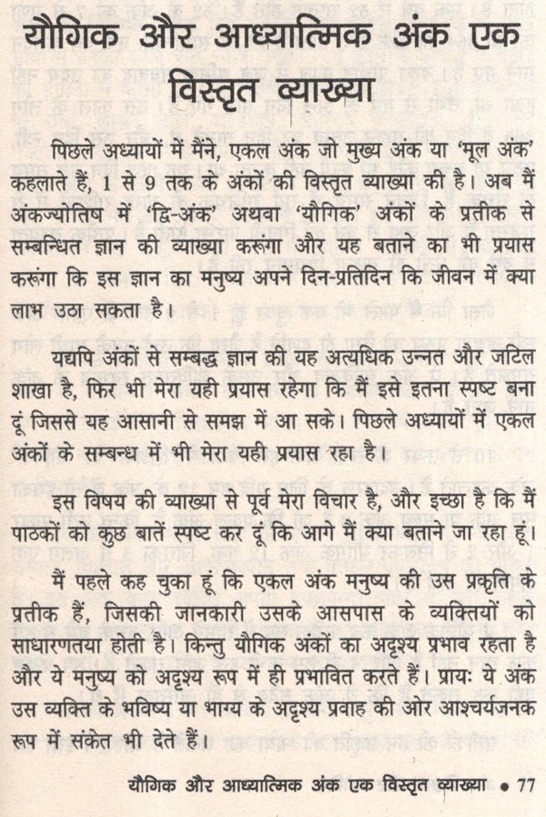 यहां उन सभी कारणों व उदाहरणों की विस्तृत जानकारी उपलब्ध कराना असम्भव है, जिससे कि यह बात सत्य प्रमाणित हो सके कि अंकों में छिपा हुआ रहस्य विश्वसनीय है। यहां यदि मैं यह बताना और सिद्ध करना चाहूं कि अंक 7 अनेक युगों से रहस्यपूर्ण अंक माना जाता है और यह अलौकिक सम्बन्धों की ओर इशारा करता है और 9 का अंक अन्तिम और सम्पूर्णता का द्योतक है जिस पर कि हमारी सब प्रकार की भौतिक गणनाएं निर्भर हैं, तो मेरे पाठकों को इसे जानने में अवश्य दिलचस्पी होगी। किन्तु उथले ज्ञान का ज्ञाता केवल यही मानेगा कि अंक 9 के आगे सभी अंक प्रथम 8 तक के अंक की ही मात्र पुनरावृत्ति हैं। इसका एक सरल उदाहरण देना ही पर्याप्त होगा। 10 का अंक ही लें, इसमें शून्य कोई अंक नहीं है, अतः वह अंक एक की ही पुनरावृत्ति है। अंक 11 यदि हम इस अलौकिक ज्ञान के ज्ञाताओं के अनुसार इसे स्वाभाविक रूप से अर्थात् बाएं से दाएं की ओर जोड़ें तो पुनः 2 का अंक प्राप्त होगा। 12 से 3, 13 से 4 इसी प्रकार 19 तक यही क्रम चलता रहेगा जो पुनः 9 और 1 जोड़ने पर 10 होगा और पुनः एक का अंक प्राप्त होगा। 20 का अंक 2 का द्योतक है। इस प्रकार अनन्त संख्याओं तक यही क्रम विद्यमान है। यौगिक संख्याओं का रहस्यमय प्रतीकस्वरूप, जो दस के अंक से प्रारम्भ होता है, मैं बाद में समझाऊंगा।