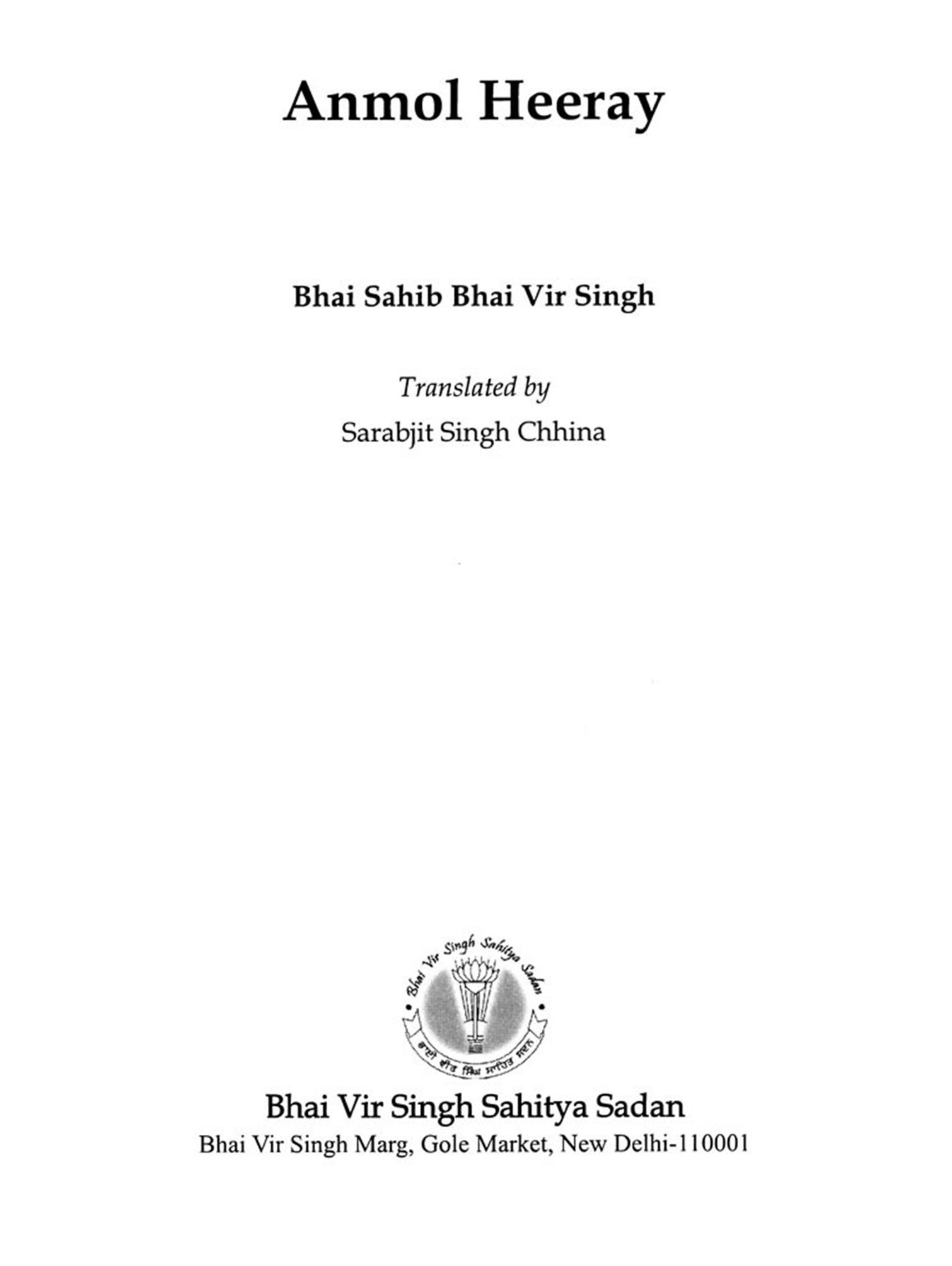 Encouraged by the response of Punjabi version, we have got Bhai Sahib's popular work Anmol Heeray translated into English. Anmol Heeray aims to throw light on the lives and contribution of Sikh heroes who got shrouded in the mists of time. The book deals with sagas of brave Sikh men and women who upheld principles and values of equality and humanity taught by the Gurus while fighting against oppression and injustice.