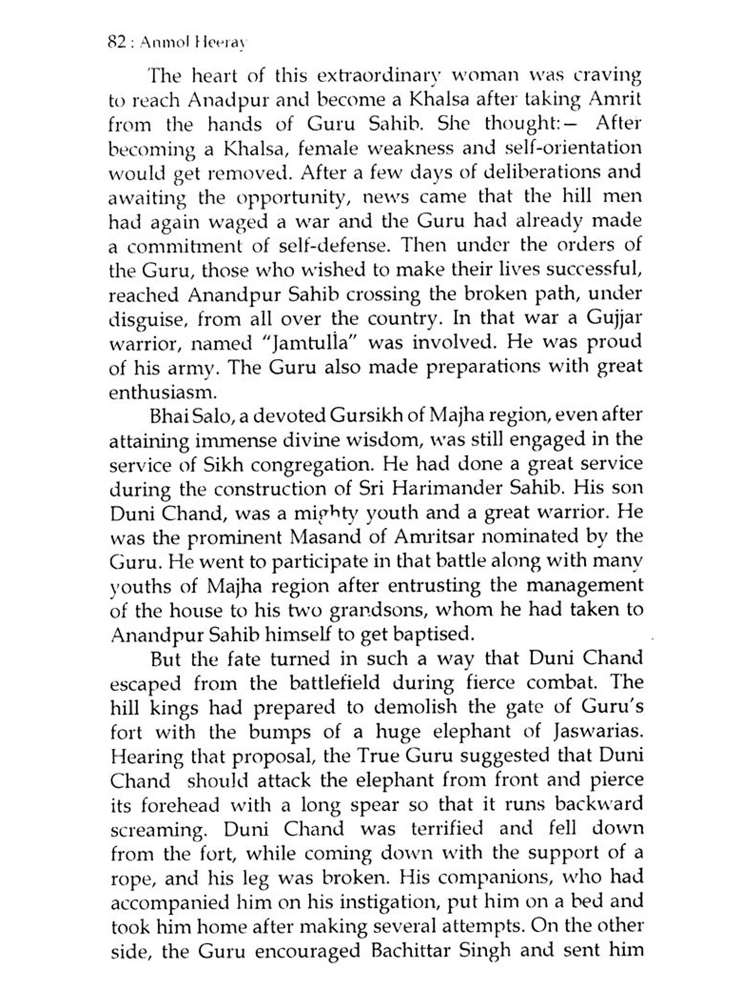 The book, in hand, Anmol Heeray, written by Bhai Sahib, chronicles the lives of those brave "Sikh men and Sikh women who followed the path laid down by Guru Gobind Singh and sacrificed their lives for the cause of Sikhism. The life of Bhai Sahib and his writings are clear proofs of how the 'Khalsa' created by the Tenth Guru lived fearlessly in the fear of Akal Purakh for the freedom of its shrines and religion during the tyrannical Mughal rule. The contribution of Maninder Kaur, a research scholar who has collected these articles published in Khalsa Samachar and tracts written by Bhai Sahib from time to time and compiled and presented them in book form, Anmol Heeray is highly commendable. Hopefully, the book Anmol Heeray will be a tool for our children and youth to explore the radiance that is inherent in us. This book is dedicated to the readers in the hope of a full response.