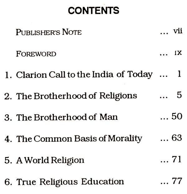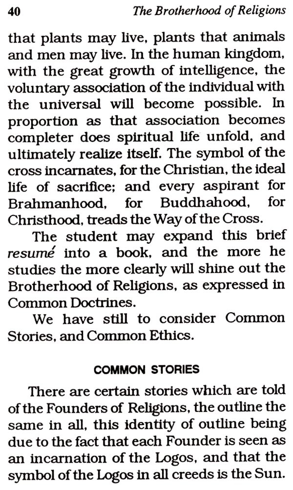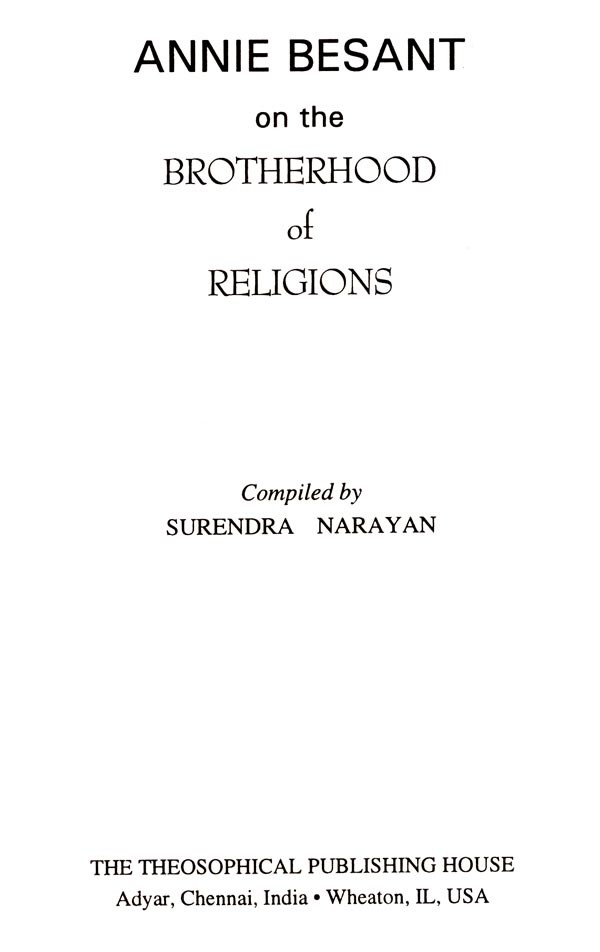 An attempt has been made in the following pages to present briefly to the reader Annie Besant's inspiring thoughts on the Brotherhood of Religions and what should follow from a perception of such brotherhood, for she did not believe in a mere theory or philosophy of religion.