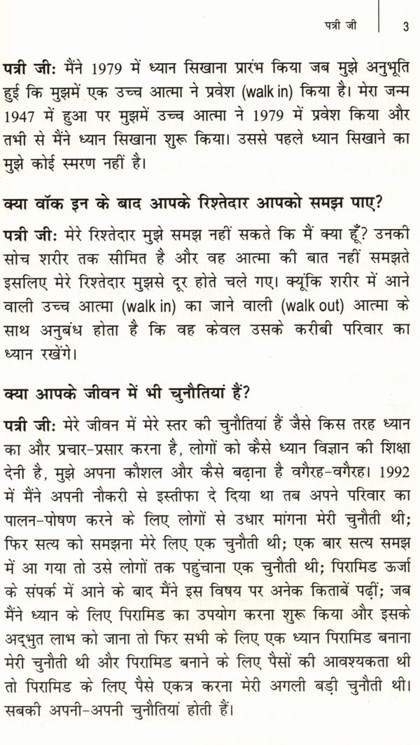 पद्मश्री श्री डी.आर. कार्तिकेयन ब्रह्मर्षि पत्री जी पूरे विश्व में आध्यात्मिकता और ध्यान के क्षेत्र में सुविख्यात हैं, उन्हें किसी परिचय की आवश्यकता नहीं है। यह इतिहास की बात है कि राजकुमार सिद्धार्थ सत्य, परिपूर्णता और शांति की तलाश में महल छोड़कर निकल गए। आज से लगभग 2500 वर्ष पूर्व वह सभी तरीकों से प्रयोग करते हुए, विपस्सना की पद्धति से ज्ञान को प्राप्त हुए। इतने वर्षों से गौतम बुद्ध की ही भूमि में विपस्सना को भुला दिया गया और वहीं दूर के देशों जैसे बर्मा में अच्छी तरह संरक्षित किया गया। लगभग 100 साल पहले रंगून में एक प्रमुख संपन्न जौहरी को बहुत तीव्र और लाइलाज सिरदर्द हुआ। संक्षेप में उन दिनों विभिन्न देशों में उपलब्ध इलाज से कोई आराम न मिलने पर युवा जौहरी सत्यनारायण गोयंकाजी ने अपने शुभचिंतकों की सलाह पर विपस्सना ध्यान का पाठ्यक्रम शुरू किया। गोयंकाजी को अपनी तकलीफ से कुछ ही सप्ताह में आराम मिल गया। उन्हें यह तकनीक काफी मूल्यवान लगी और उन्होंने इसका 3 माह का कोर्स किया। उन्हें इससे बहुत लाभ हुआ। अपने बर्मा के गुरु यू बा खिन की सलाह पर उन्होंने विपासना को बुद्ध की जन्मभूमि में लाने का निर्णय लिया। 1969 में वह इसे भारत में लाए। अपनी समर्पित प्रयासों से उन्होंने इस तकनीक को बिल्कुल सुगम कर लोगों तक पहुंचाया। अपने जीवन के नाजुक दौर में मैं हैदराबाद केंद्र पर 10 दिन विपासना ध्यान करने में सक्षम रहा। मुझे आश्रम में दो समय भोजन के साथ 10 दिन रहना पड़ा जहां सुबह 5 बजे से देर रात तक अभ्यास चलता था। पहले 3 दिन सिर्फ अपनी साँसों का निरीक्षण करना था. आती हुई साँस और जाती हुई साँस, जिसे आनापानसति ध्यान कहा जाता है। अगले 7 दिन अपने शरीर की संवेदनाओं को पूर्ण शांति से निरीक्षण करना होता है। ब्रह्मर्षि पत्री जी ने इस प्रक्रिया को बिल्कुल सुगम बना दिया है। आती-जाती हुई साँसों का निरीक्षण करना ही ध्यान है। पत्री जी ने स्वयं इसका अभ्यास किया, लाभान्वित हुए और लोगों में इसके बारे में जागरूकता फैलाना आरंभ किया। पत्री जी ने निर्धन और अमीर, अनपढ़ और पढ़े-लिखे सभी के लिए इसका लाभ लेना सुगम कर दिया। उन्होंने पिरामिड के अंदर ध्यान करने की शक्ति को पहचाना और हर जगह पिरामिड बनाने पर जोर दिया। आज पूरे विश्व में छोटे-बड़े 20000 से ज्यादा पिरामिड हैं तथा अनगिनत कार्यशालाएं, कक्षाएं और ध्यान गोष्ठियां चल रही हैं। अपनी गायन शैली और बाँसुरी बजाने की कला को ध्यान से जोड़कर उन्होंने न केवल देश में बल्कि विदेशों में भी लाखों लोगों को ध्यानी बनाया है। इस तरह एक नए युग की आध्यात्मिक जागृति का अभ्युदय हुआ है। इस निशुल्क ध्यान अभ्यास तकनीक से लाखों लोगों के जीवन में अदभुत परिवर्तन हुए हैं। उन्होंने लाखों लोगों को शाका