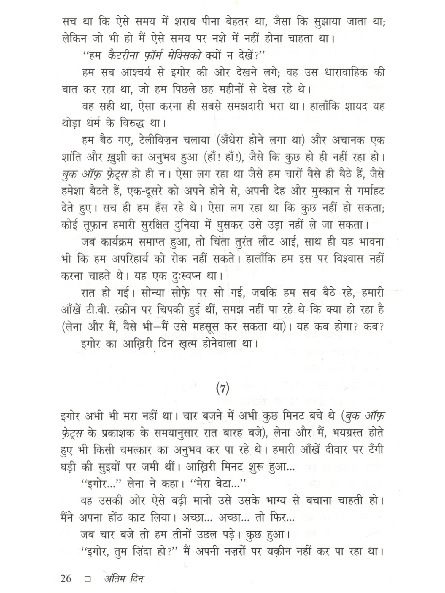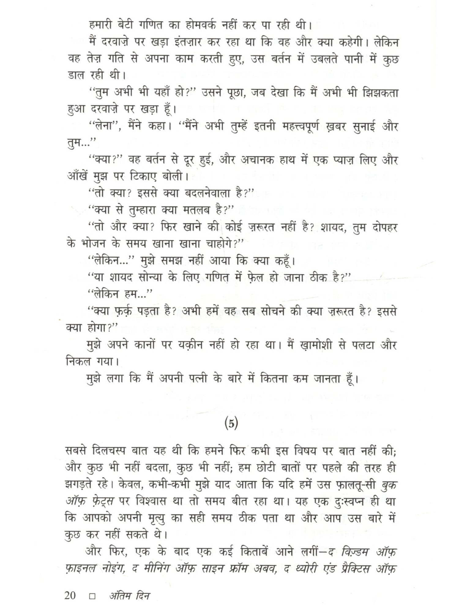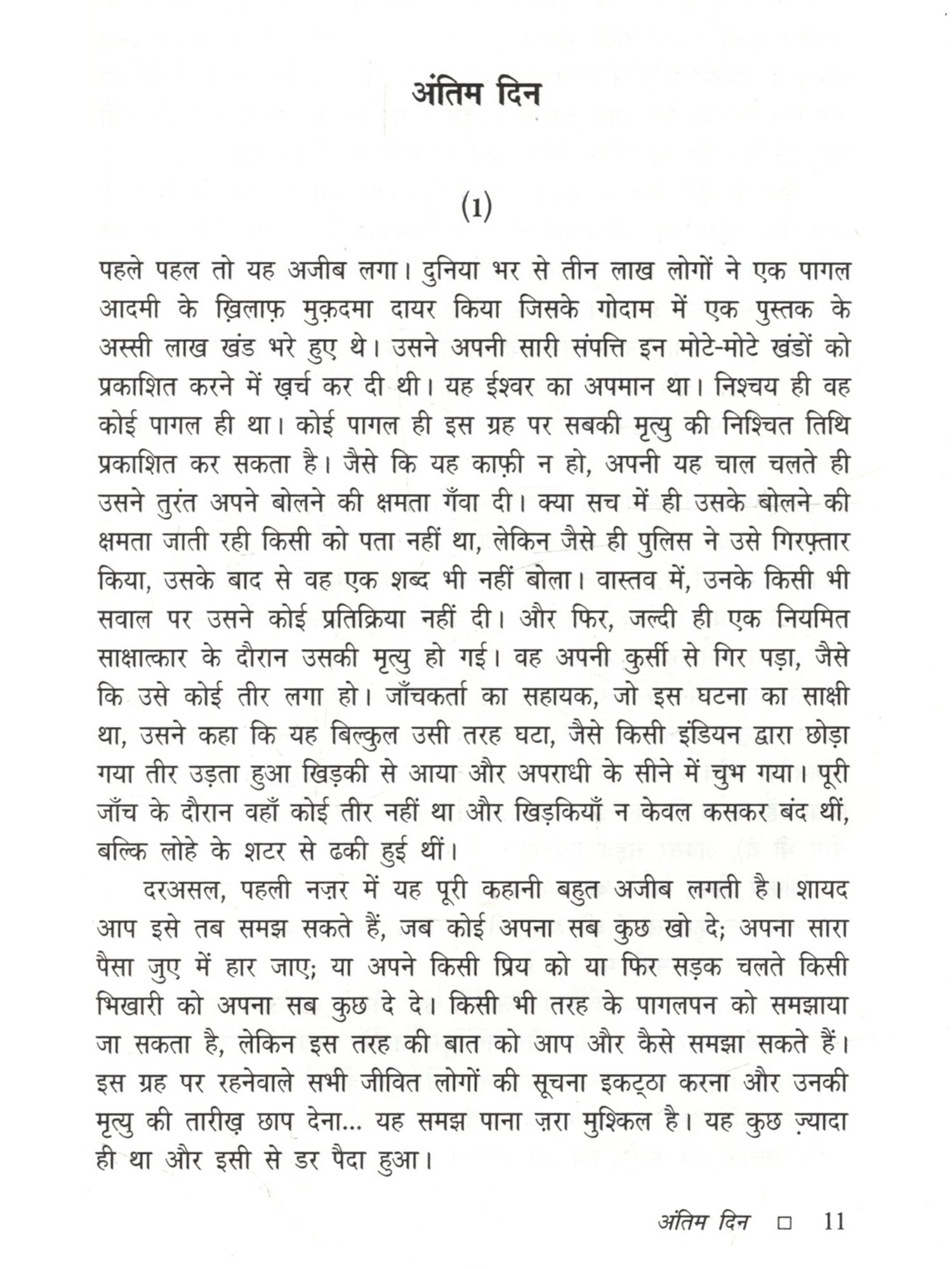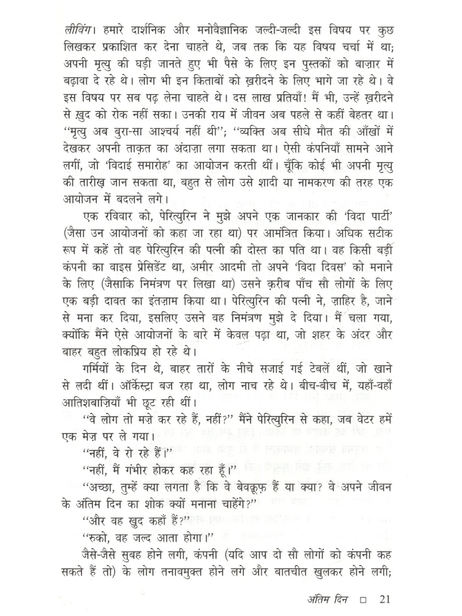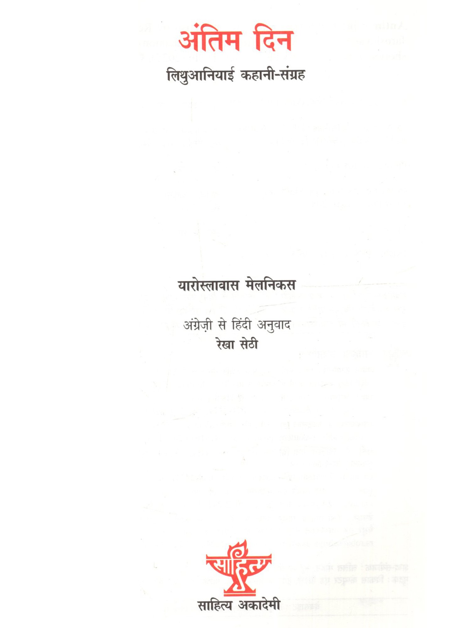 अंतिम दिन मूलतः लिथुआनियाई भाषा का कहानी संकलन है, जिसे अंग्रेज़ी अनुवाद के माध्यम से हिंदी में अनूदित किया गया है। इसकी सभी कहानियाँ मानवीय जीवन की विडंबना एवं अस्तित्व के संकट बोध को उजागर करती हैं। अत्यंत साधारण परिस्थितियों में जीते आम लोग अचानक स्वयं को ऐसी स्थिति में पाते हैं जिससे जीवन का अर्थ और दिशा बदलने लगते हैं, बाह्य यथार्थ बेमानी हो जाता है। एक अदृश्य वास्तविकता हावी होने लगती है जो उतनी ही सच है जितना कि बाहरी जीवन जगत । यारोस्लावास मेलनिकास बहुत बारीकी से इन दो समानांतर संसारों की रचना करते हैं और बीच-बीच में ऐसे प्रश्न उपस्थित करते जाते हैं जो मानवीय अस्तित्व के स्थाई संकट को और गहरा बना देते हैं। कहानी पढ़ने के बहुत देर बाद तक उसका प्रभाव मन को घेरे रहता है। इसका श्रेय जितना कहानियों की विषय वस्तु को है उतना ही लेखकीय शिल्प को भी है। चयन की स्पर्धा में जकड़ा मनुष्य यह अनुभव करता है कि वह वास्तव में कितना लाचार है।