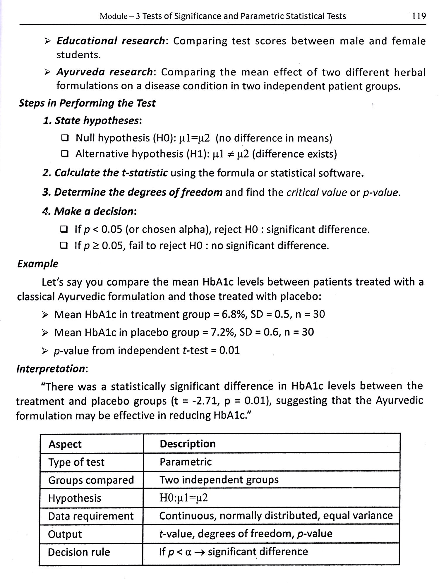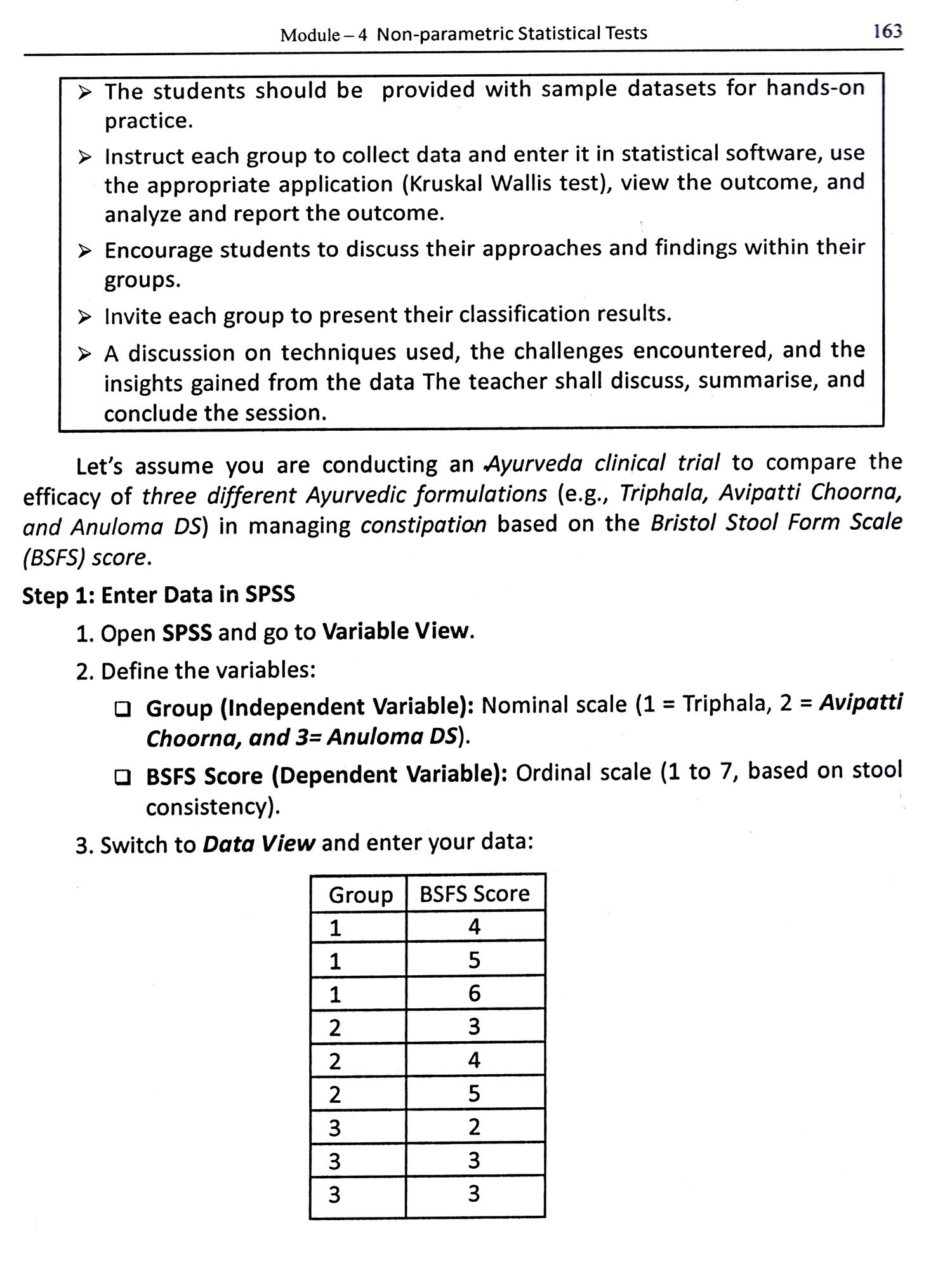 This handbook is conceived as a practical and accessible guide, tailored specifically for postgraduate students, scholars, and practitioners of Ayurveda. Statistics plays a pivotal role in postgraduate studies, serving as a bridge between traditional knowledge and evidence based validation. In the Ayurvedic context, it empowers researchers to design robust clinical trials, interpret complex datasets, standardize formulations, and evaluate therapeutic outcomes with objectivity. It also enhances the credibility of research findings, thereby contributing to the integration of Ayurveda into mainstream healthcare.