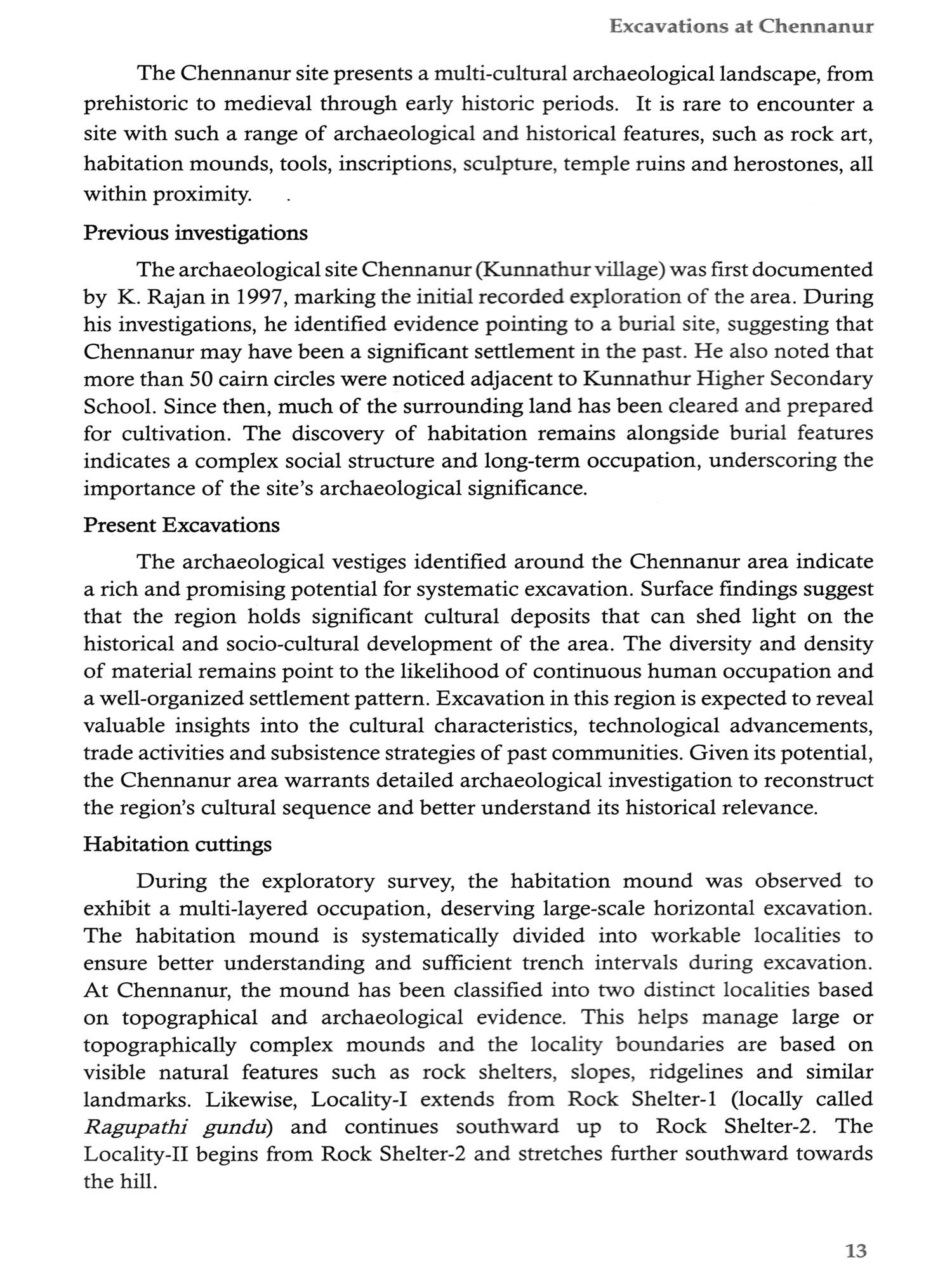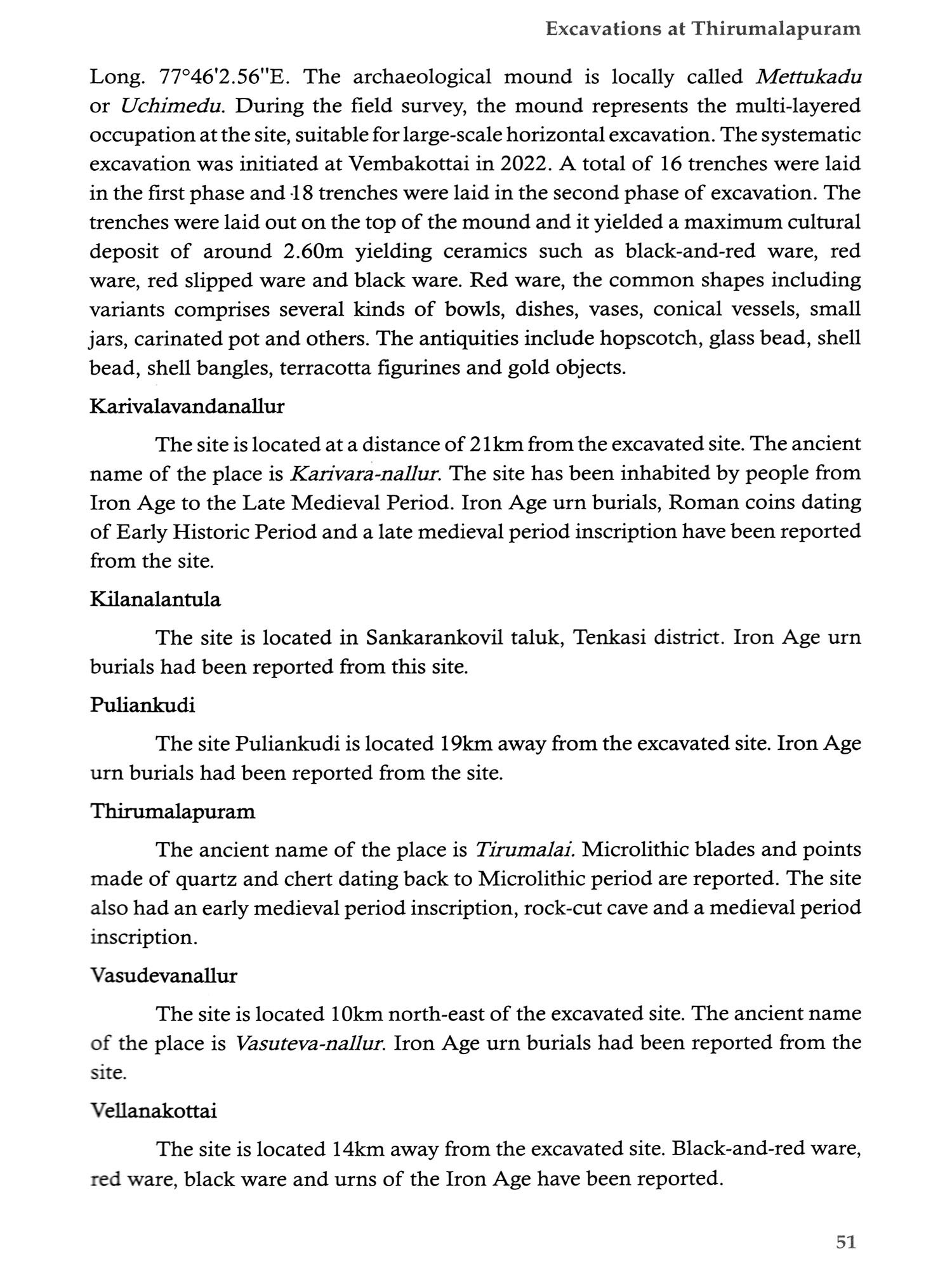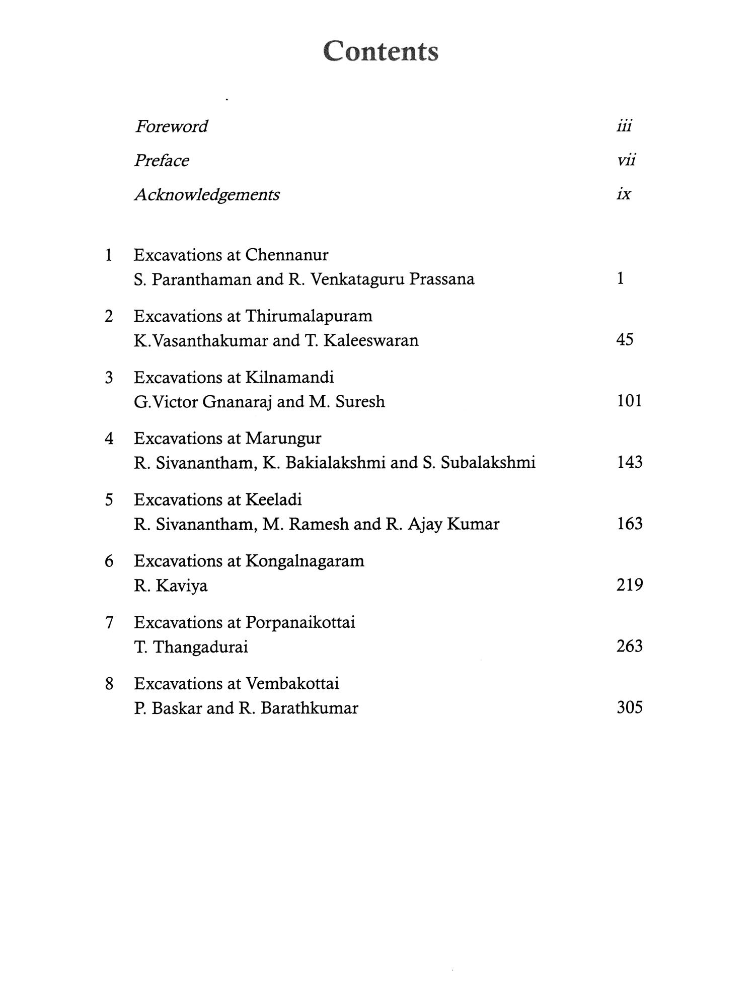The persistent and determined demand of the society and the nation compelled current administrators and archaeologists to launch a programme that fulfil the aspirations of contemporary society and also guides the future generation to grow as receptive and responsible citizens. The Tamil Nadu State Department of Archaeology planned a well-structured and target-oriented excavation programmes covering spatially the entire stretch of the state and chronologically the entire cultural periods so as to reconstruct the cultural history of Tamil Nadu in a more meaningful and purposeful manner. The excavations were carried out at eight sites covering from Prehistoric times to the historical period. Each excavation is unique in its way and provides considerable information to fill the cultural gaps of Tamil Nadu. The site Chennanur yielded the cultural horizon moving from microlithic to neolithic with an OSL date of 10,000 years. Urn burials placed within a rectangular enclosure were exposed for the first time in Tamil Nadu at Tirumalapuram, signifying the emergence of a kind of clan-based society during the Iron Age. The graffiti signs found on the urns stand as a unique opportunity for the archaeologists to estimate their chronological and cultural context. At Kilnamandi, the three stages of Neolithic tool production centres and their subsequent cultural transformation associated with sarcophagus burial within a pit or chambers were unearthed. For the first time, a radiocarbon date for graffiti mark was obtained in Tamil Nadu. The occurrence of Tamili inscribed potsherds unearthed at Marungur and the exposureof urn burials substantiate its earlier findings. Keeladi, the early historic urban centre, is further strengthened with more material evidence reflecting structural, trade and literary activities. Kongalnagram located on the ancient trade route displayed the position of russet-coated ware and also the nature of chamber tombs and their continuity in the early historic period. The continuity of the construction of forts and fortifications and its utility till today is well-exposed at Porpanaikottai. Thus, each archaeological site and each excavation programme revealed important cultural events, demonstrating the continuity and cultural prosperity. The present monograph attempts to highlight the cultural significance of each excavated site carried out in the year 2024-2025.