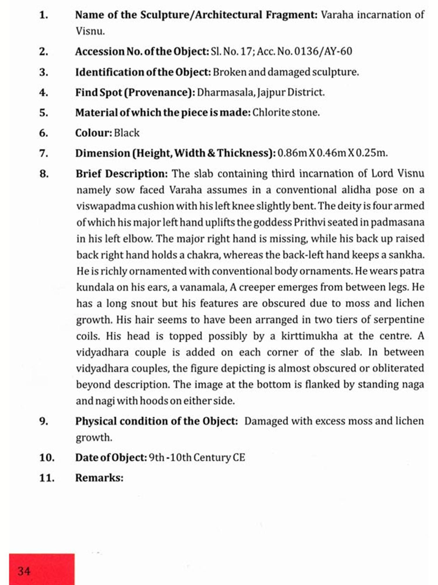 According to the convenience of the visitors, scholars, as well as researchers we have safely dichotomized the displayed antiquities into 3 sections namely, Brahminical, Buddhist and Jaina in two volumes. The Brahminical antiquities are embodied in Vol. 1, while the Buddhist and Jaina sculptures are documented in Vol. II. Many of the Brahminical sculptures have been collected from the ruins of early temples of Bhubaneswar and its vicinity and others parts of Odisha. Even some loose sculptures were acquired from the donors in the past. The Brahminical sculptures again divided into Vaishnava, Saiva and Sakta images along with semi-divine figures like Astadikpala, Navagraha, Dvarapala. Besides, the collection also includes the secular sculptures of Nayikas, Mithuna figure, Naga Nagi, lion motifs and scroll works. The antiquities of Asokan pillar, lion, Yaksa Yakshi, Naga Nagi, sculptures of the Buddha in different postures, Bodhisattva, Manjushri, Tara, Prajnaparamita, Marichi, etc. constitute the veritable plethora of Buddhist art of Odisha. The importance of Buddhist antiquities has been increased in the wake of recent discoveries of antiquities from several explorations and excavations carried out in recent years. Similarly, we have also a few Jaina Tirthankaras image like Mahavira, Adinath, Parsvanatha, Santinatha, Ajitanatha, etc.