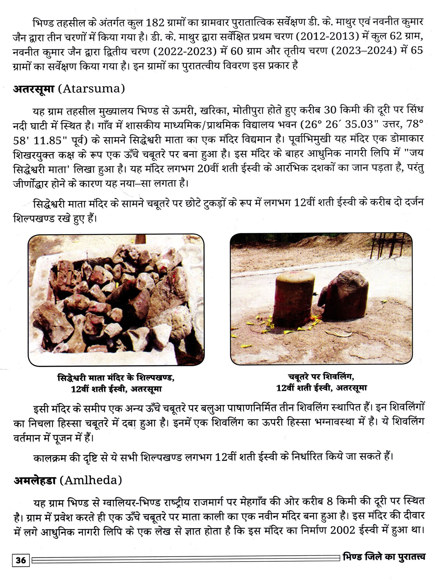 प्रस्तुत् पुस्तक भिण्ड जिले के ग्रामवार सर्वेक्षण-प्रतिवेदनों के आधार पर दो भागों में तैयार की गई है। इस पुस्तक के संकलन का कार्य डॉ. नवनीत कुमार जैन, पुराविद् द्वारा तथा इसे प्रकाशन योग्य बनाने में पुरातत्त्वीय अधिकारी डॉ. रमेश यादव की प्रभावी भूमिका रही है।