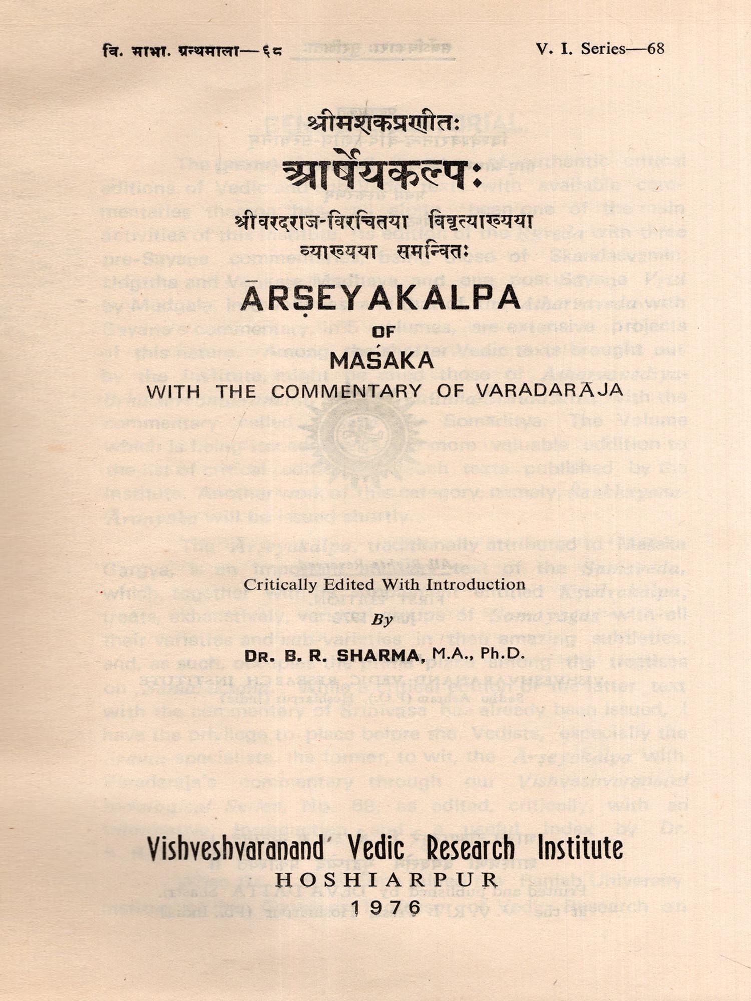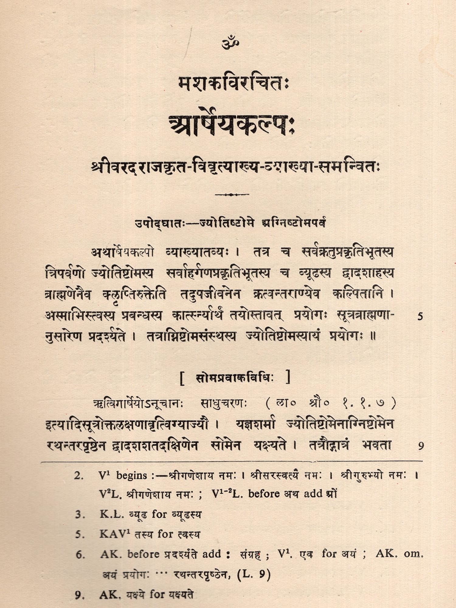 The Arseyakalpa of Samaveda is now being brought out for the first time with the commentary of Varadaraja. This is a major basic work of great importance in Srauta-literature in general and Saman technical works in particular. The commentary of Varadaraja with his very in-formative Upodghata dealing, in detail, with the Jyotistoma and Vyudha-Dvadasaha sacrifices has enhanced the importance and reference-value of this already important major treatise in Srauta-literature. Varadaraja, a Sri-Vaisnava, who must have lived in early 16th century, any way before Srinivasa, the commentator of the Ksudrakalpa, was a great ritual authority. This commentary of Varadaraja on the Arseyakalpa read with his Dasatayi on the Pratiharasutra, which he wrote before he took up the present work, would reveal the depth of his knowledge and vastness of his learning of this most abstruse branch of Vedic discipline.
