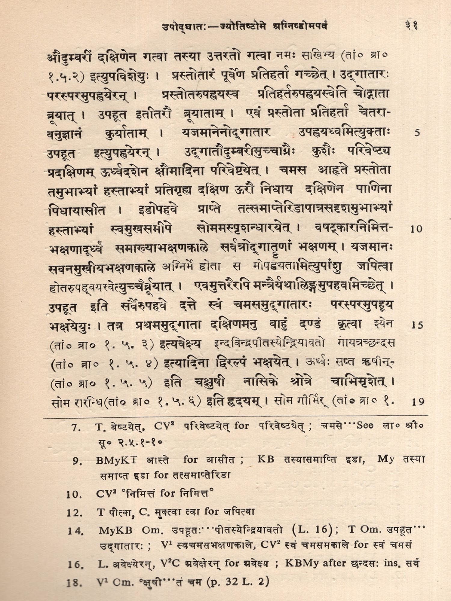 but there are a few exceptions noted to this rule where the ganas are found cited from the Gramegeya and Aranyegeya. The Ars.K. tells us which melodies built on which verses are to be sung in different stotras pertaining to various Soma-rituals treated therein. It cites the pratika or the first line of a verse, but it is immediately understood that we have to take the trea that begins with that pratika or chant the verse or group of verses commencing with that line cited therein. There are melodies which are built on more or less than a trea and in such instances the Ars.K. clearly guides us saying the number of seas or part thereof or the particular rea from a group of reas that are to be sung in such contexts. There are places where the Ars.K. is silent as to the number of reas to be sung on a given melody, since it is assumed that a reader, who would always be one knowing the rituals and specialised in the field, would at once understand it from the context and also from the indications that often follow, e.g., गौरीवित-मनुष्टुभि. The melody of gaurivita, if specially mentioned as in anustubh metre, will always be based on a single rea. Very often the Ars.K. expressly says एकस्याम् अध्यास्यायाम्, अनुरूपः, प्रतिपत्, etc.-all indicating a particular verse or a part thereof from a trea. Whenever the Ars.K. feels that the Kalpa of a ritual already described by the Tand.Br. is enough and that there is no necessity of its repetition, it skips over it by saying that क्लृप्तः, e.g., क्लुप्तो ज्योतिष्टोमोऽतिराजोऽषोडशिकः. The commentator, however, in such places gives the Klptis and necessary description of such rituals and thus bridges the gap. While Agnihotra, Isţi and Pasuyaga are the legitimate provinces of the Bgveda and Yajurveda, and are described, in greater detail, in the relevant literature the major Soma sacrifices representing the four Jyotistoma-samsthas and the Vajapeya, Rajasuya, Asvamedha, Dvadasahas and the Sattras are dealt with at length in the corps of Srauta literature. In these Soma sacrifices the Rgvedic (होतृगण) and Yajurvedic (अध्वर्युगण) priests have their own functions, besides their primary duties such as chanting of mantras from their respective Vedas at the prescribed time and place in the course of performance of sacrifices. The Saman priests (उद्गातृगण), on the other hand, are primarily concerned in singing Saman chants mostly sitting near the post of a fig tree in the sadas in the manner prescribed in the Srauta-sutras. The Kalpasutra of Samaveda assumes the responsibility to describe what is called औद्द्यान, duties and functions of उद्द्यातृगण in respect of these Soma sacrifices.