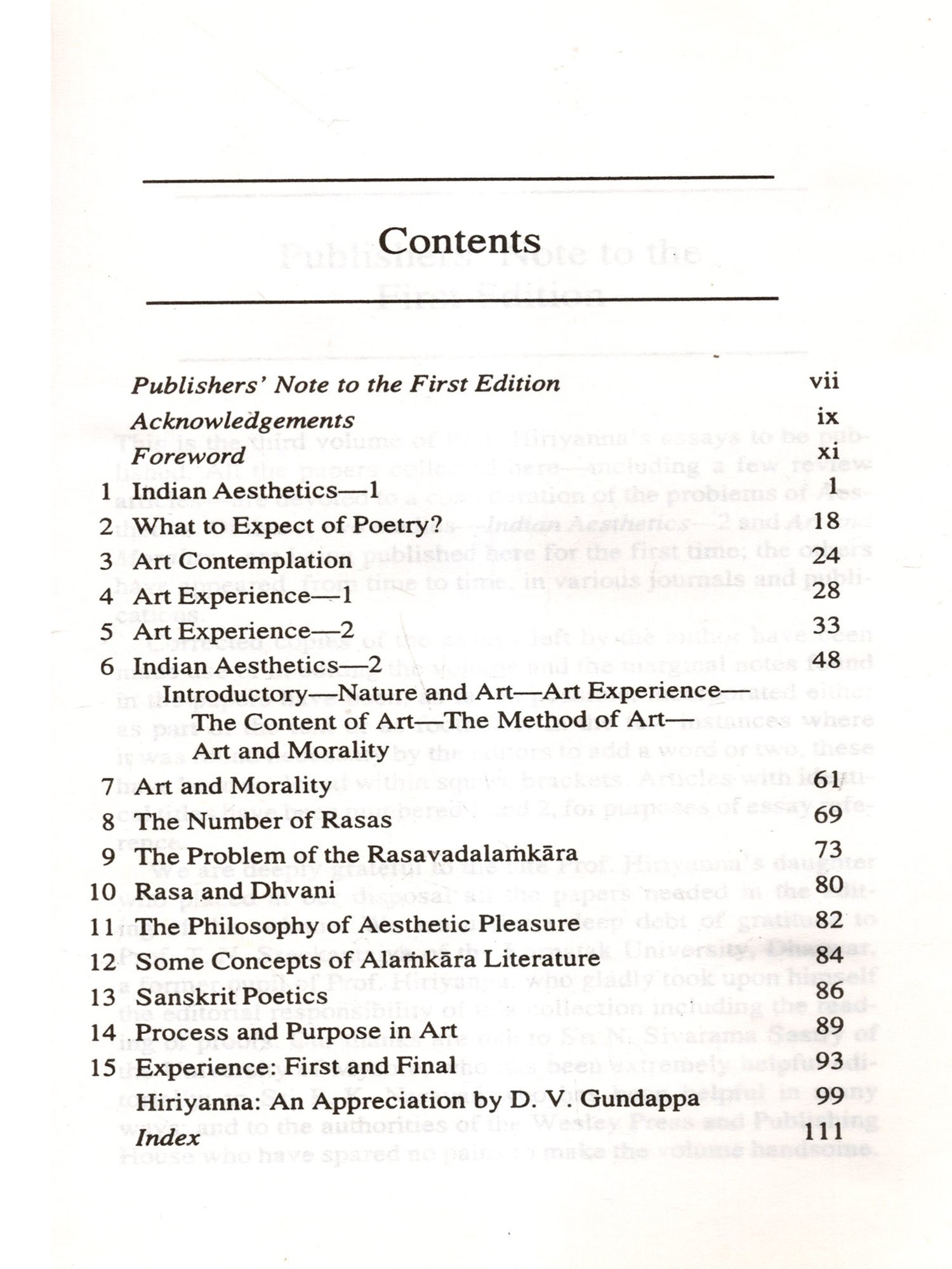 These essays, particularly 'Indian Aesthetics I' and 'Indian Aesthetics II', are thus landmarks in scholarship on Indian aesthetics. Although Hiriyanna does not discuss the interpretation of the theory of Rasa from other philosophic schools, he elucidates the theory from the point of Sankhya in a masterly fashion.