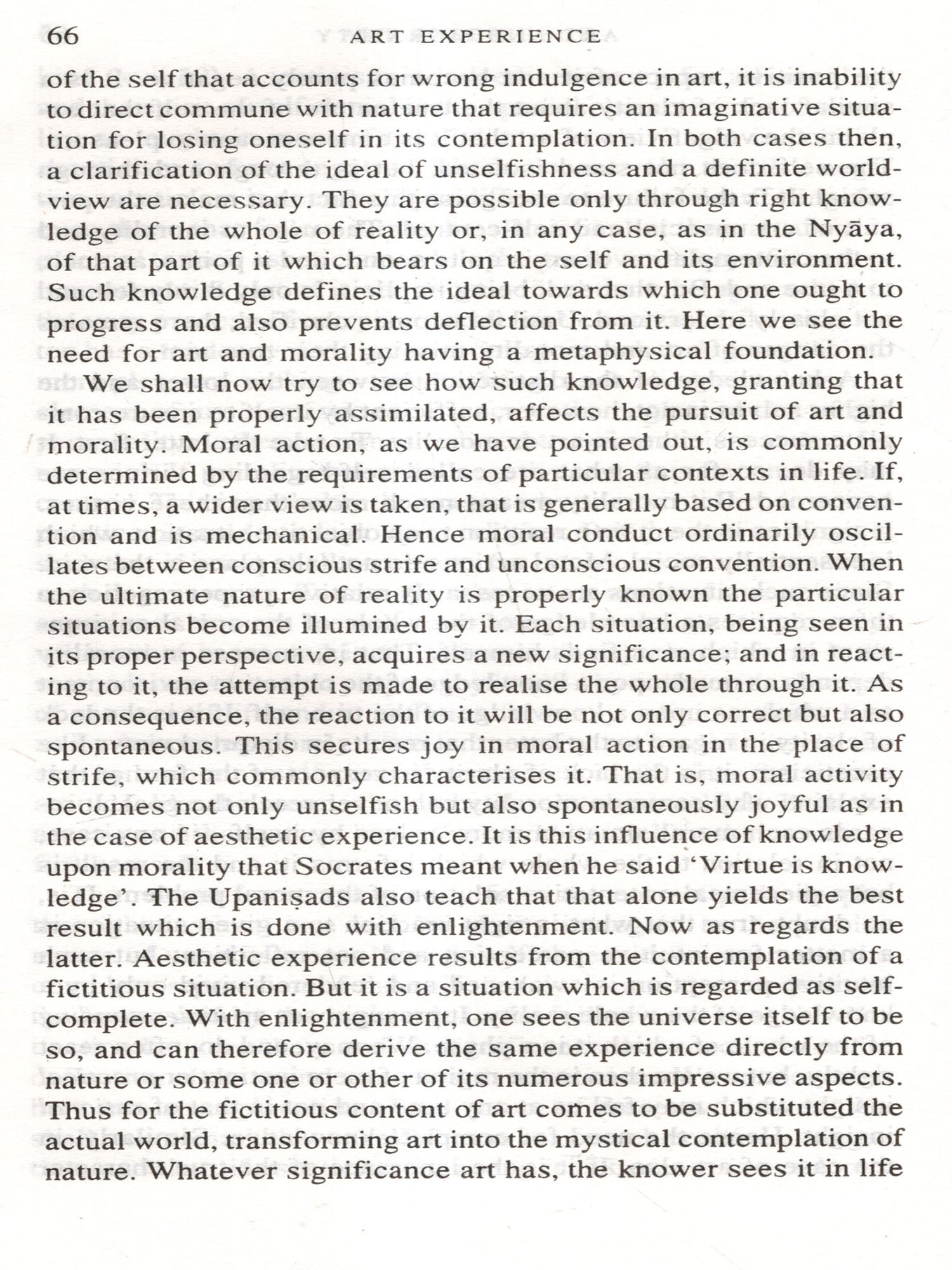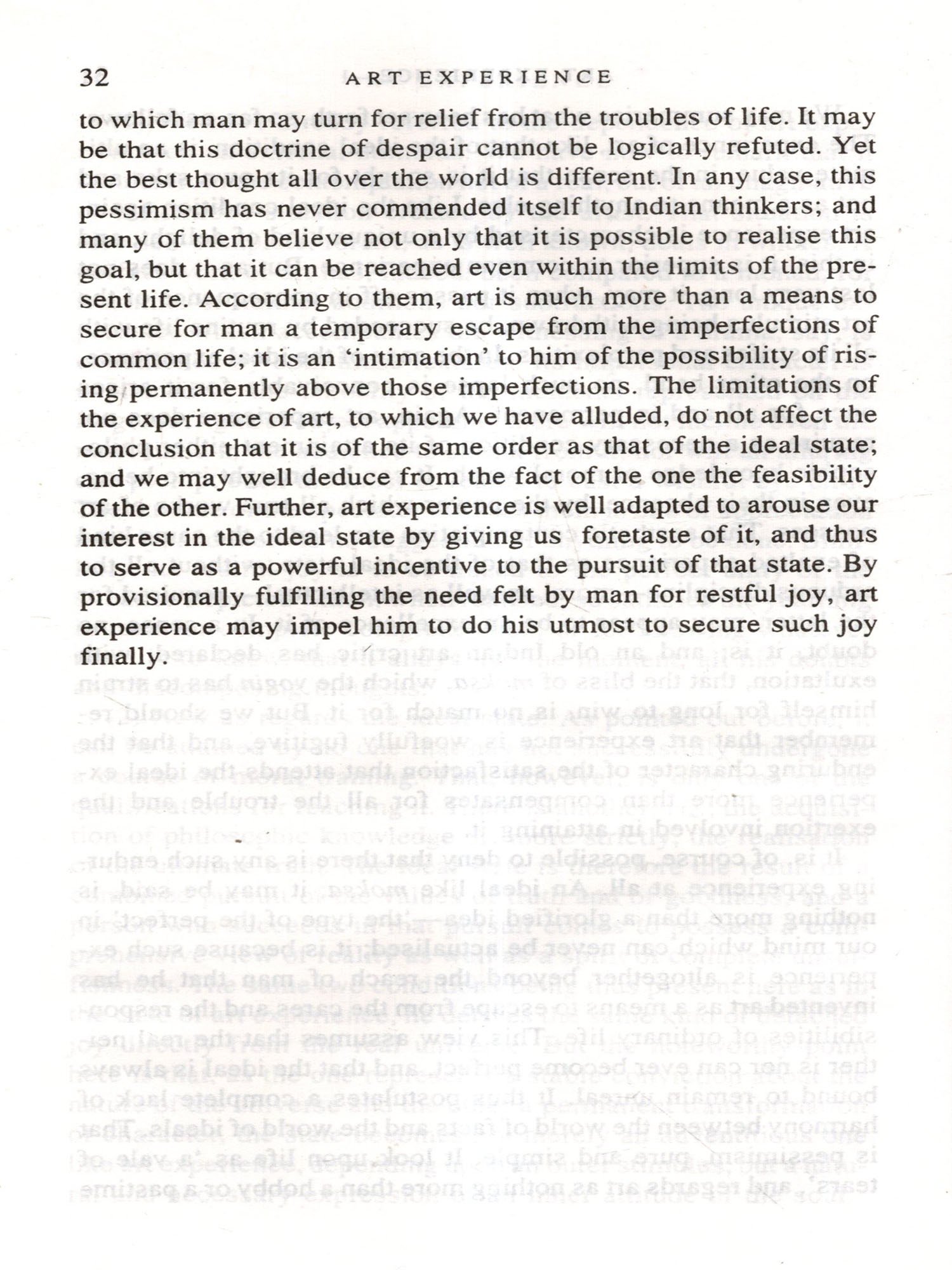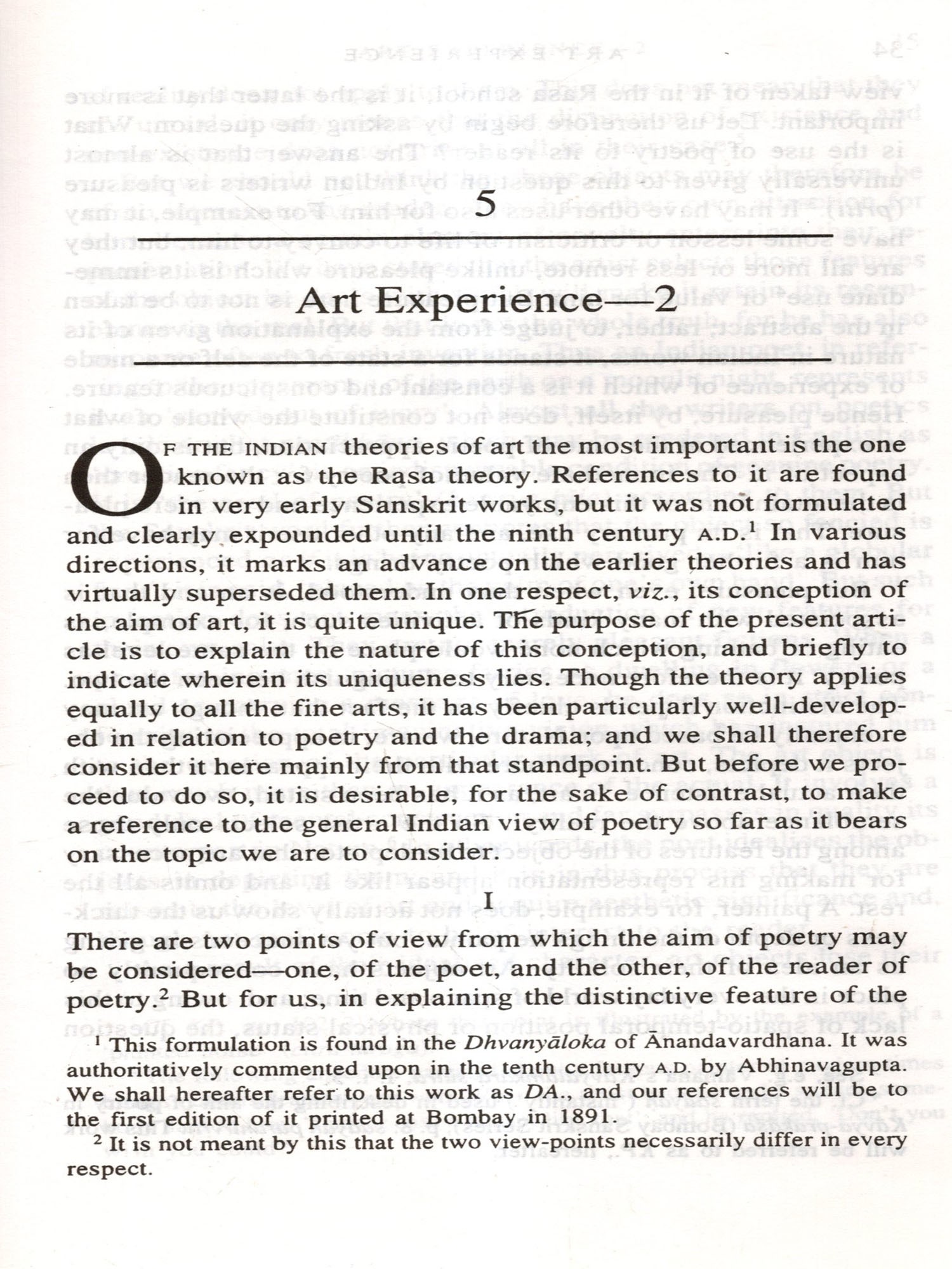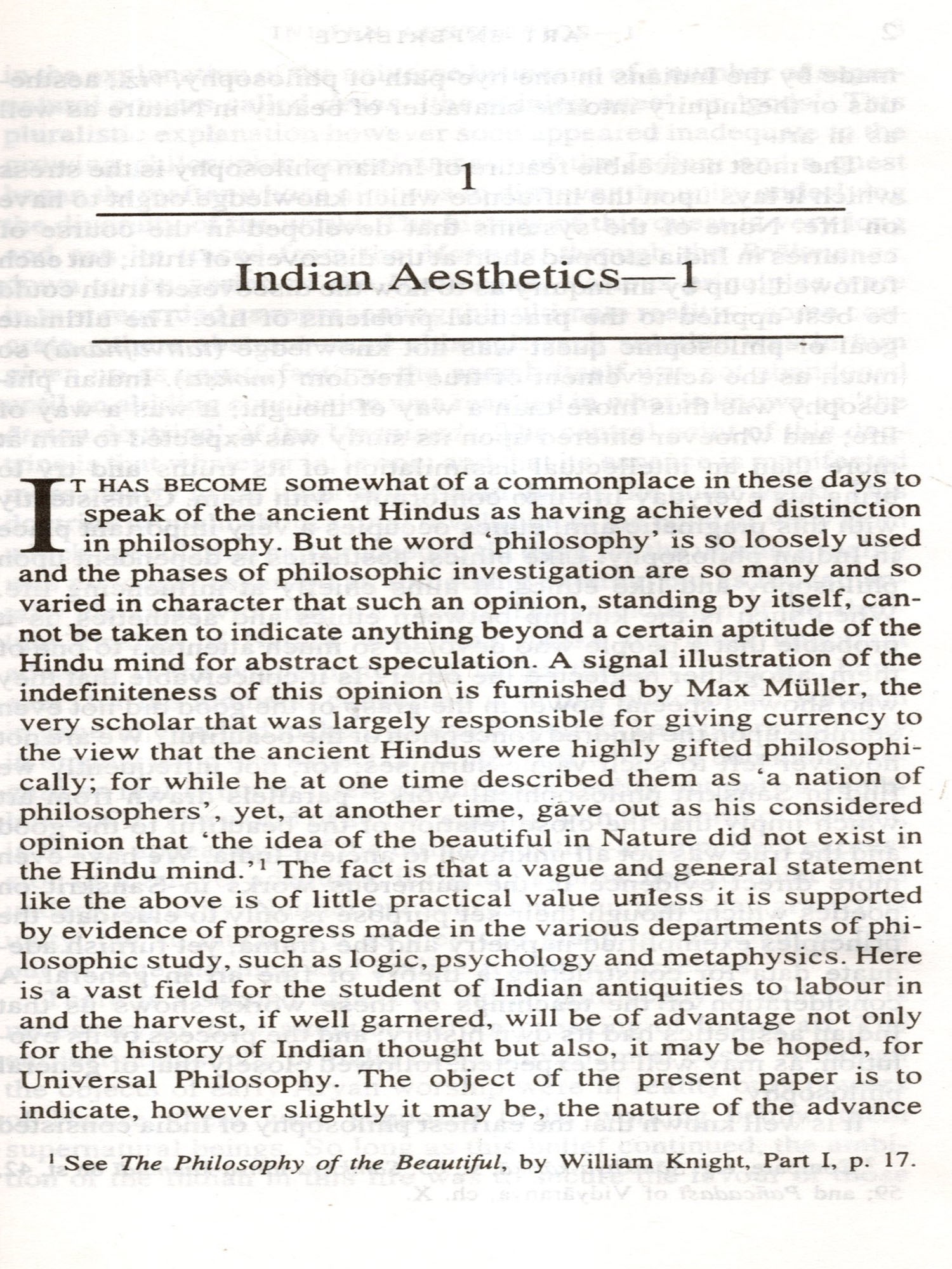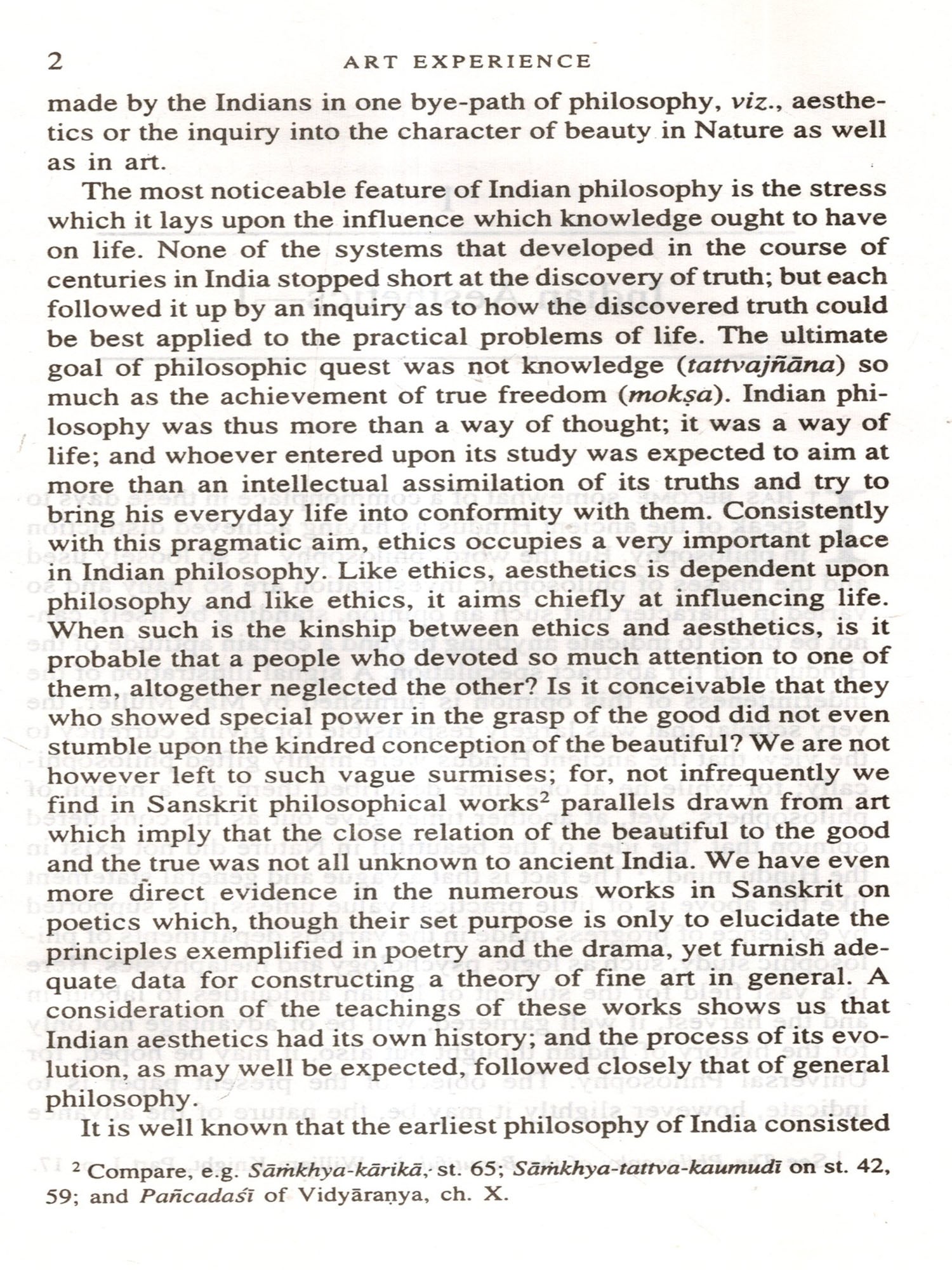 For decades Art Experience has been a lamp which has provided illumination to many a serious student of Indian aesthetics. It first appeared in 1919. At that time there was a general acceptance of the view that while there were many philosophic schools in India, aesthetics was not the concern of any of the systems. Alongside was the heated debate on the nature of Indian art. Ruskin, Birdwood, William Archer and Sri Aurobindo had crossed swords. In many essays now included in Foundations of Indian Culture, Sri Aurobindo denounced these mistaken notions. A.K. Coomaraswamy joined the debate first in defence and later to expound the metaphysics which governed the art. Although the text of the Natyasastra had been located, neither authentic editions nor the commentary of Abhinava Bharati be-came the subject of serious discourse in the disciplines of either philosophy or aesthetics.