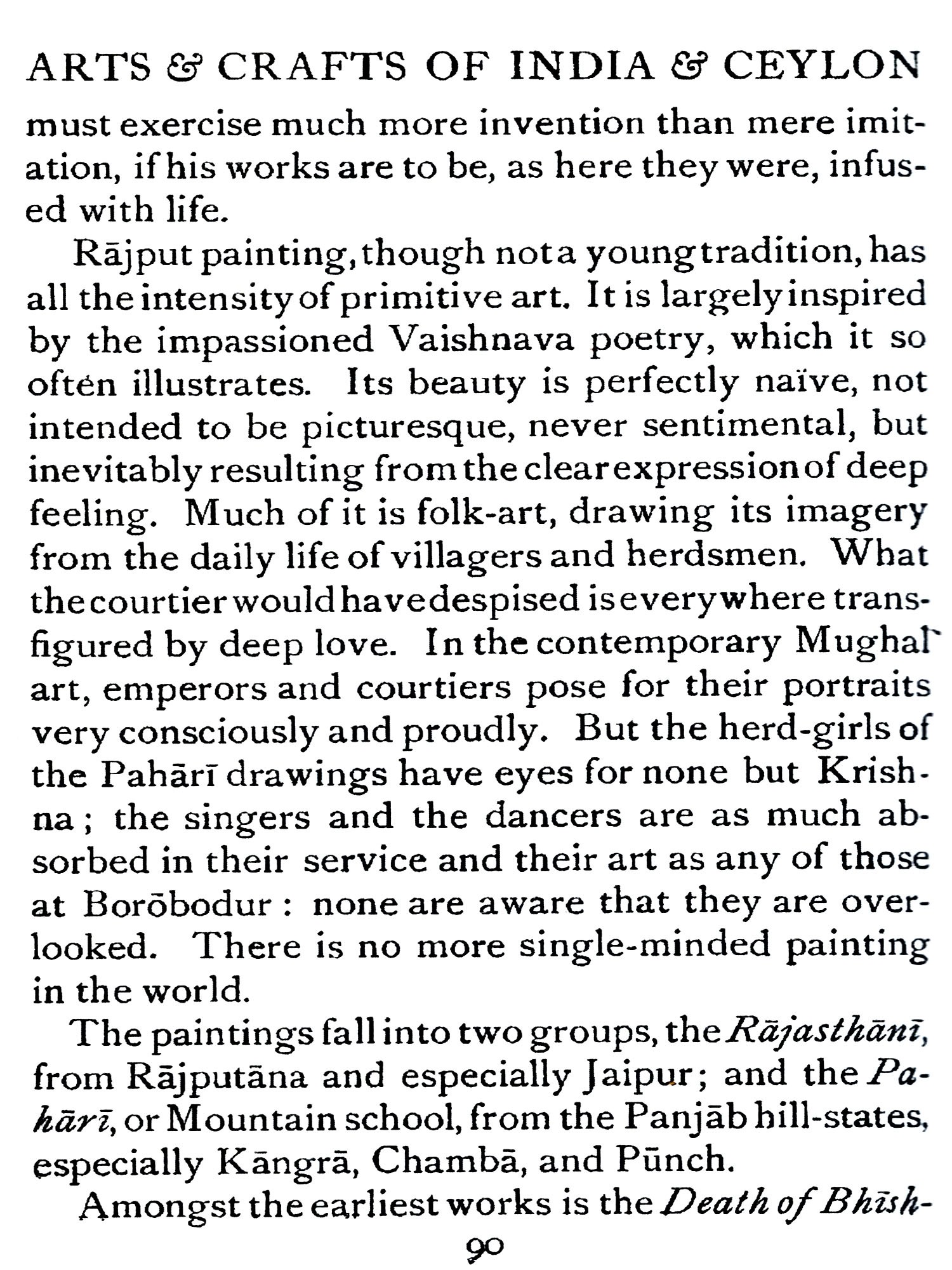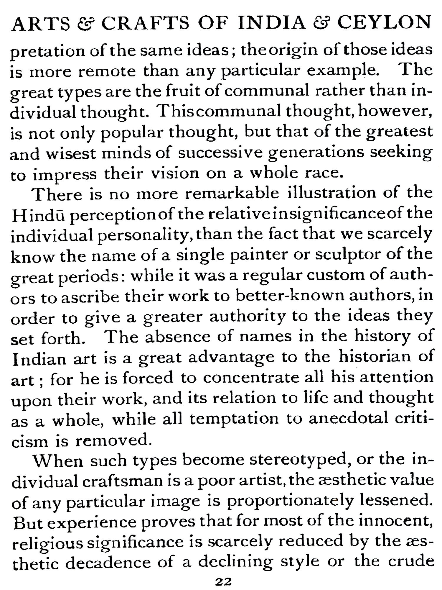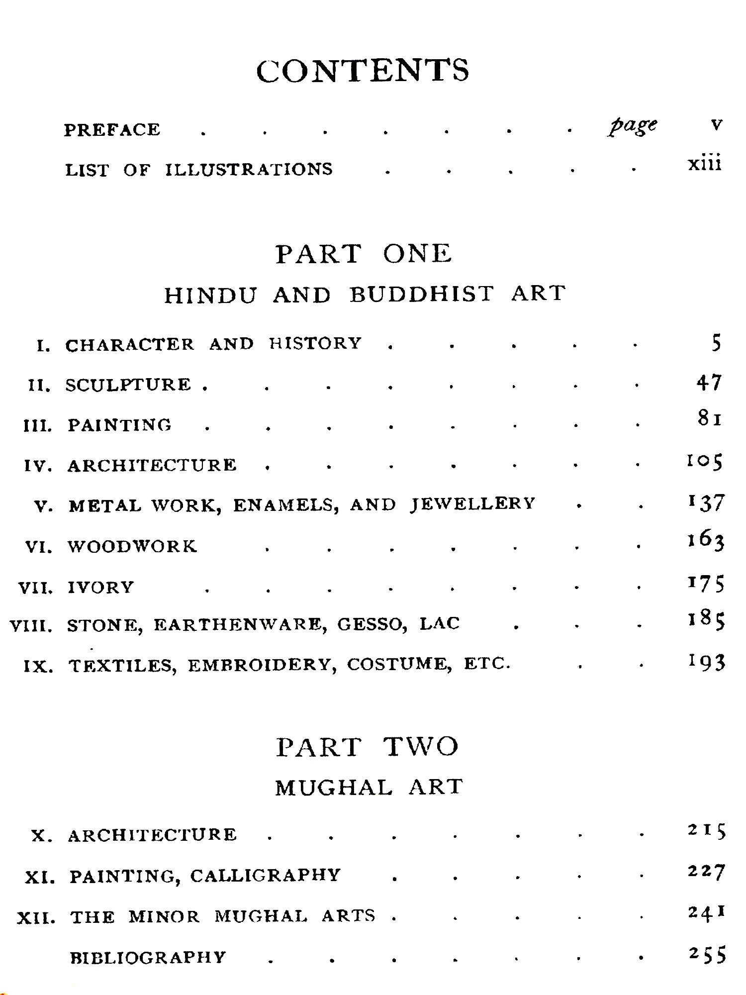 That the work is divided into two parts, the first concerned with Hindu and Buddhist art, the latter with the Musulman arts, is solely to facilitate an understanding of their historical relations and psycho-logical development: I do not forget that in almost every art and craft, as also in music, there exists in Hindustan a complete and friendly fusion of the two cultures. The non-sectarian character of the styles of Indian art has indeed always been conspicuous; so that it is often only by special details that one can distinguish Jain from Buddhist stupas, Buddhist from Hindu sculpture, or the Hindu from the Musulman minor crafts. The one great distinction of Mughal from Hindu art is not so much racial as social; the former is an art of courts and connoisseurs, owing much to individual patronage, the latter belongs as much to the folk as to the kings.
