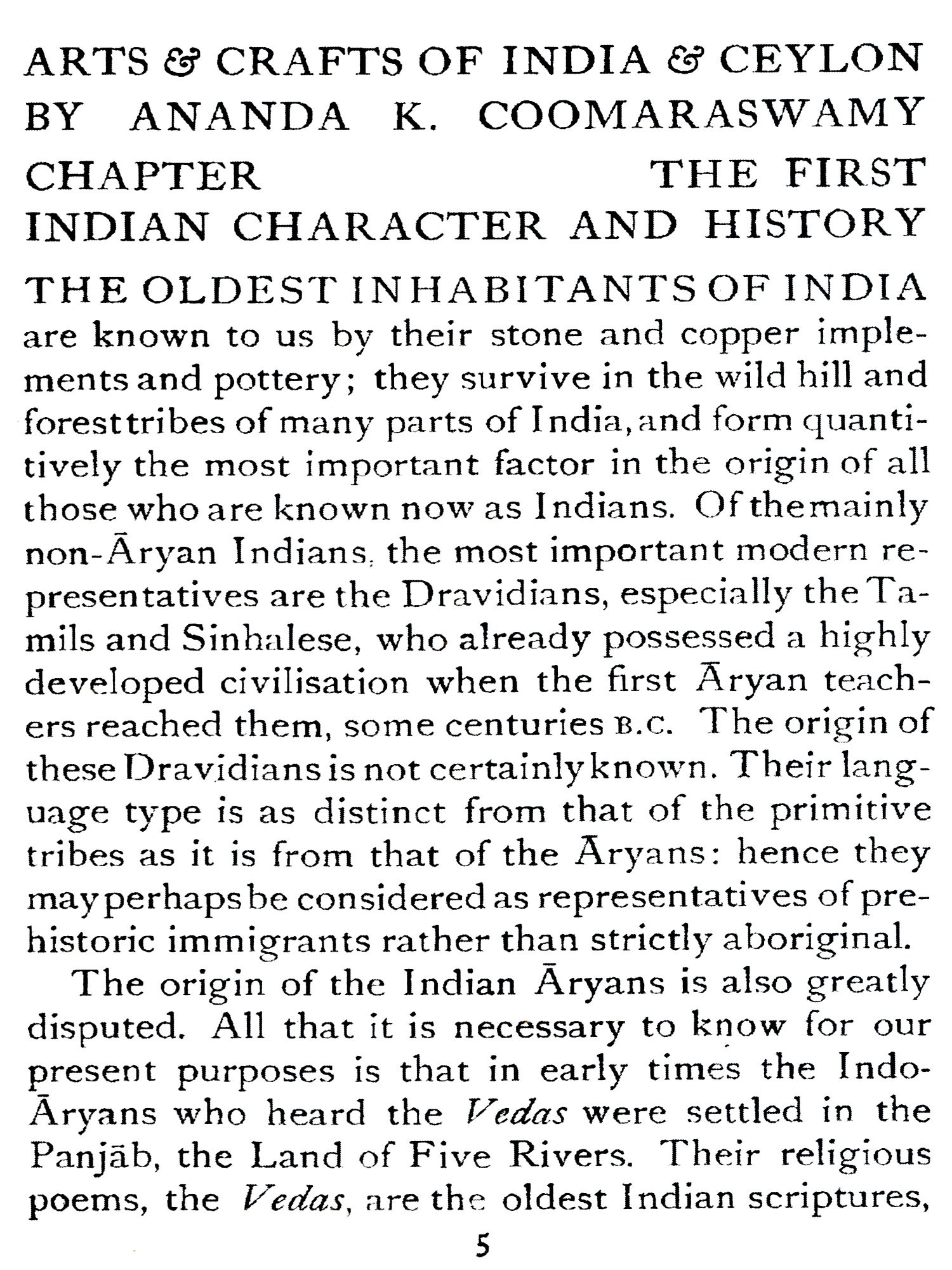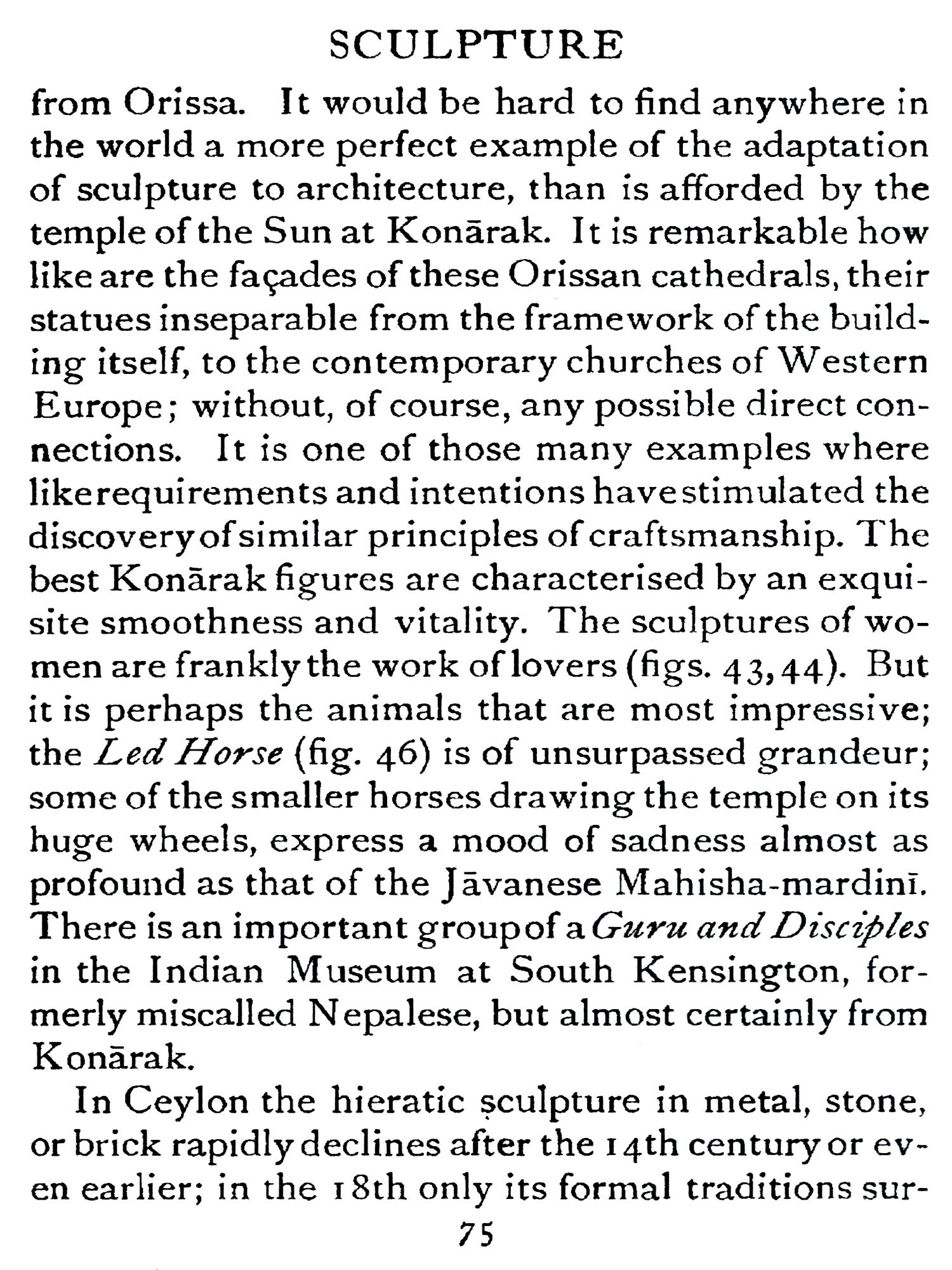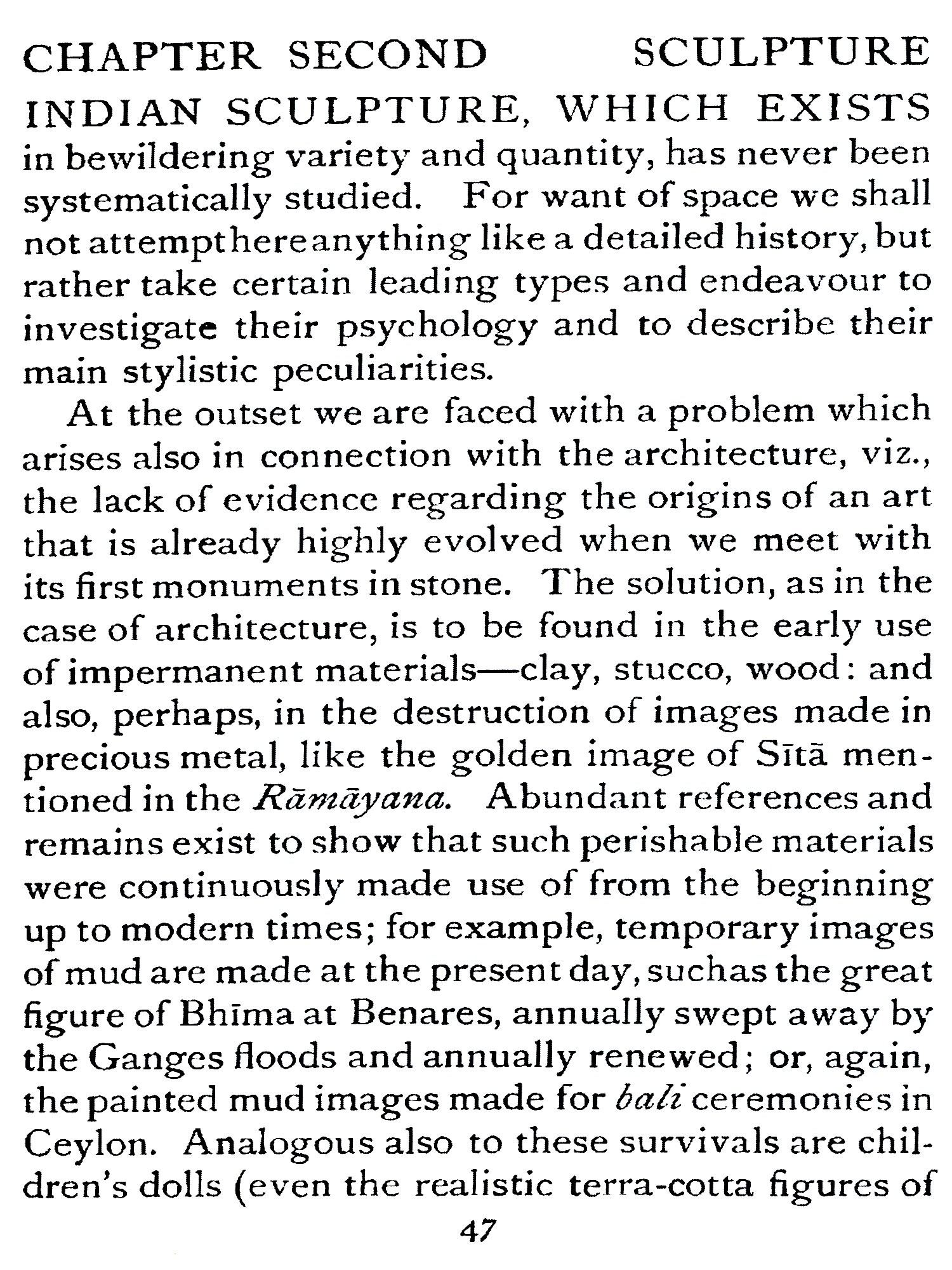 That the work is divided into two parts, the first concerned with Hindu and Buddhist art, the latter with the Musulman arts, is solely to facilitate an understanding of their historical relations and psycho-logical development: I do not forget that in almost every art and craft, as also in music, there exists in Hindustan a complete and friendly fusion of the two cultures. The non-sectarian character of the styles of Indian art has indeed always been conspicuous; so that it is often only by special details that one can distinguish Jain from Buddhist stupas, Buddhist from Hindu sculpture, or the Hindu from the Musulman minor crafts. The one great distinction of Mughal from Hindu art is not so much racial as social; the former is an art of courts and connoisseurs, owing much to individual patronage, the latter belongs as much to the folk as to the kings.