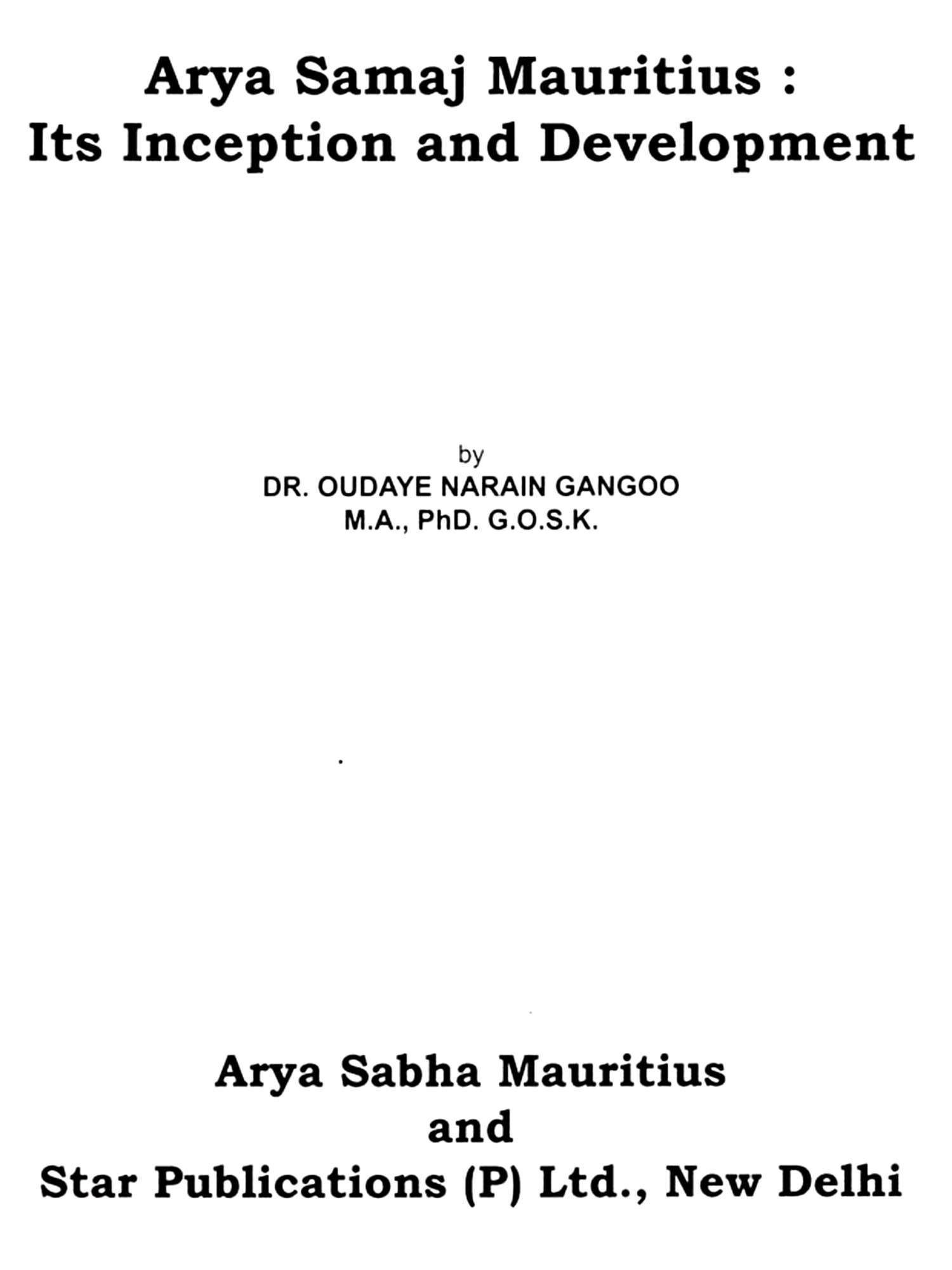Dr Gangoo is a versatile writer and has many books in Hindi and English to his credit. He is also Chief Editor of the 'Aryodaye' the mouthpiece of the Arya Sabhā Mauritius. That a person of his stature has undertaken to write the history of the 'The Arya Samaj movement in Mauritius and South Africa' is indeed a matter of pleasure and satisfaction.