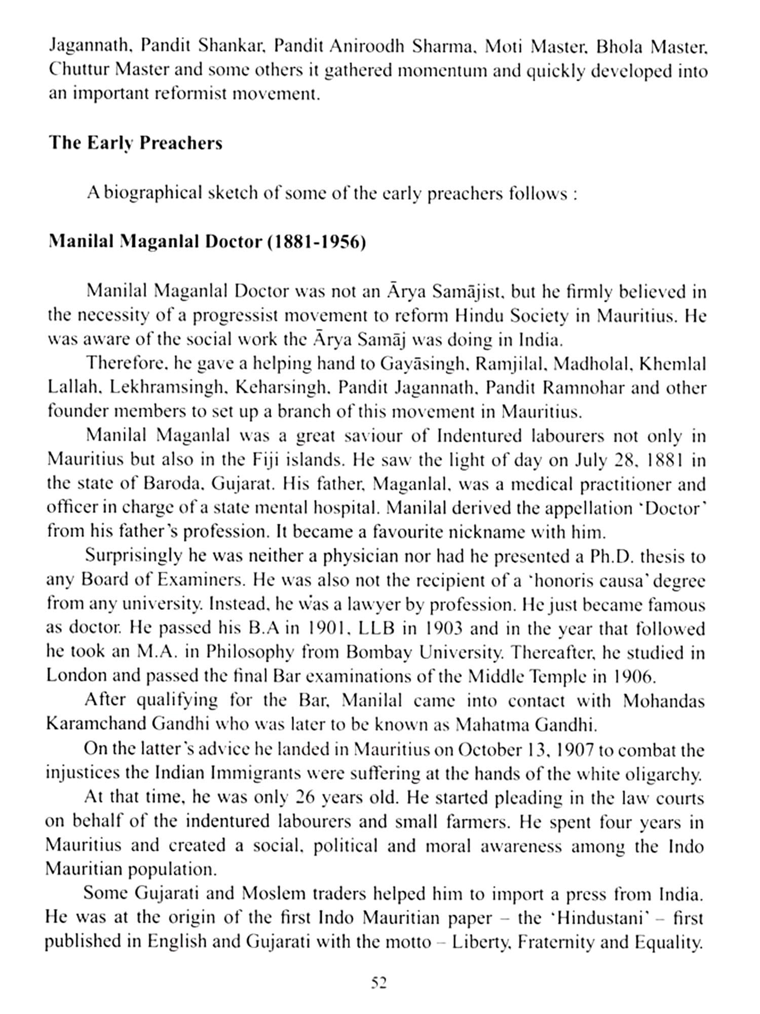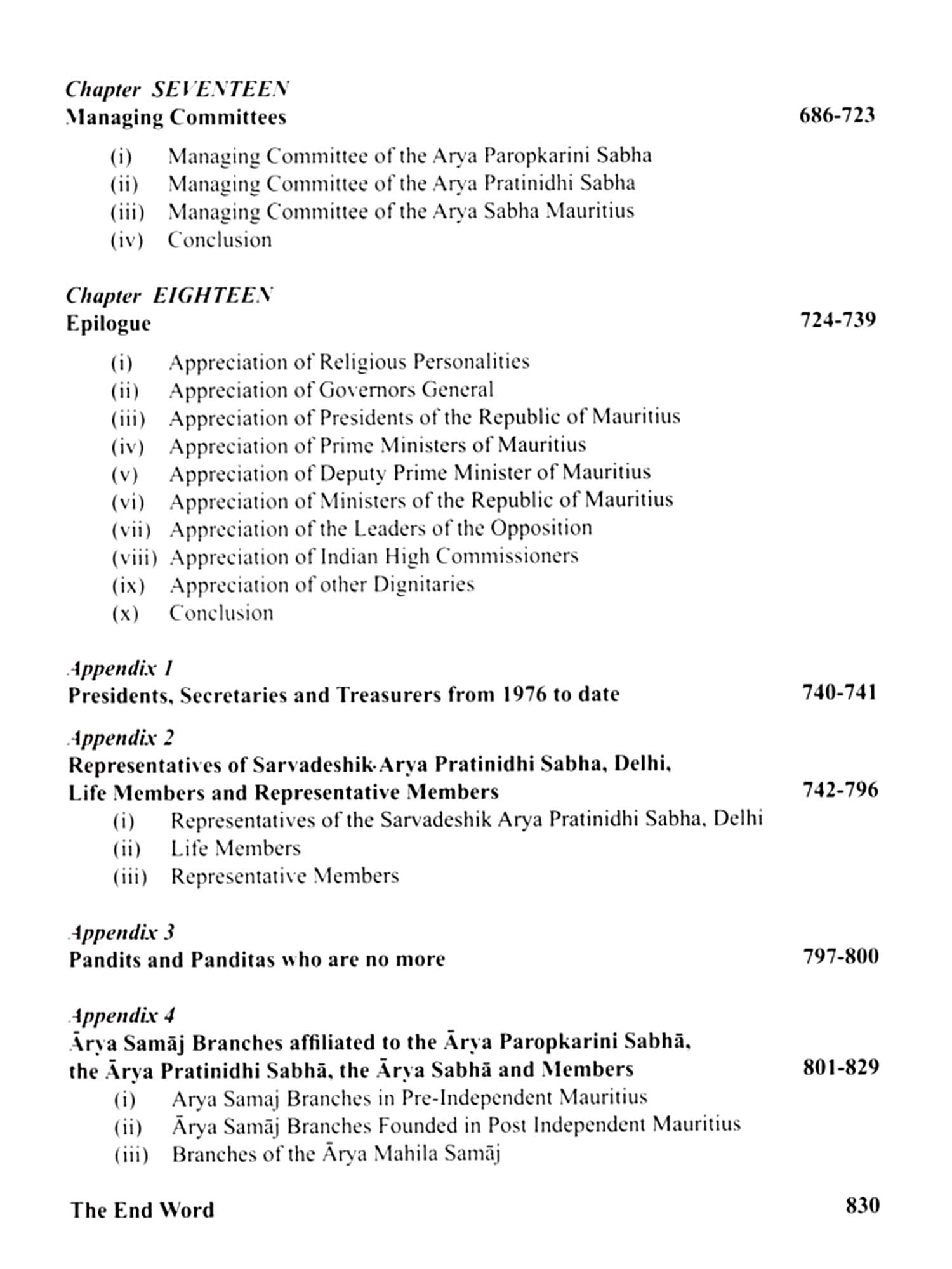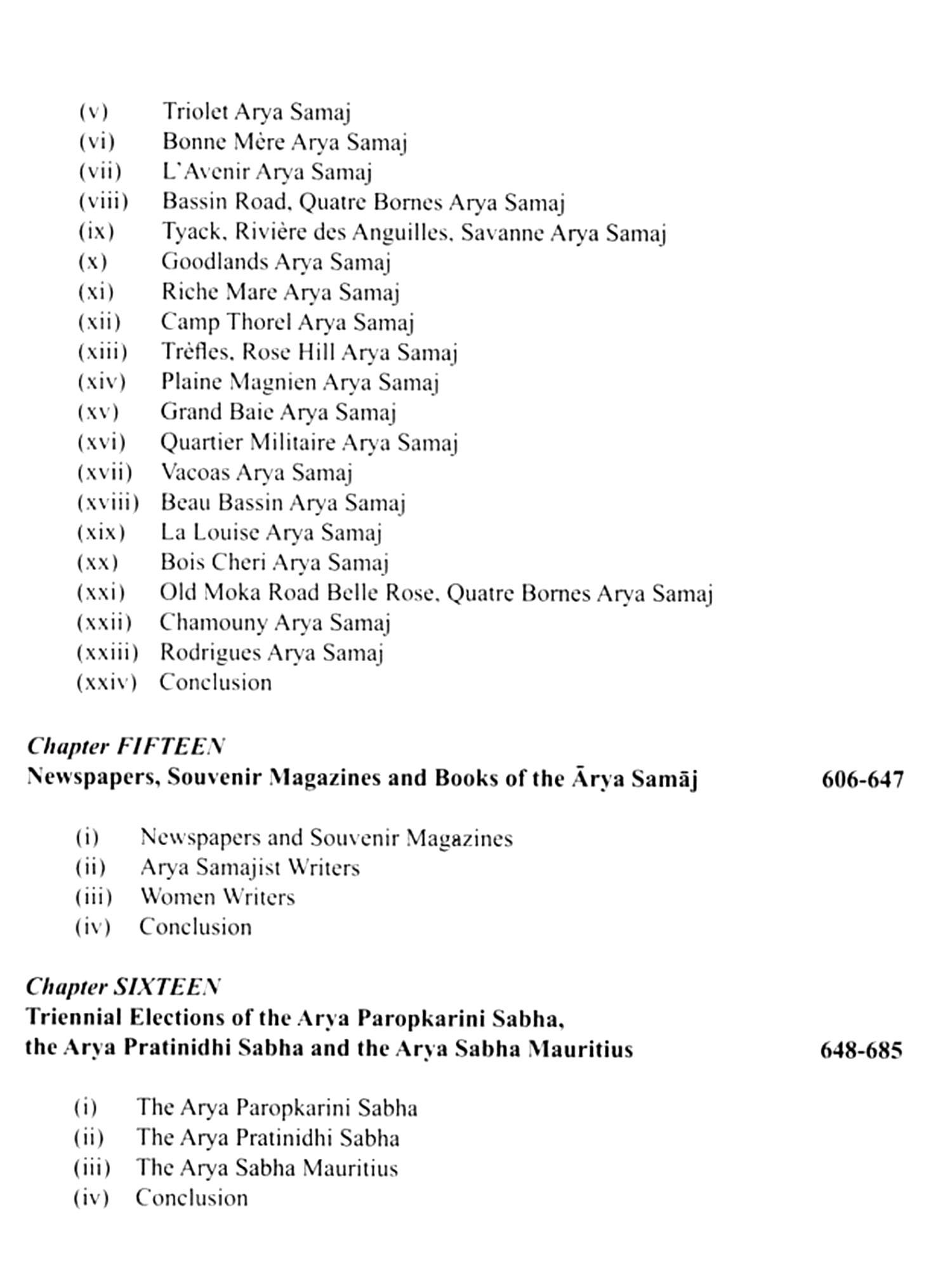 The second part is devoted to the history of the Arya Samaj movement in Mauritius. The 100-years of this dynamic movement are divided into four periods while section three deals with the activities of Arya Samaj in South Africa.