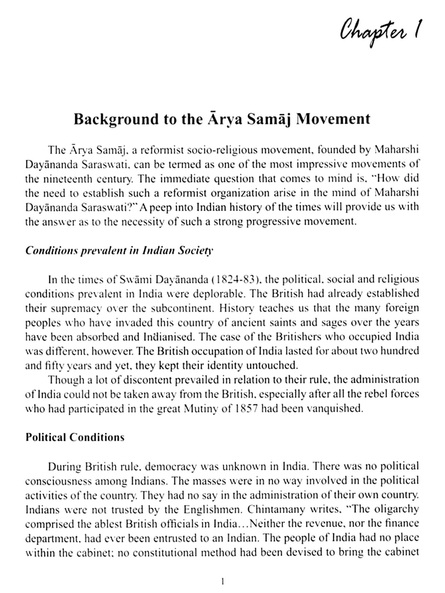 The book is divided into three parts. The first part deals with the conditions prevalent in Indian society at the time when Swāmī Dayānanda Saraswati appeared on the social landscape. In addition to a brief life story of the great Swami, his works and beliefs are succinctly discussed.