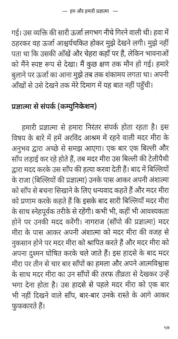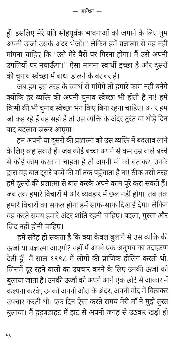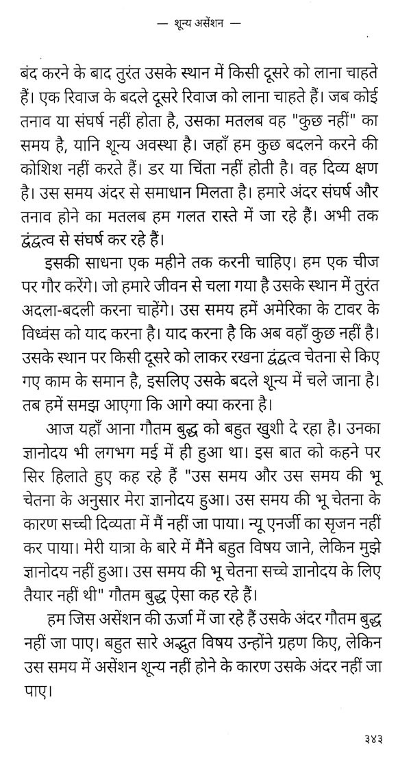 अब, मैं मन को खाली करने और संदेश पाने के अपने अनुभव के बारे में बताती हूँ। १९८४ का समय था, जब भी मैं कुछ सोचती थी तो अचानक मेरे विचार बंद हो जाते थे। इसका कारण ढूँढते हुए जब मैं अपने अंदर झांक कर देखती थी तो मैं अपनी सांस को रुका हुआ पाती थी। अंदर सब खाली होता था। ऐसे लगता था कि किसी ने फिल्म के चित्र को रोक दिया है। विचार नहीं होते थे, लेकिन वह साधारण खालीपन नहीं था। मेरे अंदर सब कुछ खाली लगता था। उस आनंददायक खालीपन पर ध्यान देती रहती थी। डर नहीं लगता था। इसमें कुछ डरने की बात ही नहीं थी। उस स्थिति पर मैं ध्यान देती थी। ज्यादातर उस समय मैं चल रही होती थी। इस तरह का अनुभव ज्यादातर कॉलेज से घर जाते समय होता था। यह सब कुछ मेरी भागीदारी के बिना ही होता था।