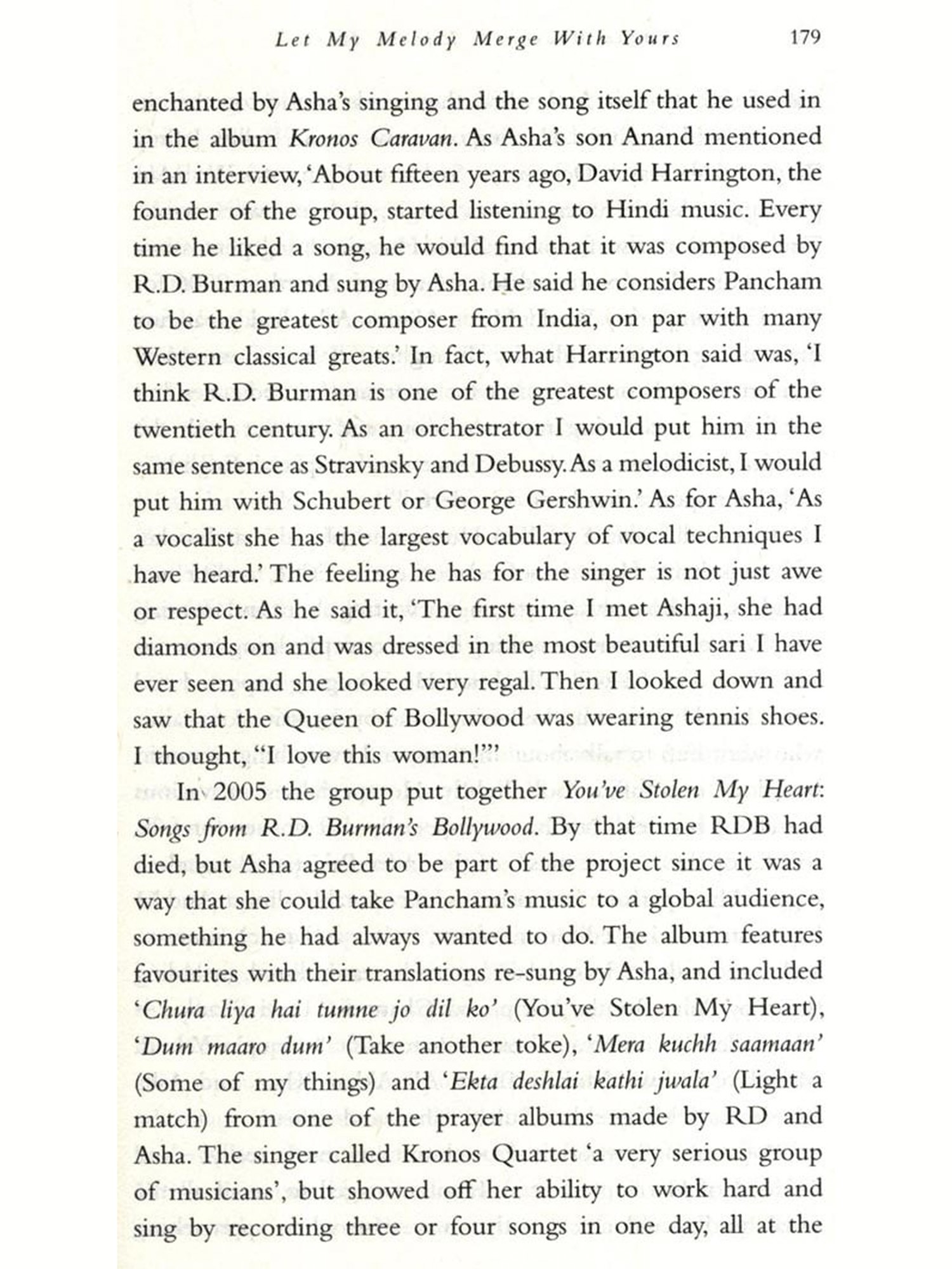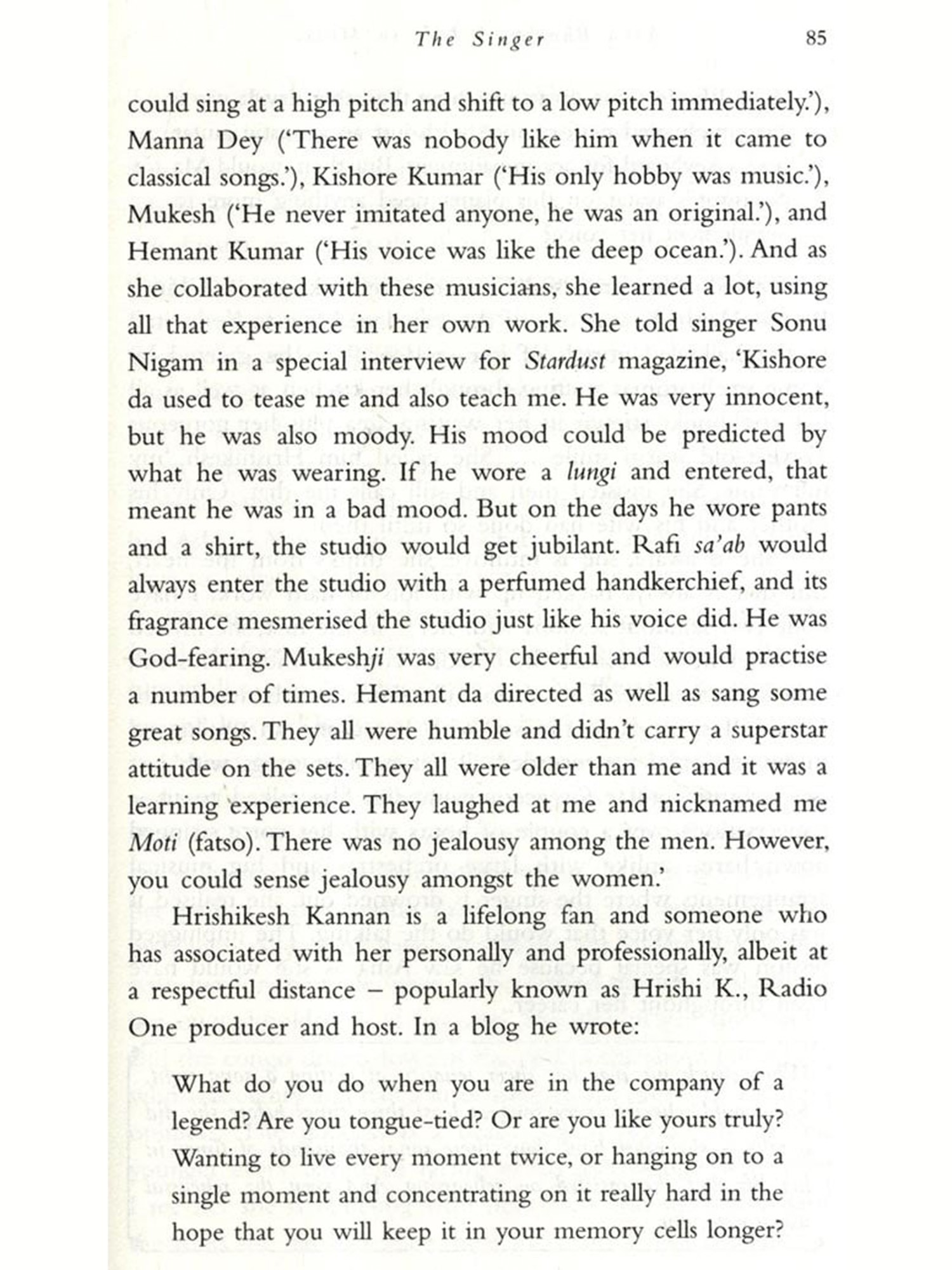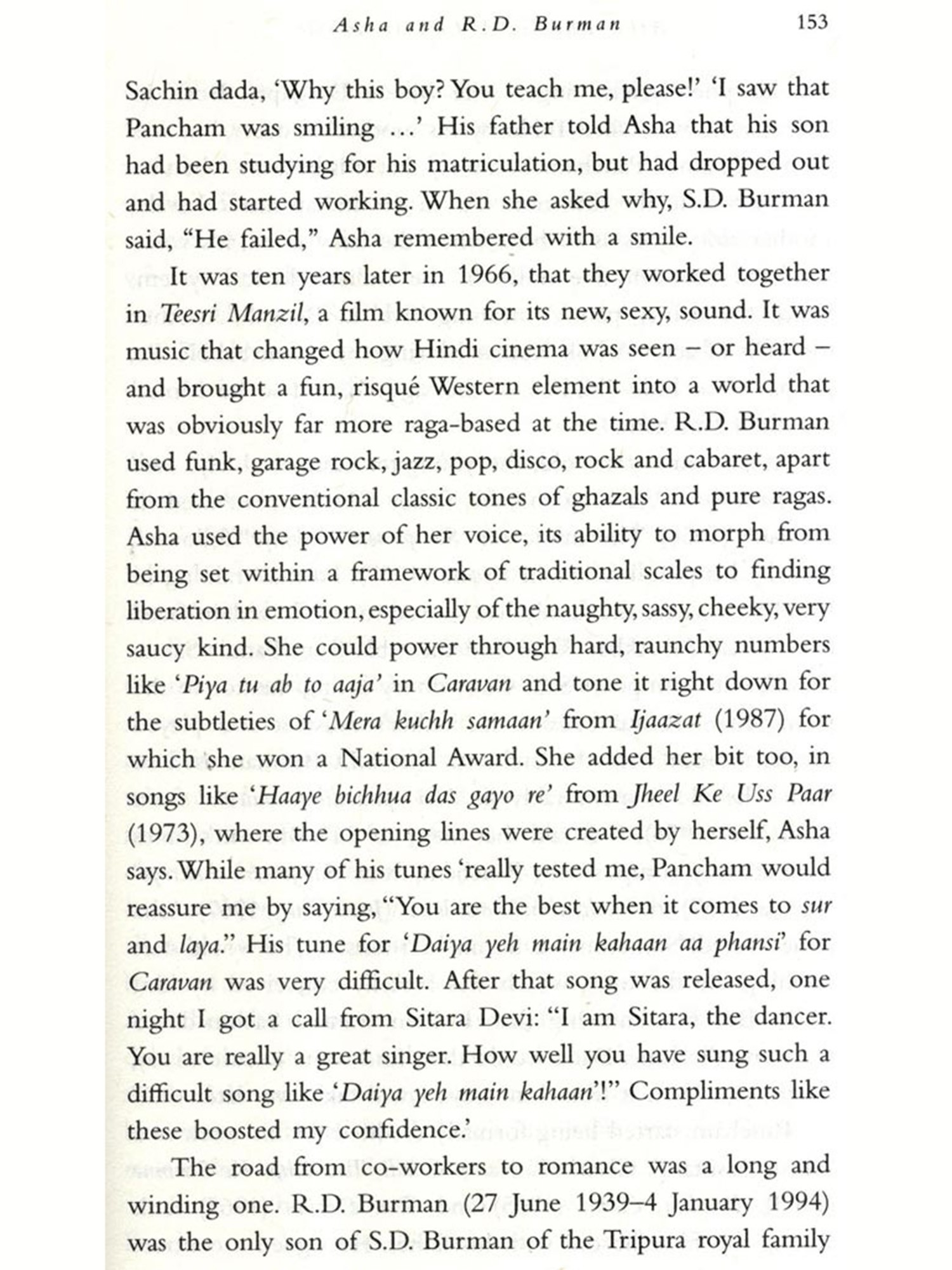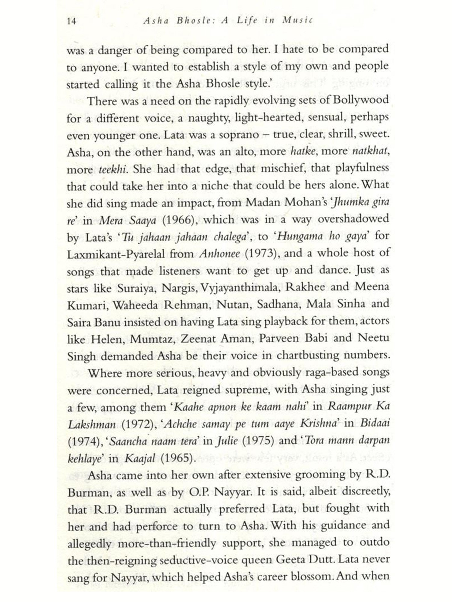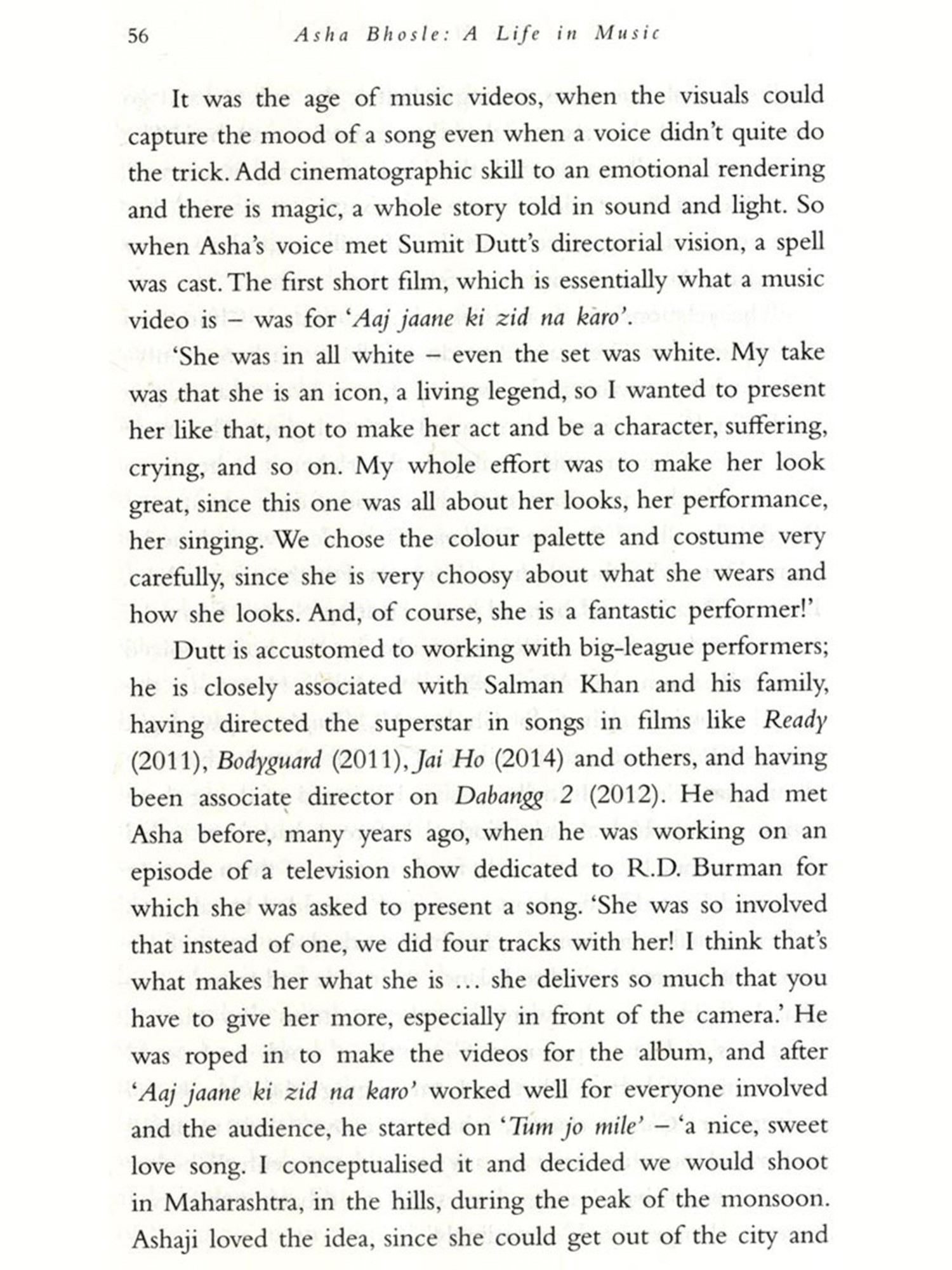 It was not that hard, indeed; it became almost impossible, frustrating, annoying and even funny at times. There were people who agreed to talk to me and then either vanished or were stricken with sudden illness. An infamously outspoken filmmaker agreed to chat and then refused to remember that he had spoken with me. A composer was enthusiastic and set a date and time for a meeting and then changed his phone number. A well-known poet refused me a conversation when he learned that I had not met or interviewed the subject of the book, who was very dear to him. There were some who, although not willing to talk to me themselves, were kind enough to suggest someone else, and give me their contact details. Hilariously, a famous ghazal singer in Pakistan responded amiably, but wanted me to renew his Tata Sky account before he would talk to me! And as all this was happening, I was reading interviews, articles, news reports, social media anything that popped up on Google, in conversation with people, in magazines and newspapers, on TV or even on the radio. I heard more film music than I had ever done and developed a weird taste for Indi-pop that I never thought I would. My driver, a fan, diligently listened to a radio show on which he had heard a story about Asha that he told me about; wherever he drove me to, we listened to that particular show and learned a lot from it about people I was never going to write about.