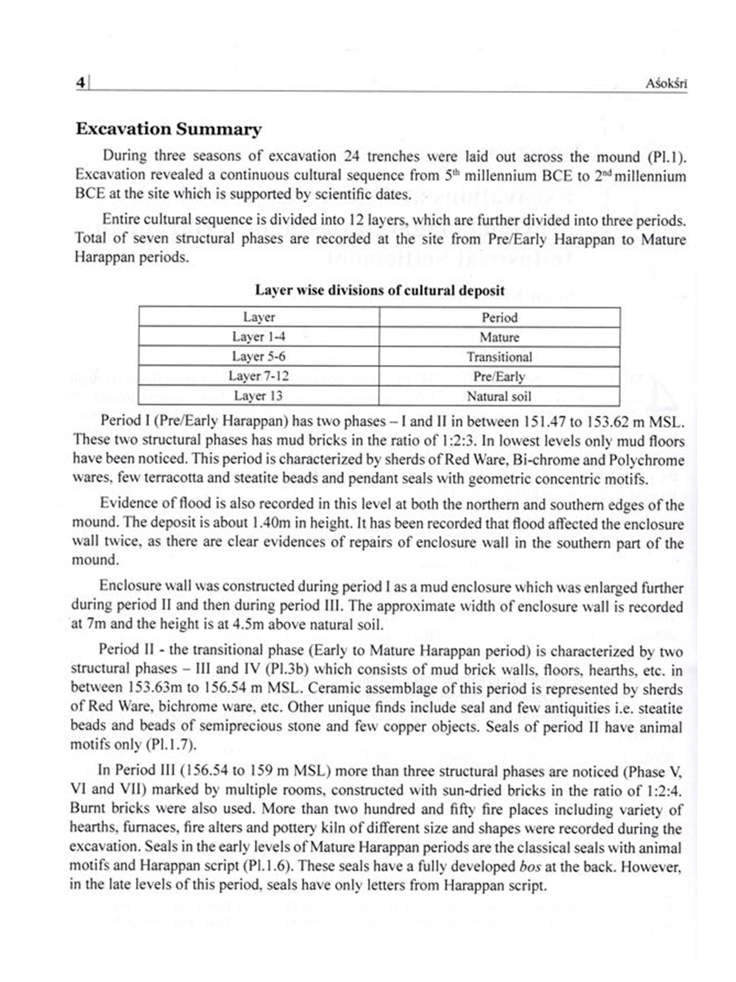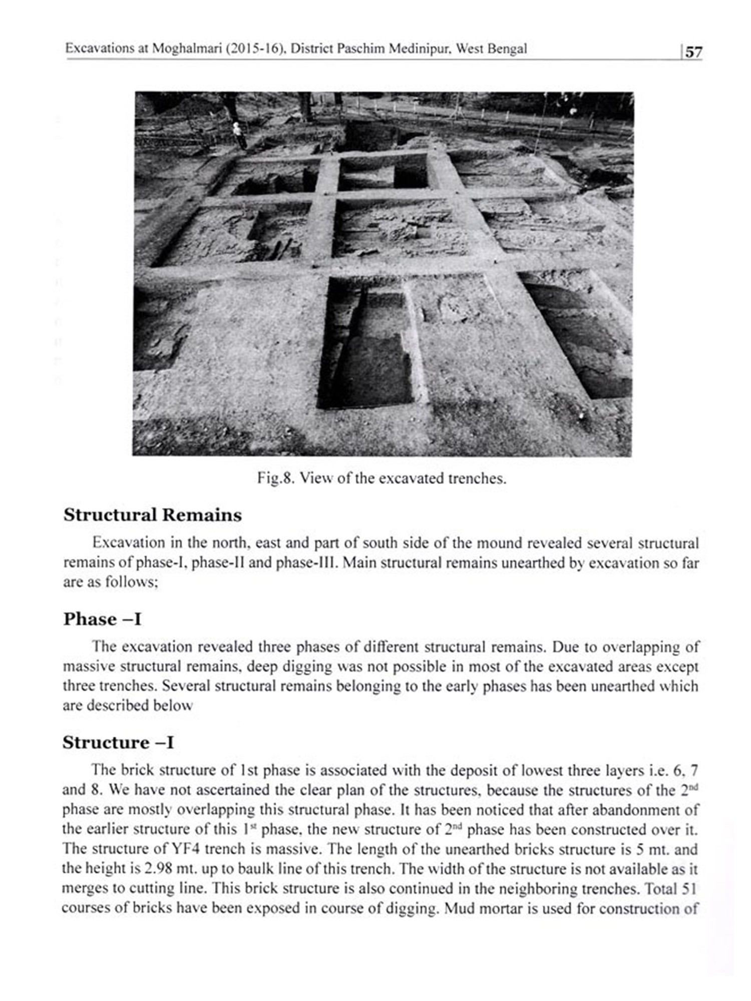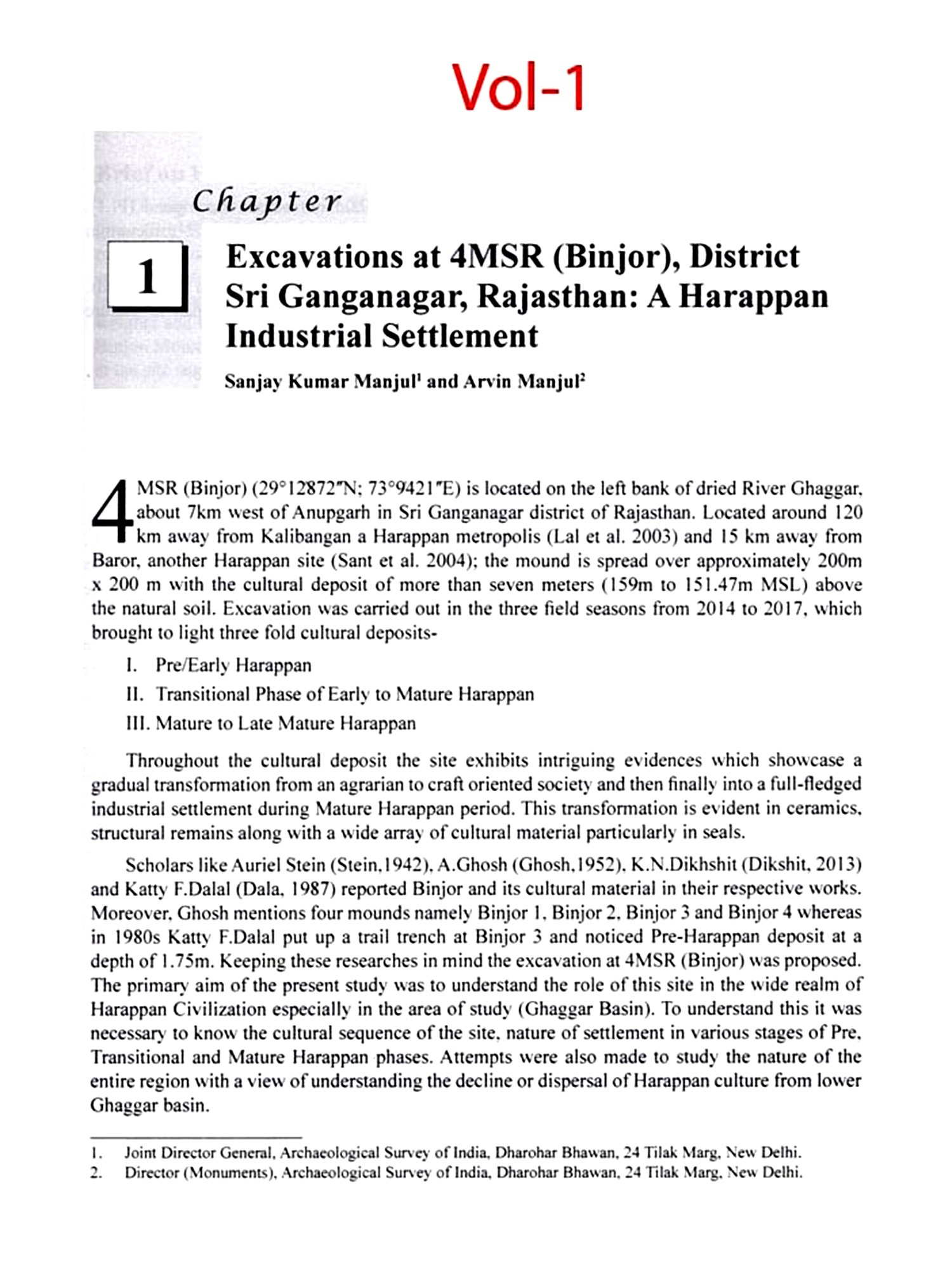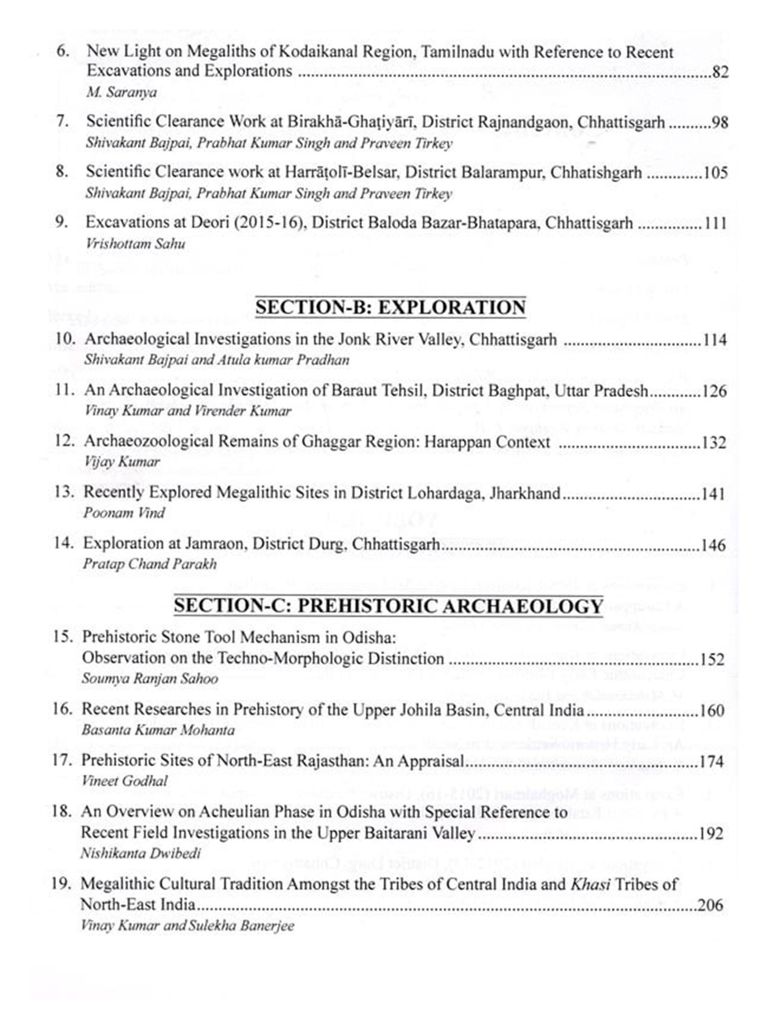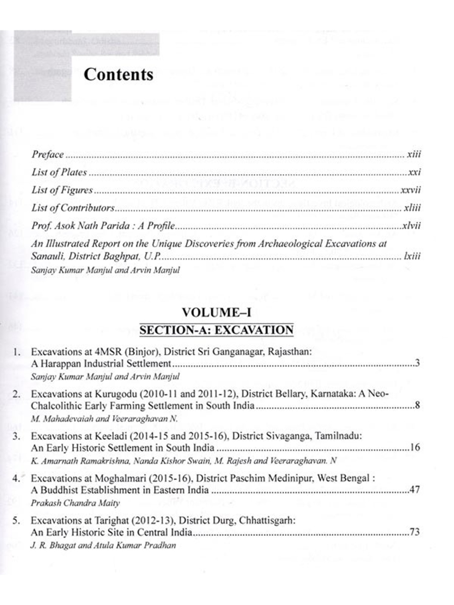 The Section-A of the volume contains nine thought-provoking comprehensive research papers on recent large scale excavations conducted in different parts of the country and contributed by the Directors of the concerned excavations and/or their team members. All these papers containing first hand primary information are in the shape of excavation reports and include different aspects of an excavated archaeological site like its location, natural setting and environment, stratification, analysis of excavated materials, antiquities, pottery, structures, reports on scientific analysis and dating, chronology and excavator's own observations. The section begins with the fascinating paper on archeological excavations at 4 MSR (Binjor), District Sri Ganganagar, Rajasthan, also contributed by Sanjay Kumar Manjul and Arvin Manjul, the excavators of the site. The paper is an outcome of their three seasons (2014 to 2017) meticulous field work at 4 MSR (Binjor) which has added new dimensions to Harappan culture. Though a rural settlement, the site was a major industrial center supporting the Harappan trade. The excavation at the site has revealed a continuous cultural sequence from 5 millennium BCE to 2nd millennium BCE, and showcases a gradual transformation from an agrarian to craft oriented society culminating in a full-fledged industrial settlement during Mature Harappan period. The scholarly paper contributed by M. Mahadevaiah, the Director of archaeological excavations at Kurugodu, District Bellary, Karnataka along with his team member N. Veeraraghavan highlights various aspects and findings of their two seasons' (2010-11 and 2011-12) field work at the site. The excavations conducted at the site has yielded a threefold cultural sequence ie., (i) Neolithic culture (c. 2200-1800 BC), (ii) Neo-Chalcolithic culture (c. 1800-1200 BC), and (iii) Iron Age culture (c. 1200-800 BC).