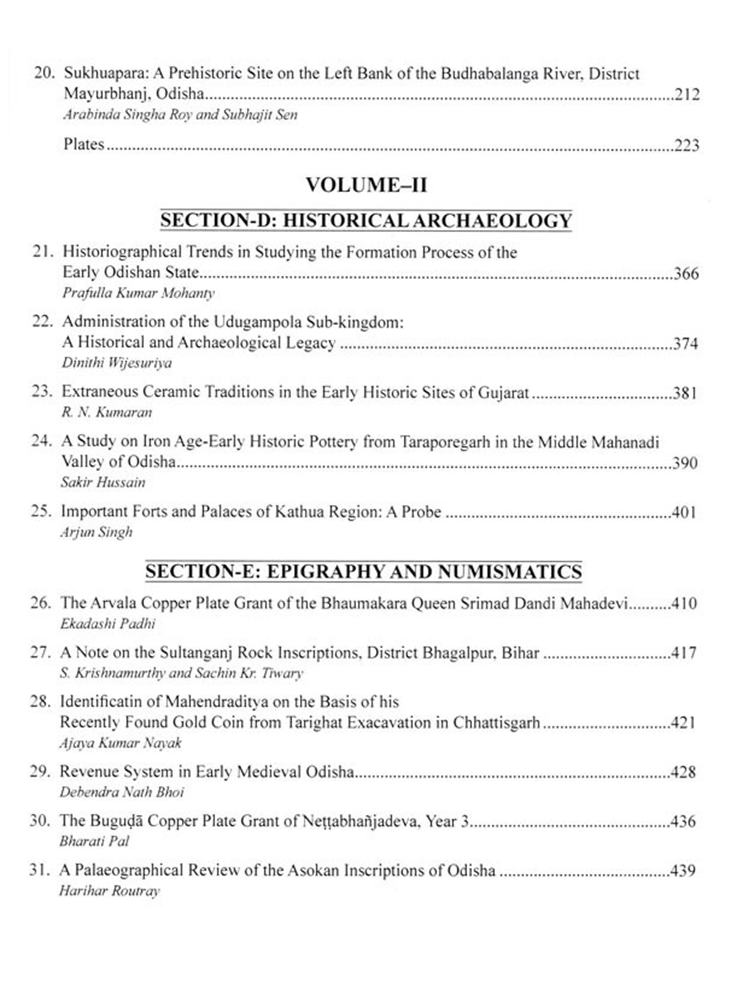 While honouring this distinguished scholar, an humble endeavour has been made in this felicitation volume to represent with research papers on the latest trends, developments and current scenario of Indian history, culture and archaeology. The volume is enriched with fifty two research papers and broadly divided into seven sections, ie, Section-A: Excavation, Section-B: Exploration: Section-C: Prehistoric Archaeology; Section-D: Historical Archaeology; Section-E: Epigraphy and Numismatics; Section-F: Art and Architecture; and Section-G: Miscellaneous. The uniqueness and main characteristic feature of this volume lies with all the articles of first three sections and some selected articles of other sections which contain first hand and basic information yielded through systematic and scientific spadework and meticulous field study undertaken by the authors which may serve as primary source materials for reconstruction of indian history and archaeology.