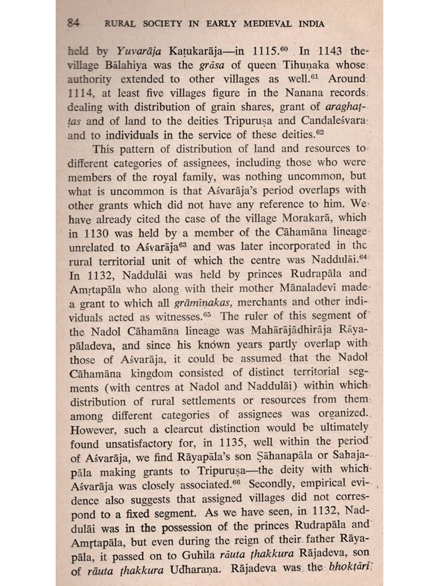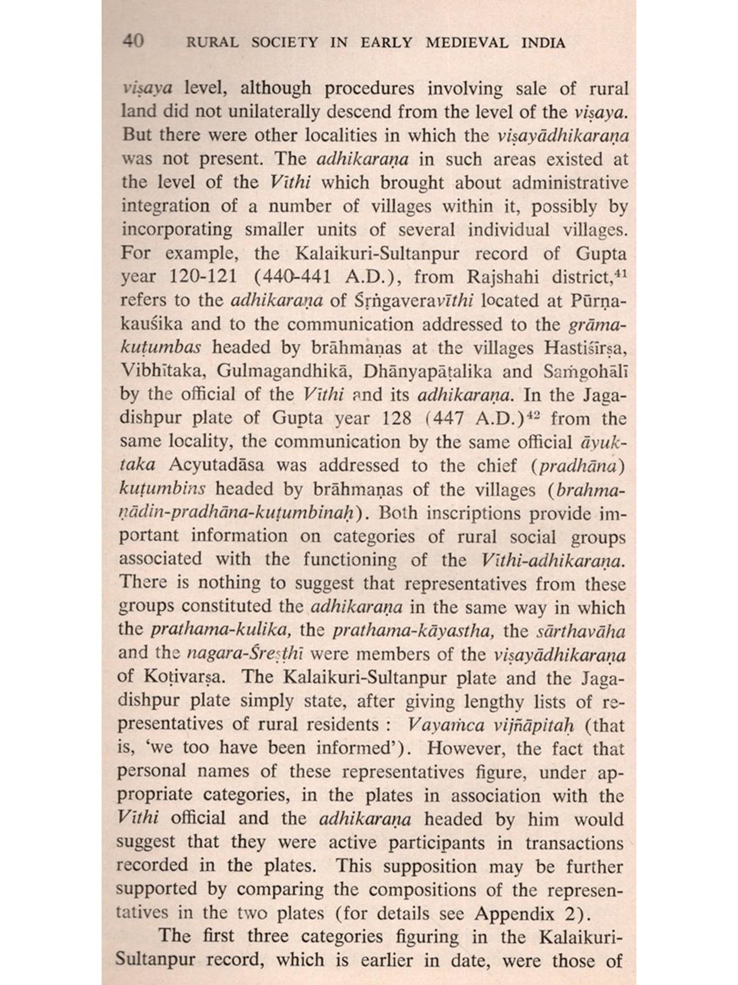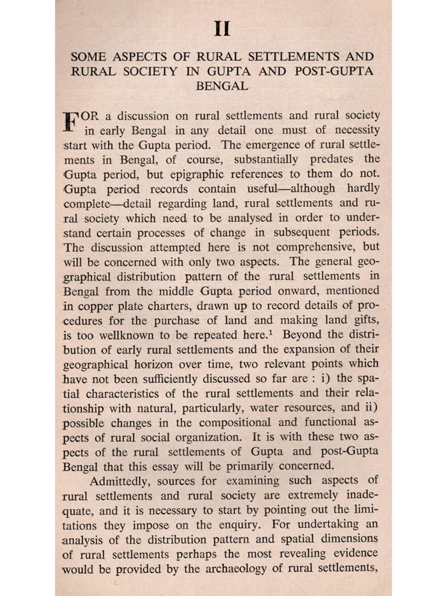 FARLY medieval India did not have a Montaillou, of rather, even if it had one, there is no way we can know about it. A document of the kind of the Fournier Register, on the basis of which Emmanuel le Roy Ladurie reconstructed the fascinating profile of a peripheral village society in medieval France, is simply unavailable for a researcher working on early medieval India. It is only perhaps towards the end of the medieval period of Indian history that documents which were concerned with certain details of rural life and which may be organized into a somewhat regular series became available for some regions. And yet, considering India's long-term agrarian history, rural settlements, in different geographical settings and of different sizes and structures, were the primary units in which human activities were socially organized. Since in these lectures I shall be concerned mainly with problems associated with studies of such units, I must first of all define the scope of my enquiry. I would like to do so by referring to sources and to historiography interminglingly.