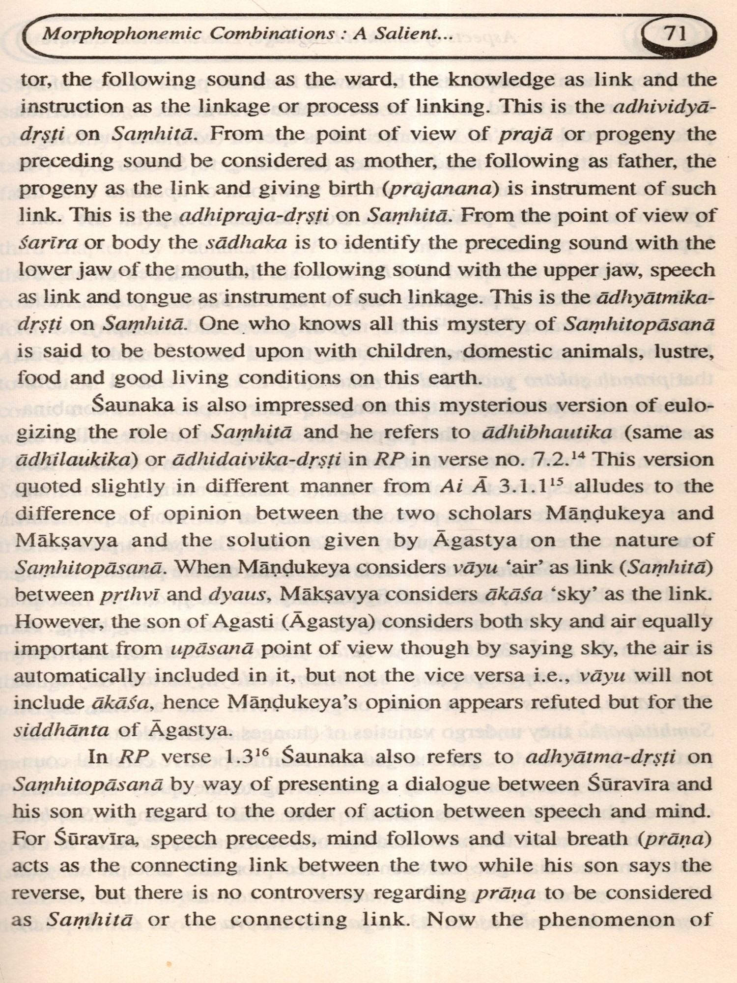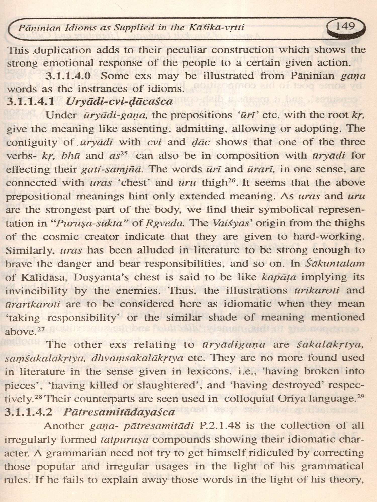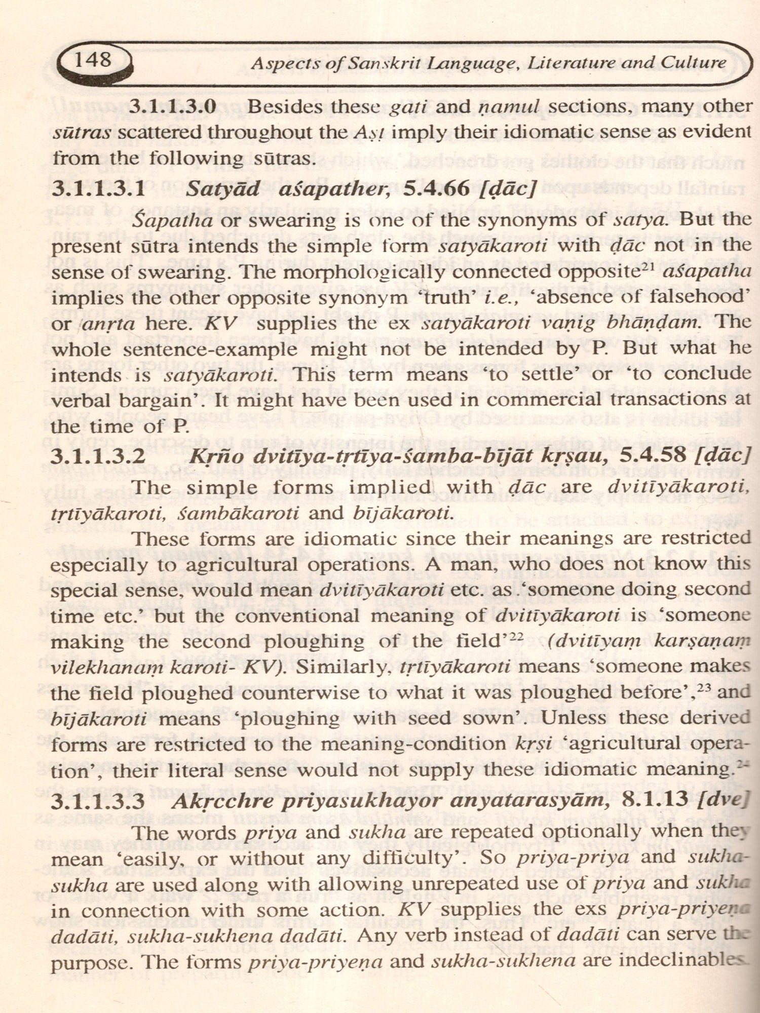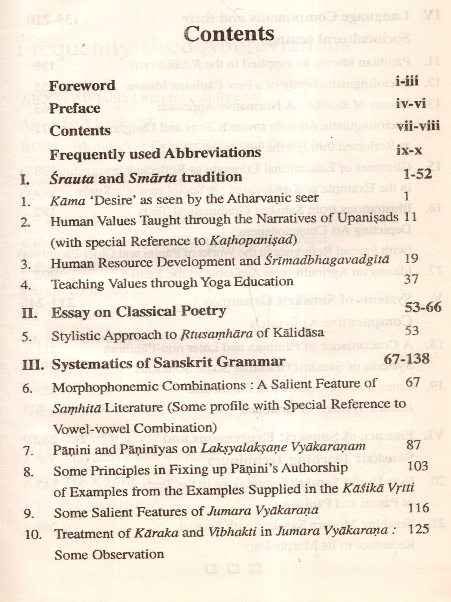In the first section, some thoughts relating to role of desire in human life, teaching and practising moral value in individual as well as social life and the most talked subject in modern times like 'Hu- man Resource Development in Srimadbhagavadgitä are put to assessment, and all these topics pertain to Vedic, Yogic and Epic literatures respectively. The second section comprising the only paper on stylistic study of Kalidasa's maiden creation, the Riusamhära statistically evaluate the success of Kalidasa as a poet. The third section contains five papers depicting some aspects of the descriptive techniques mainly of trimuni-vyakaraņa and another non-Paninian system famous as Jumara-vyakarana. The fourth section is the biggest one and contains seven papers on language components and their socio-cultural settings. The message of all the papers in this section is that the Sanskrit was a spoken medium of the people of this country sometimes because all these idioms collected from the source of trimuni-grammar present testimony of lively Sanskrit usages which are meaningful and structurally viable only in spoken form of the language. Such expressions also speak out their regular status of being norms of usage in the society in certain thematic areas like education, family relation as parents and children, artistic sensibility of the people, agriculture and so on. The fifth section comprising two papers attempts to compare Paninian and non-Paninian Systems of Sanskrit grammar. In one of them, problems of preparing a concordance of Paninian and twelve other non-Paninian systems and possible solutions thereof have been suggested. And the other one attempts a case study of comparison of semantic vocabulary between Paninian and Jumara-system of grammar as a beginning step of the preparation of the said concordance. The sixth and the last section deals with some useful Sanskrit expressions collected from the source of Kasika.