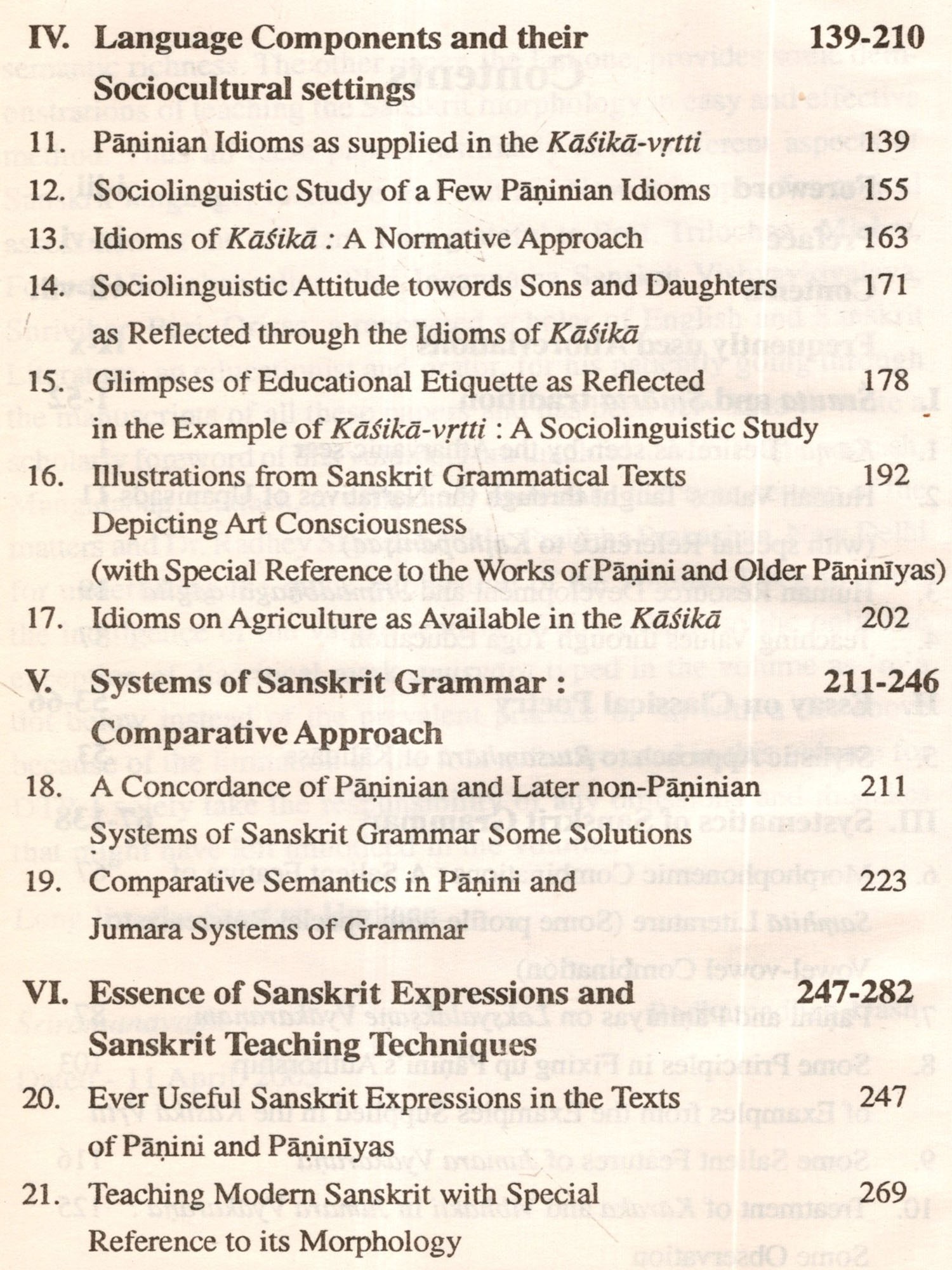The papers under sections III-V are on Sanskrit grammar studied from different angles. Section III contains paper on Systematics of Sanskrit Grammar. Systematics implies the study of the various components as they combine to form the system. Under this Section the author analyses the language elements and discusses the descriptive techniques adopted by the pre-Paninian, Paninian and the non-Paninian grammarians.