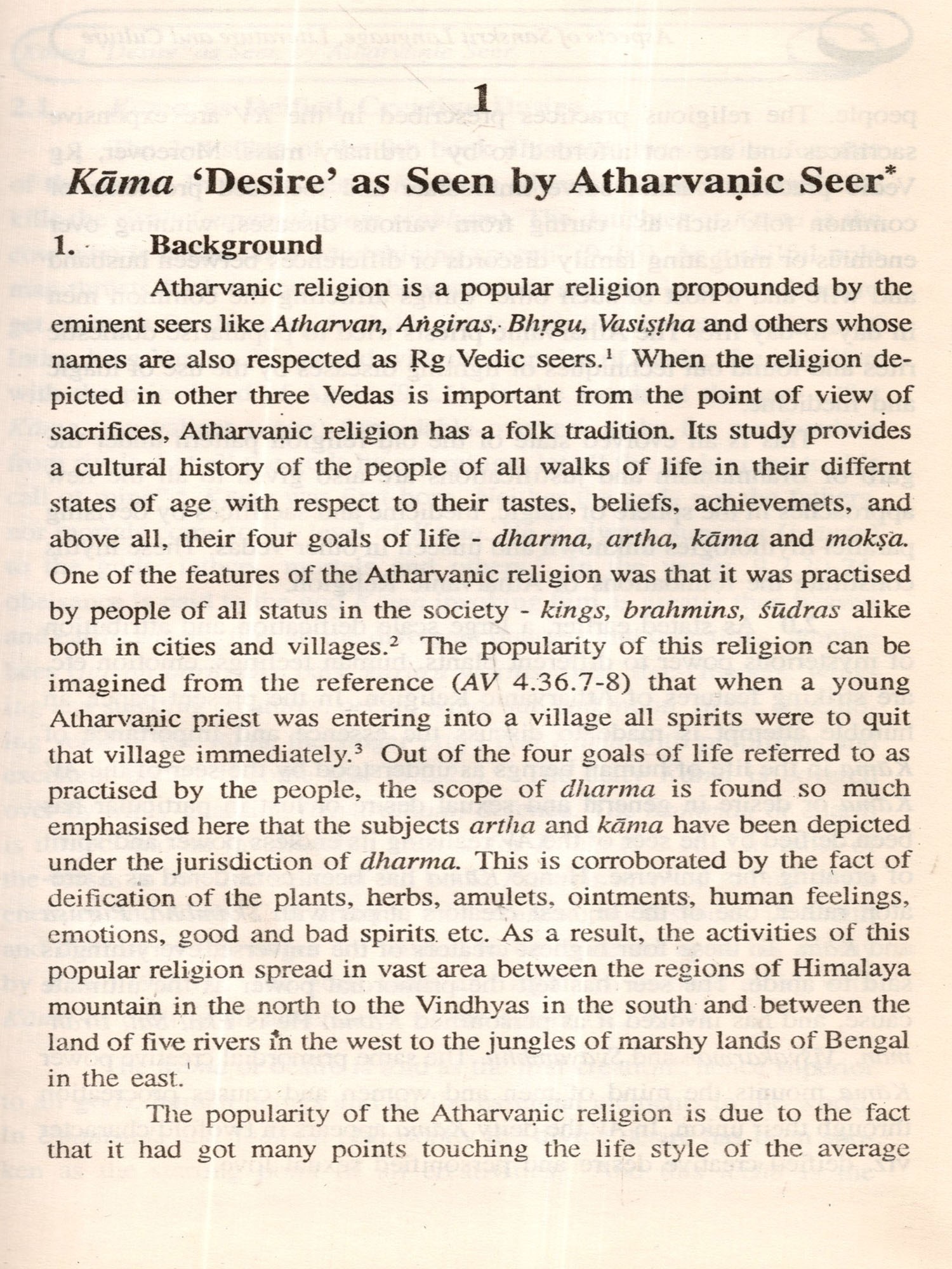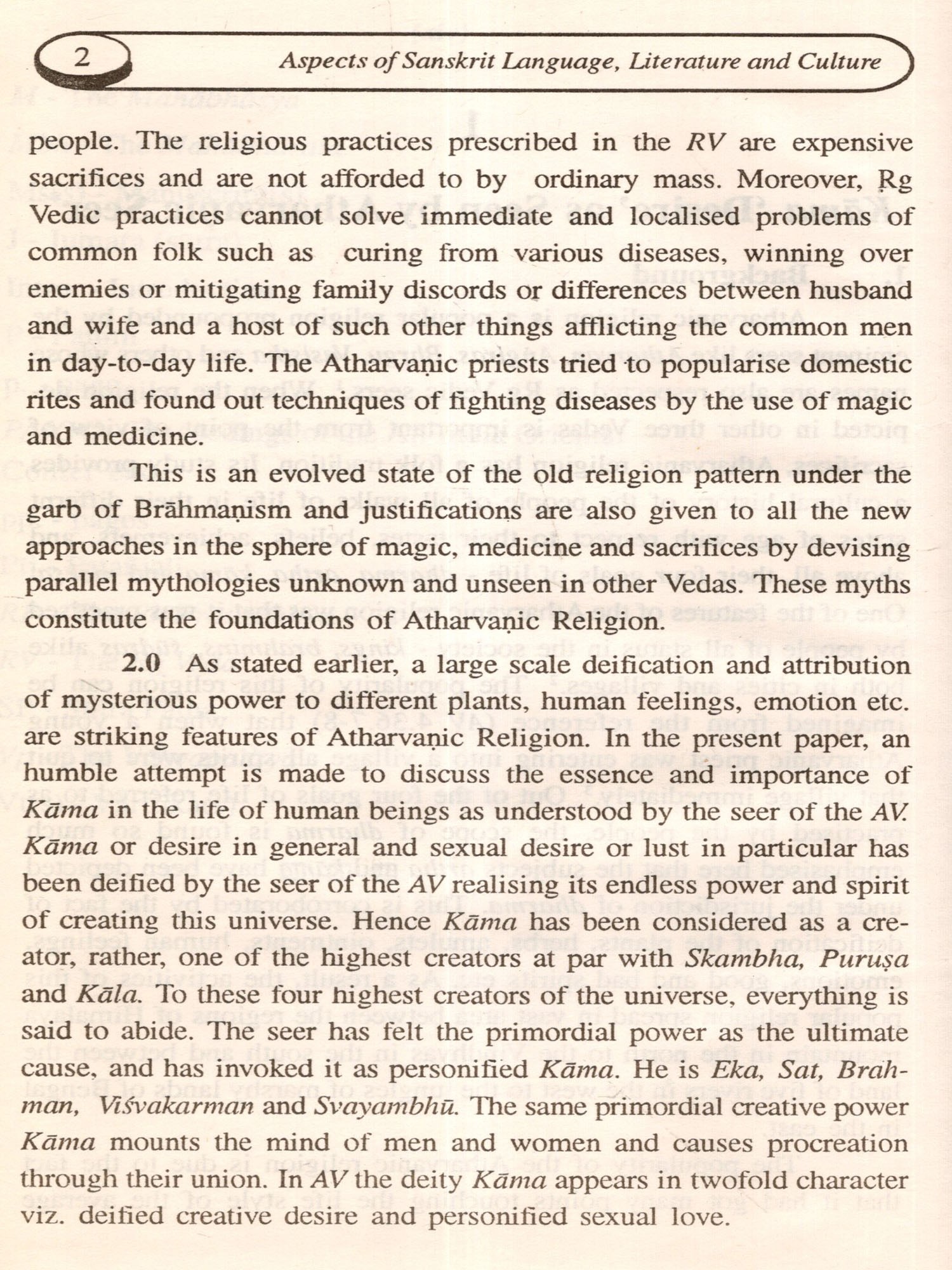 The opening section dealing with the Vedic and Sastric (Srauta and Smarta) tradition outlines worldly life (Lokayatra) lived under ideal conditions. While the theme for the foundation of this life is taken from Atharva Veda, (and rightly so, for Atharvanic religion relates to the life-style of the average people), the other themes of human values, competency acquisition along with capability development and character building discussed in the three other papers of this section are collected from Upanisadic narratives, Bhagavadgita and Patanjala Yogadarśana respectively. As seen by the Atharvanic seer, the nucleus of domestic life is Kama or desire including sexual love. Desire, though not substantial like dharma or ultimate like moksa, is vital among the purusartha-s, at least for wordly life. In fact, it is the sex-based man-woman nexus that accounts for the harmony and happiness of the family. The paper is of great relevance to modern society; for otherwise, the family tree with its root forgotten in quest of the fruit and flower is likely to wither and die.