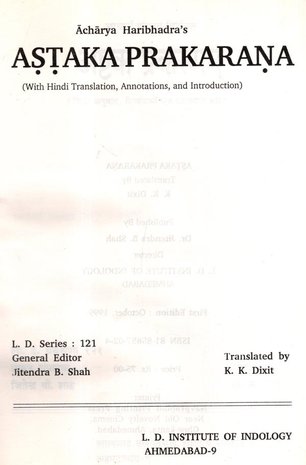 With deep delight, we publish the Astaka-prakarana of the great Haribhadrasuri (active c. A. D. 745-785). This work presents a profound discussion on the 32 different topics of Jainism and treats its principles in considerable detail. The author moots very important issues in the background of these principles and puts forth their logical answers from the Jainistic perspective. The publication is thus of far-reaching significance. Over two decades ago, this work was translated in Hindi by late Dr. Krishna Kumar Dixit. The earlier unpublished translation is now published here together with the original Sanskrit text. It is indeed a matter of profound regret that Dr. Dixit is no longer with us. It is hoped that this book will be useful to the students of Jainism.