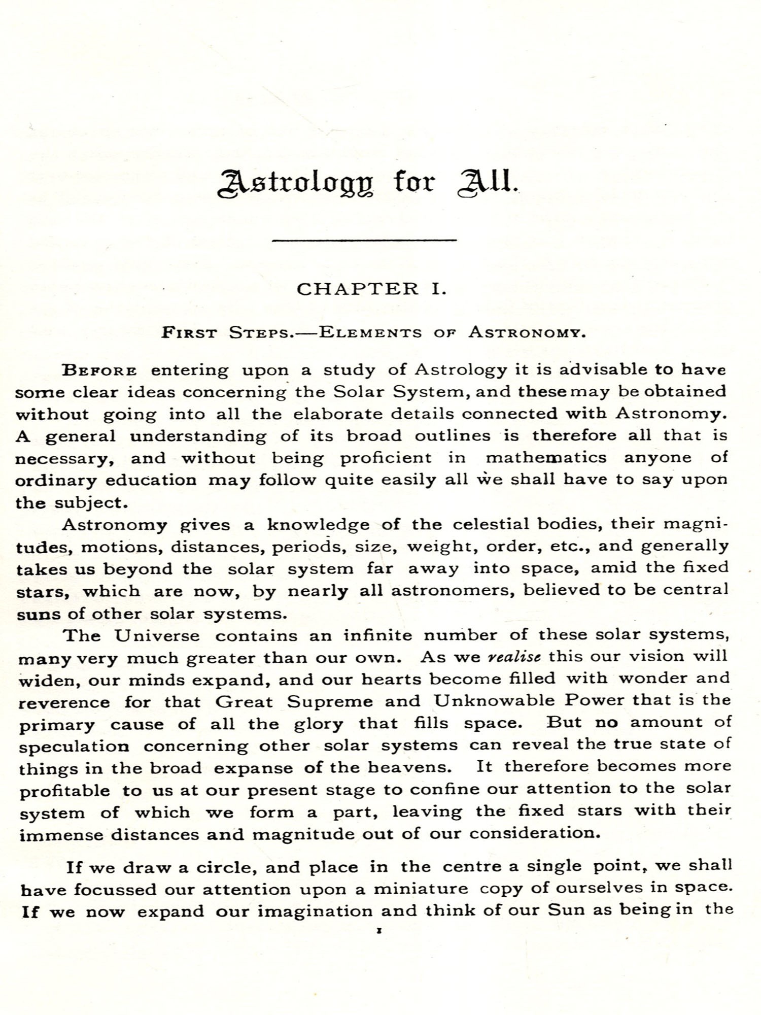 ASTROLOGY is the oldest of all sciences. Its history can be traced so far into the past that it becomes a hopeless task to actually discover when and where it had its origin. From Babylonia and Chaldea we find a belief in Astrology spreading throughout the whole world. Once the religion of a great and mighty race, it taught its people to lift their aspirations by faith, hope, and reverence, through the planetary spirits to the Logos of our solar system, the One Supreme and Universal Self.