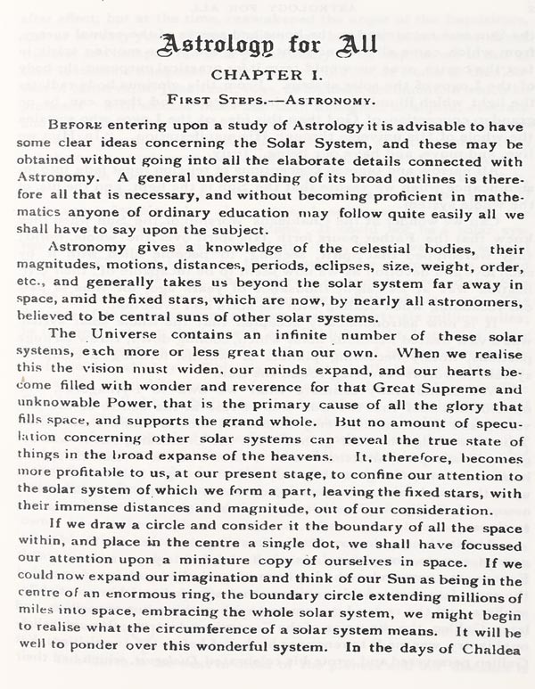 The day is past for writing a defence of Astrology, and no amount of argument will ever convince the sceptic, who is either too perverse or too indolent to investigate so grand a science as Astrology, a science which explains the law that governs all things. The best test that can be applied to this, as to all other subjects where first hand knowledge is required, is that of experience.