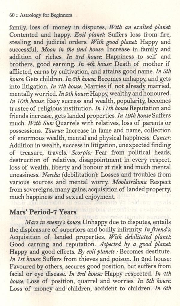 In this book Astrology for Beginners I wish to tell something by way of introduction, about Astrology a subject to confess to an interest in which is to evoke smiles of condescension from otherwise intelligent people and run the risk of being considered an eccentric. The reader is requested to go through this introduction carefully as it enables him to appreciate what Astrology is and how it is different from the so-called occultism so often mixed up with the science of divination. Is Astrology a science? Does it deserve to be ranked among other subjects which have received the stamp of the modern scientist? Many causes have contributed to the degeneration of Astrology. Firstly, there is the impenetrable prejudice which characterises the majority of the educated public who sneer at Astrology as mere superstition and excuse themselves from any investigation of its claims on the ground that some modern scientists reject it; secondly, the springing up of a large number of quacks charging rupee one per horoscope and playing on the credulity of the masses; and thirdly, the narrow-mindedness of many of the scientists which has been greatly responsible for the present degradation of Astrology. No man is entitled to pronounce an opinion on the merits of any science unless he has devoted much time to its study and investigation.