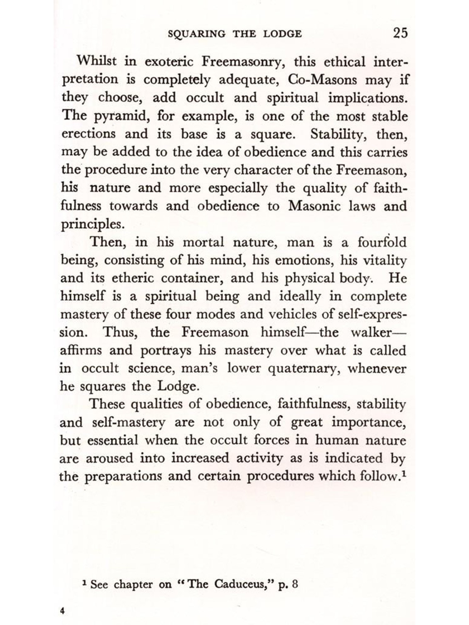 I WISH to express my deep gratitude to the late M.P.G.C. of the Eastern Federation, The V. Ills. Bro. N. Sri Ram, 33°, for his acceptance of, and arrangement for, the publication of these studies in Co-Freemasonry. As I do so, I wish to acknowledge my indebtedness to the valuable literary and personal contributions which the late V. Ills. Bro. C. W. Leadbeater, 33°, made towards an understanding of the esoteric significance and impor-tance of Freemasonry. For such knowledge as I may have gained, I owe much to his two books Glimpses of Masonic History and The Hidden Life in Freemasonry. Many other notable brethren have made important contributions in this field by means of addresses and articles in Masonic journals. My deep appreciation is offered to them and to the late Ills. Bro. John Hitch-cock, 32°, and his wife Cathy Hitchcock, 32°, Milwaukee, Wisconsin, U.S.A., who have made possible the printing of my studies in Co-Freemasonry. I also wish to thank Mrs. Jane Evans for her cover design; also The V. Ills. Bro. Radha Burnier, 33°, and the Ills. Bro. Seetha Neelakantan, 32°, for seeing it through the press. The ideas advanced are to be regarded solely as the thoughts of a student and in no sense as Landmarks. They are founded upon a belief that Freemasonry, including Co-Freemasonry therefore, is indeed a survival of the Ancient Mysteries.¹ THE HASTENED PATHWAY TO PERFECTED MANHOOD AND WOMANHOOD In Freemasonry, the goal of human evolution is defined as the attainment of perfected manhood or Adeptship. Human life consisted, it was taught, of a process of perpetual unfoldment through stage after stage of development-degree after degree in Masonic language through primitive man candidate, through civilized man or E.A., to benefactor and servant of the race or F.C., then to the spiritually self-illumined man or M.M., and on to Superman or perfected Master Builder. Beyond this achievement other heights beckon, the term "perfect" being relative and referring only to purely human development to perfect manhood or womanhood. This procedure of Nature may be inferred from two Masonic symbols. In one of these, a primitive man is represented as a stone newly hewn from a quarry-Universal Life. This stone is then to be shaped into a cube but with surfaces which are still rough the rough ashlar of Freemasonry. Ultimately, this is worked by the stone-mason into a smooth ashlar, ready to be fitted into its duly appointed place within the building. The other symbol of human evolution is the ladder of Masonic progress, which is to be ascended rung by rung or degree by degree leading from earth up into the infinite star-strewn canopy of heaven, referring to entry into Sun-Consciousness or realized union with the G.A.O.T.U. or Solar Logos.
