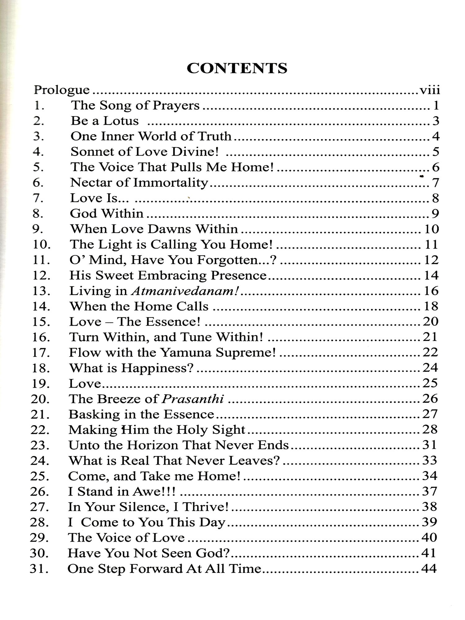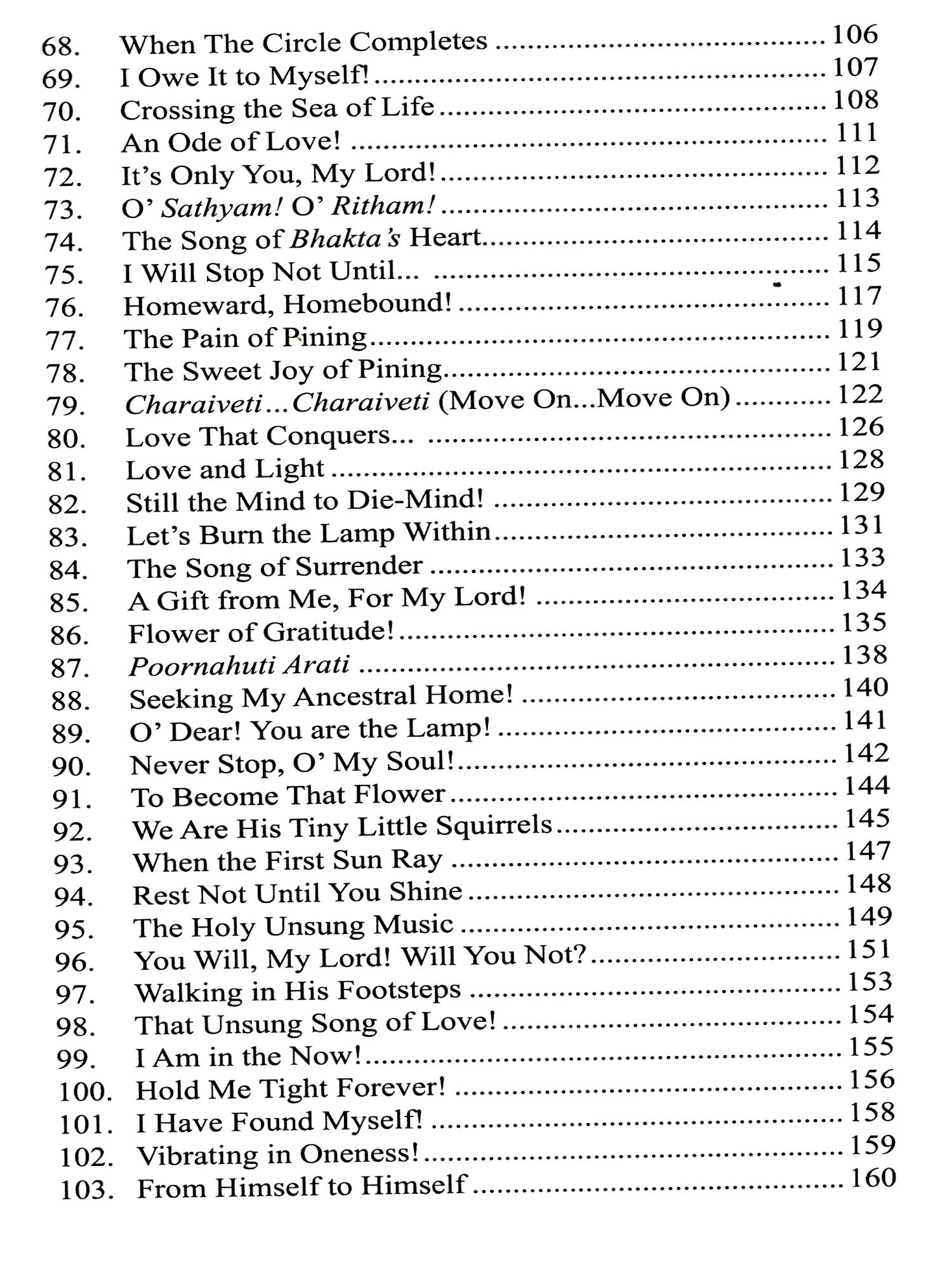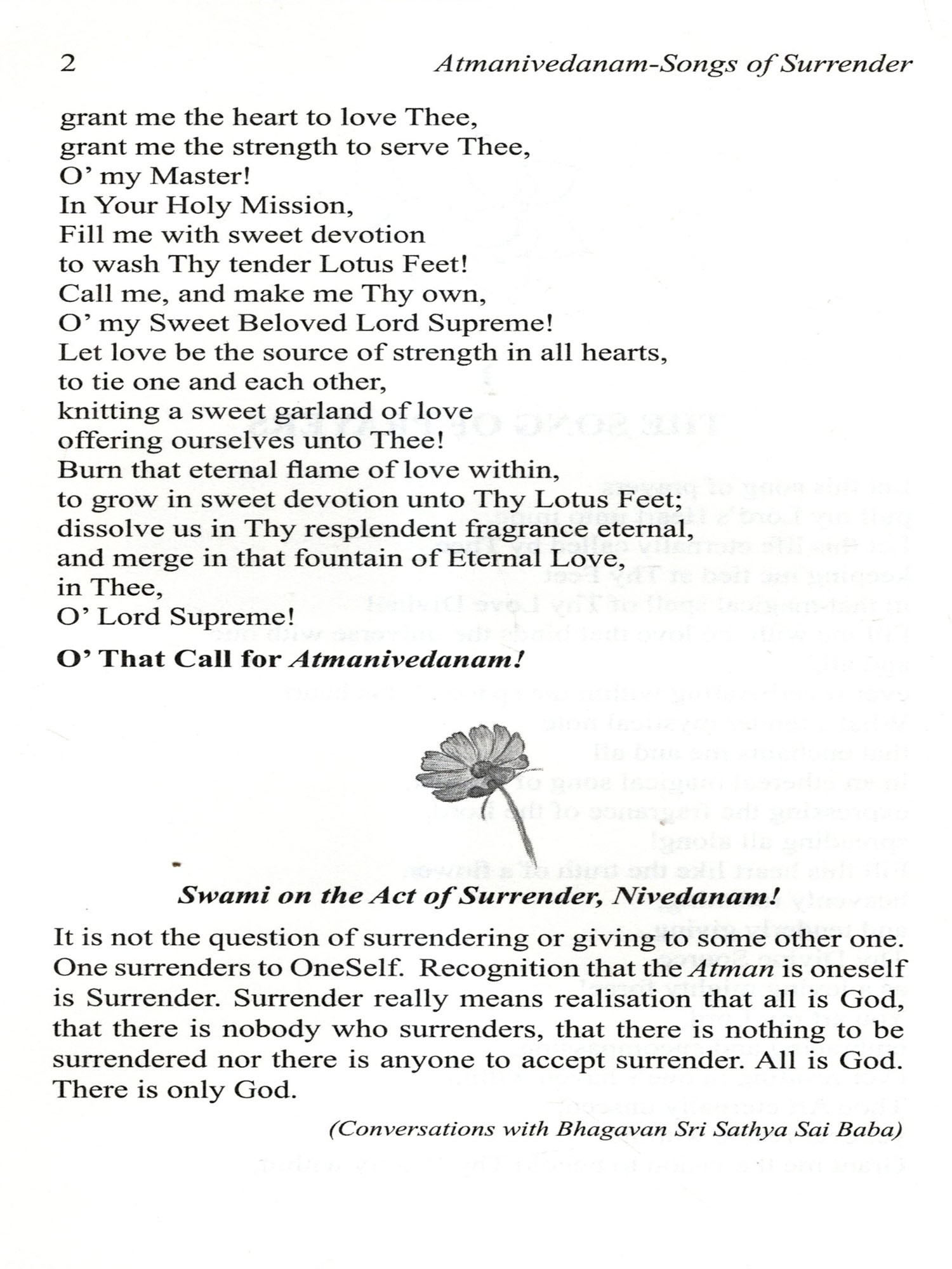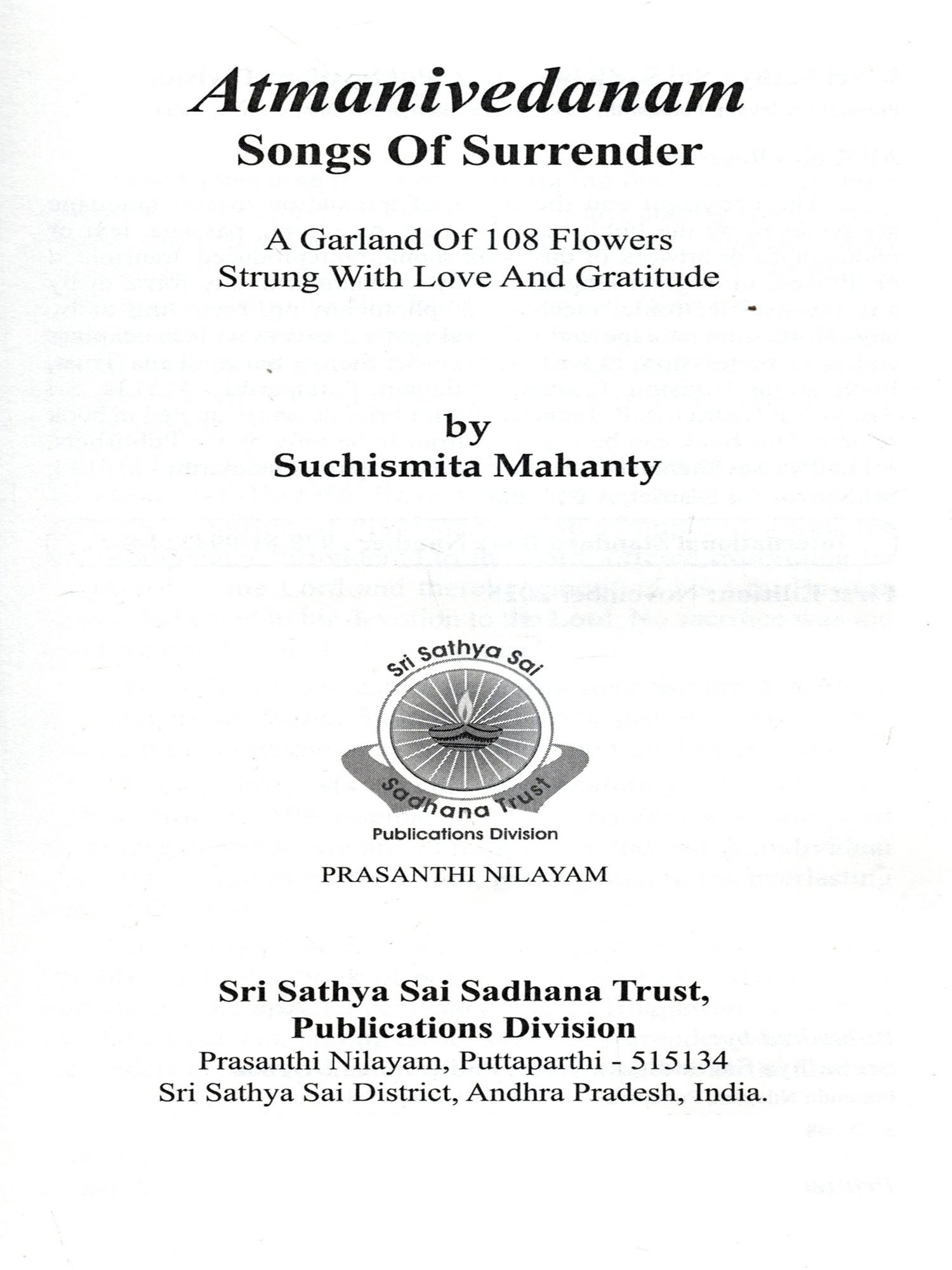 "The power lies in surrender, in the Song of Surrender alone. When the heart receives that power within, it can develop the strength from the ocean within." With His grace, this loving garland is offered at my beloved Lord's Lotus Feet as a loving offering on beloved Bhagawan's 100th Birthday. With love and mercy, He has granted the title 'Atmanivedanam-Songs of Surrender'. The title was granted by Him and along with it, these flowers from the heart received His eternal strength, courage, grace, and blessings endlessly to decorate and string it with love and gratitude.