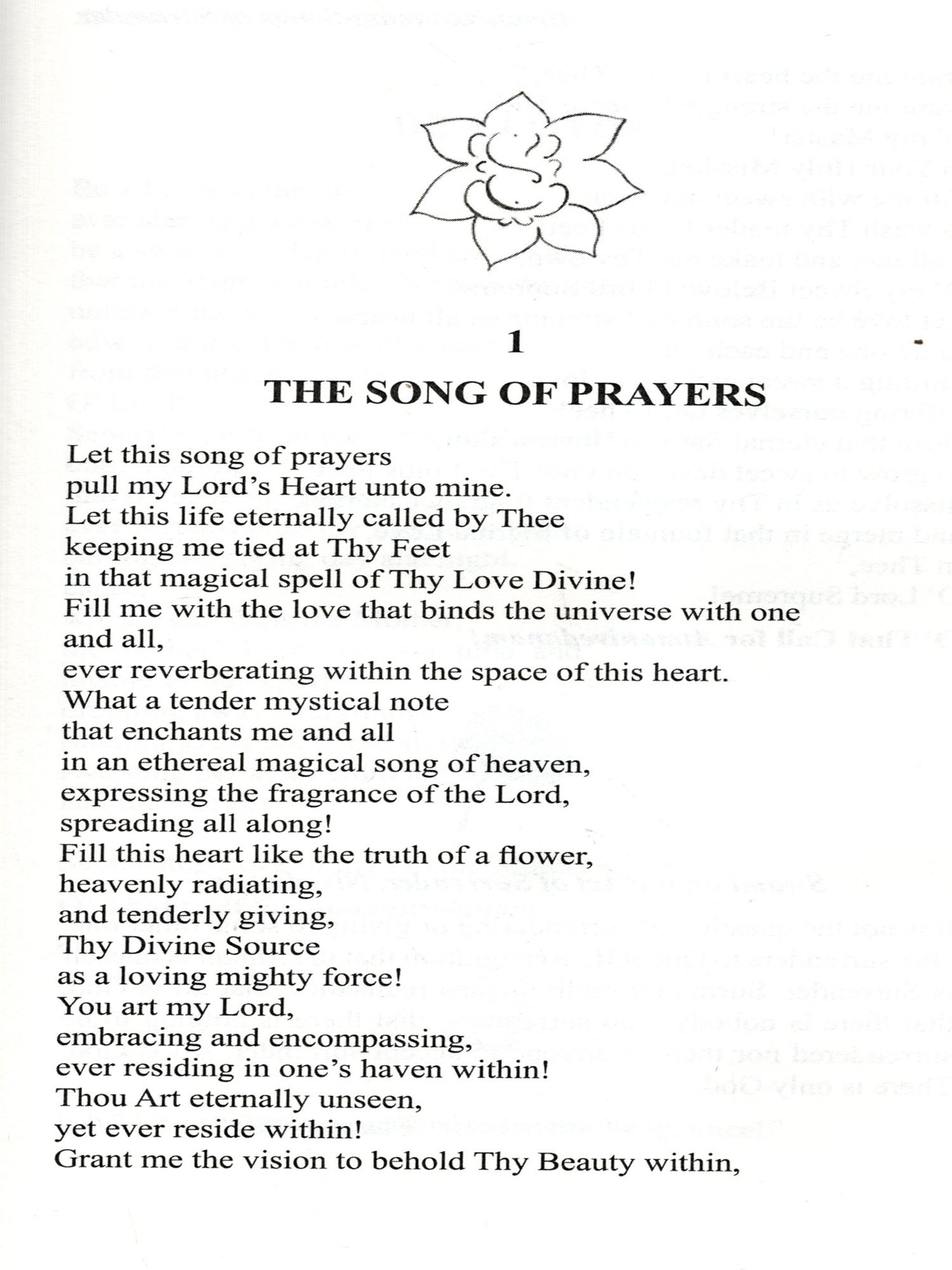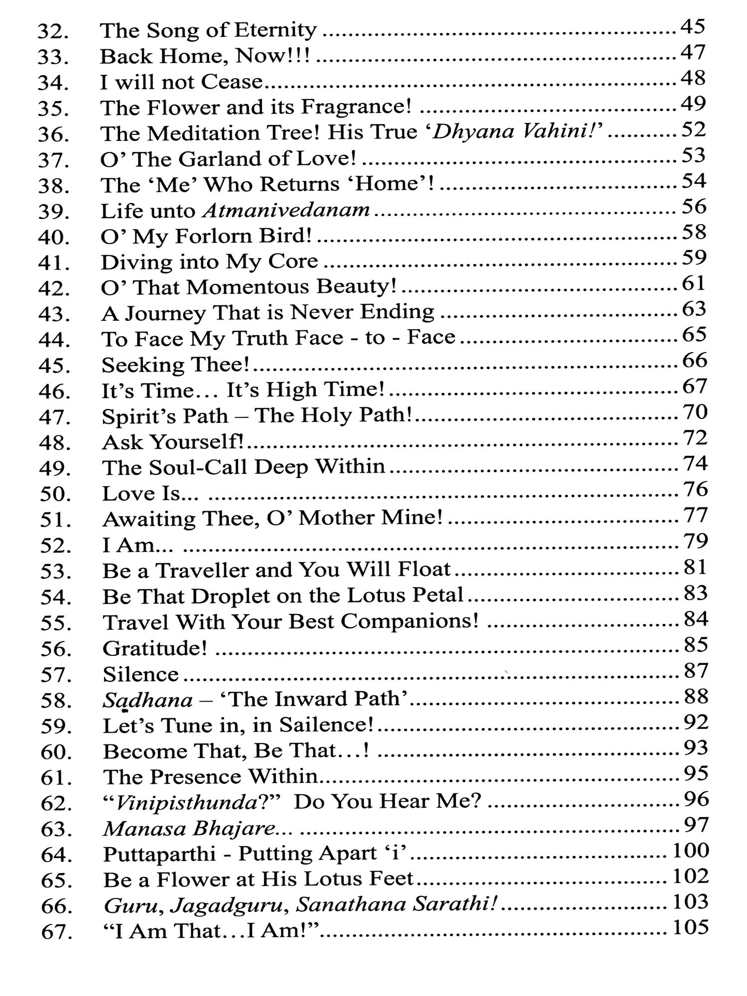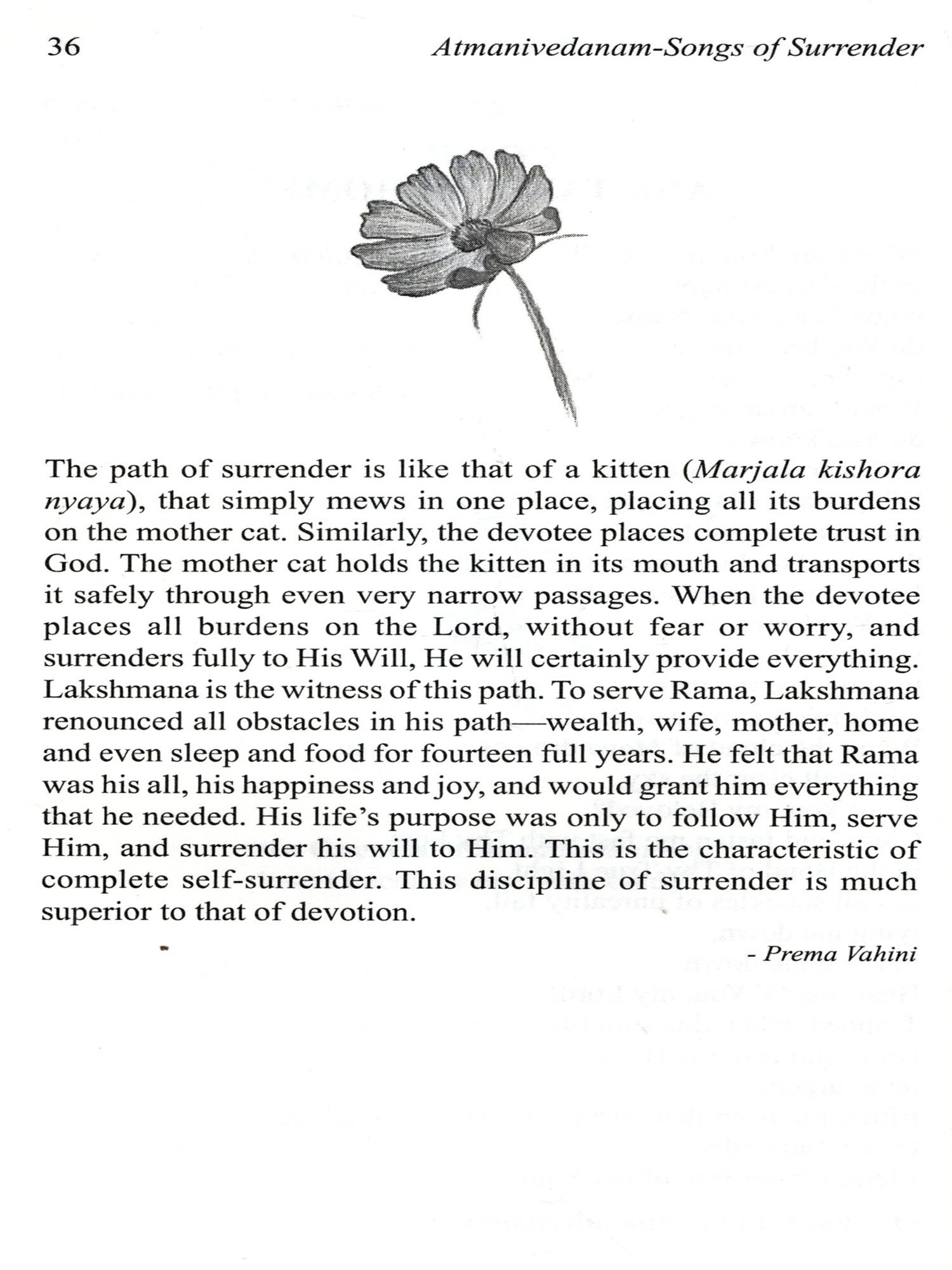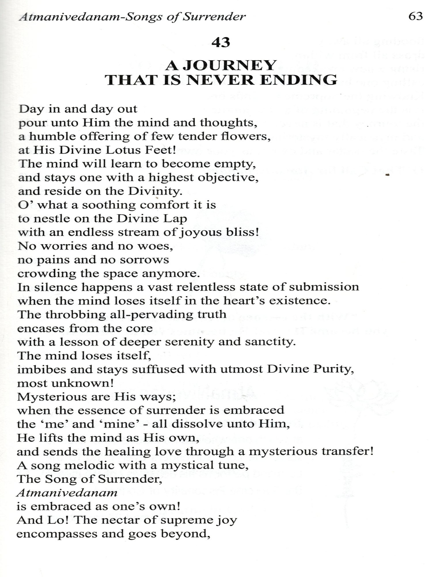 "The power lies in surrender, in the Song of Surrender alone. When the heart receives that power within, it can develop the strength from the ocean within." With His grace, this loving garland is offered at my beloved Lord's Lotus Feet as a loving offering on beloved Bhagawan's 100th Birthday. With love and mercy, He has granted the title 'Atmanivedanam-Songs of Surrender'. The title was granted by Him and along with it, these flowers from the heart received His eternal strength, courage, grace, and blessings endlessly to decorate and string it with love and gratitude.