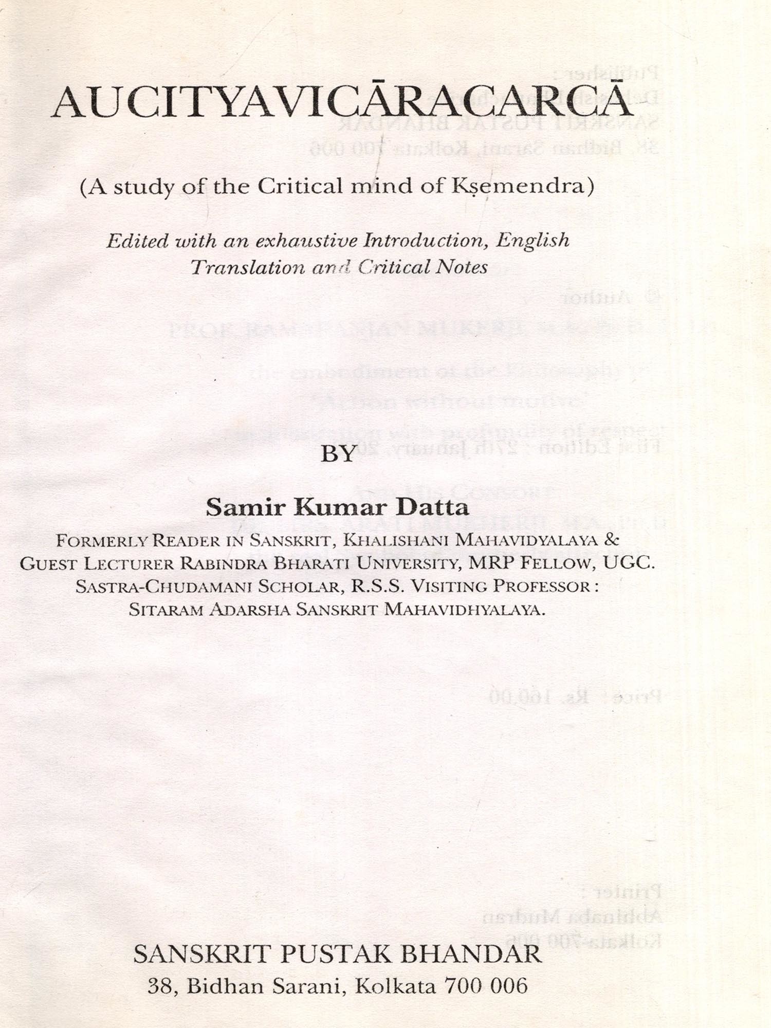 Aucityavicaracarca: A Study of the Critical Mind of Ksemendra (An Old and Rare Book: Only 1 Quantity Available)